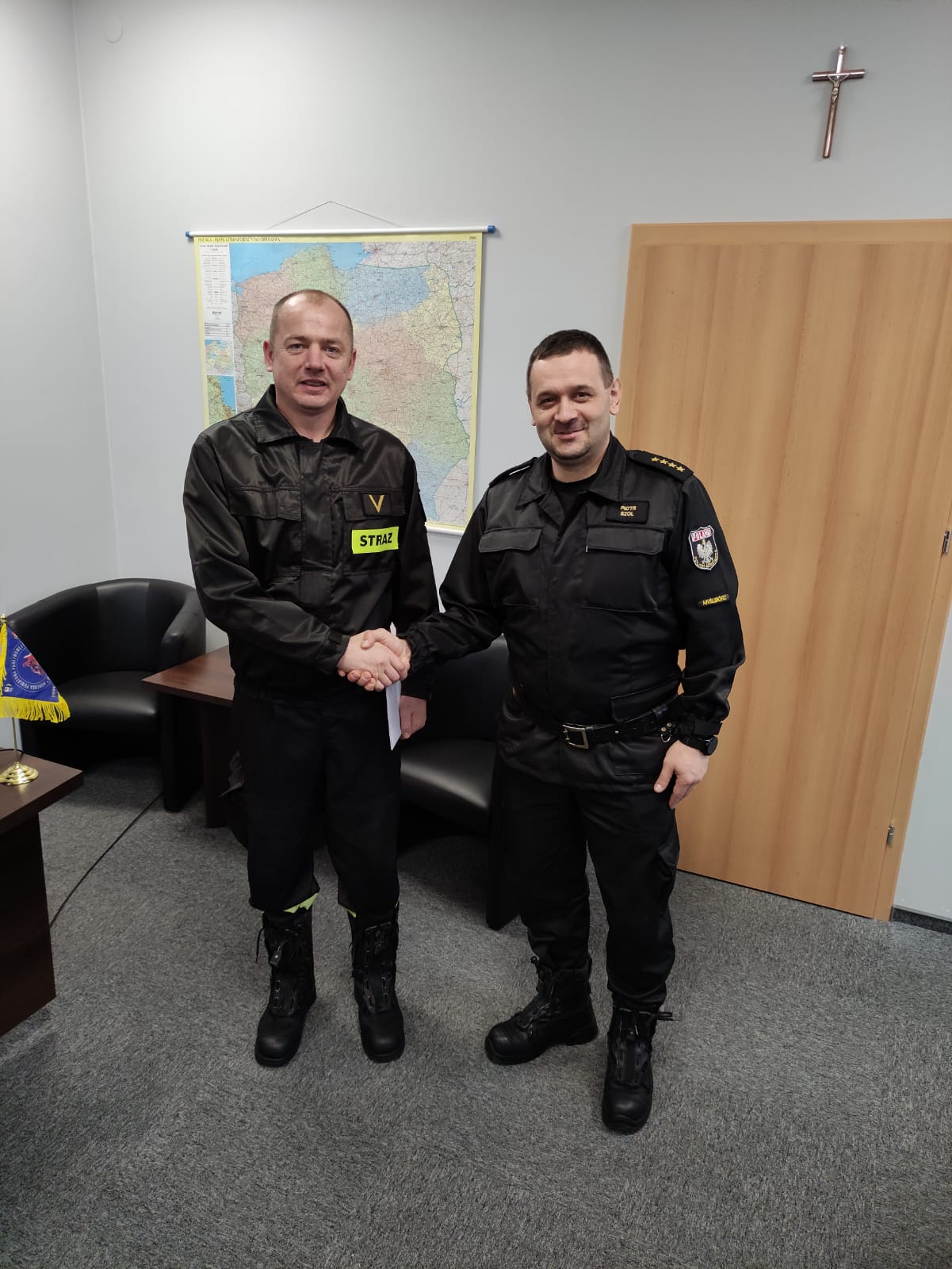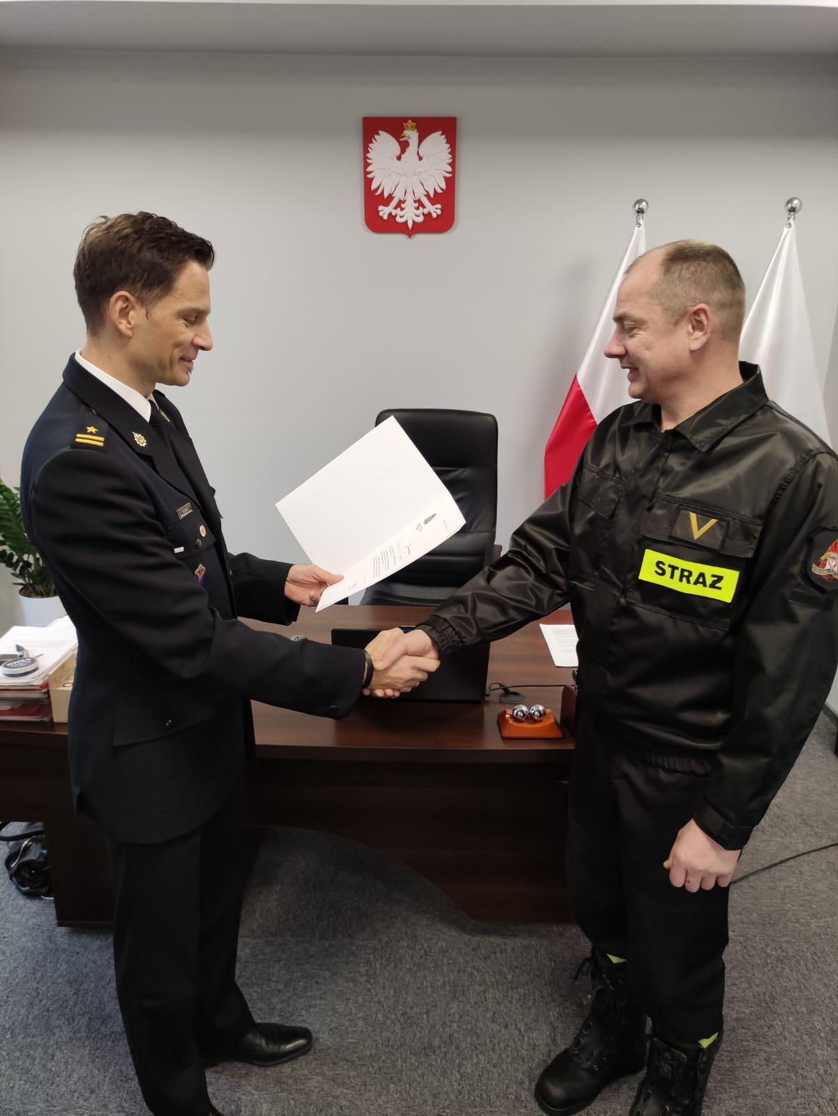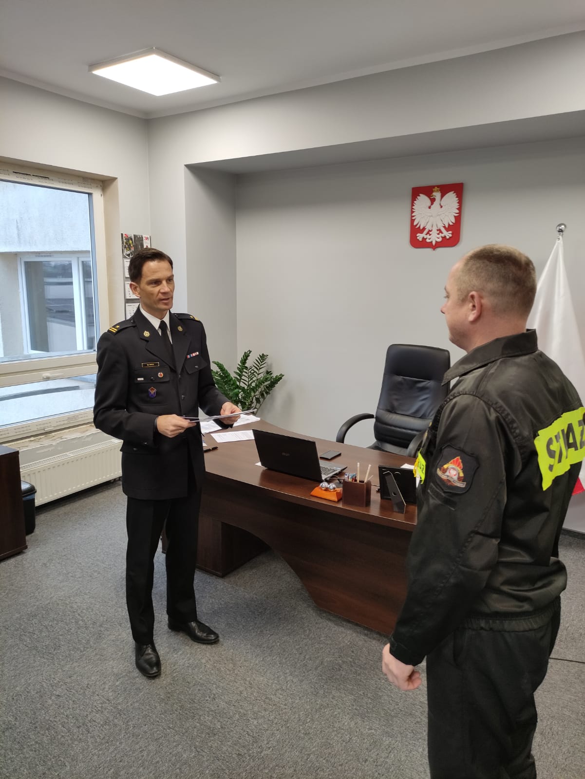4 stycznia 2022 r. Komendant Powiatowy PSP w Myśliborzu - mł. bryg. Maciej Iwko wraz z Dowódcą JRG w Myśliborzu - st. kpt. Piotrem Szolem pogratulowali ogn. Wojeciechowi Ogiejko jubileuszu 20-lecia pracy i służby w szeregach Państwowej Straży Pożarnej.