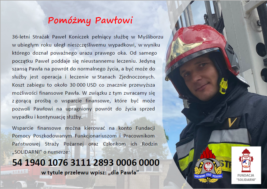 Zwracamy się z uprzejmą prośbą o okazanie wsparcia poprzez włączenie się do zbiórki na rzecz leczenia funkcjonariusza Komendy Powiatowej Państwowej Straży Pożarnej w Myśliborzu ogn. Pawła Koniczka na co dzień pełniącego służbę w Jednostce Ratowniczo-Gaśniczej.