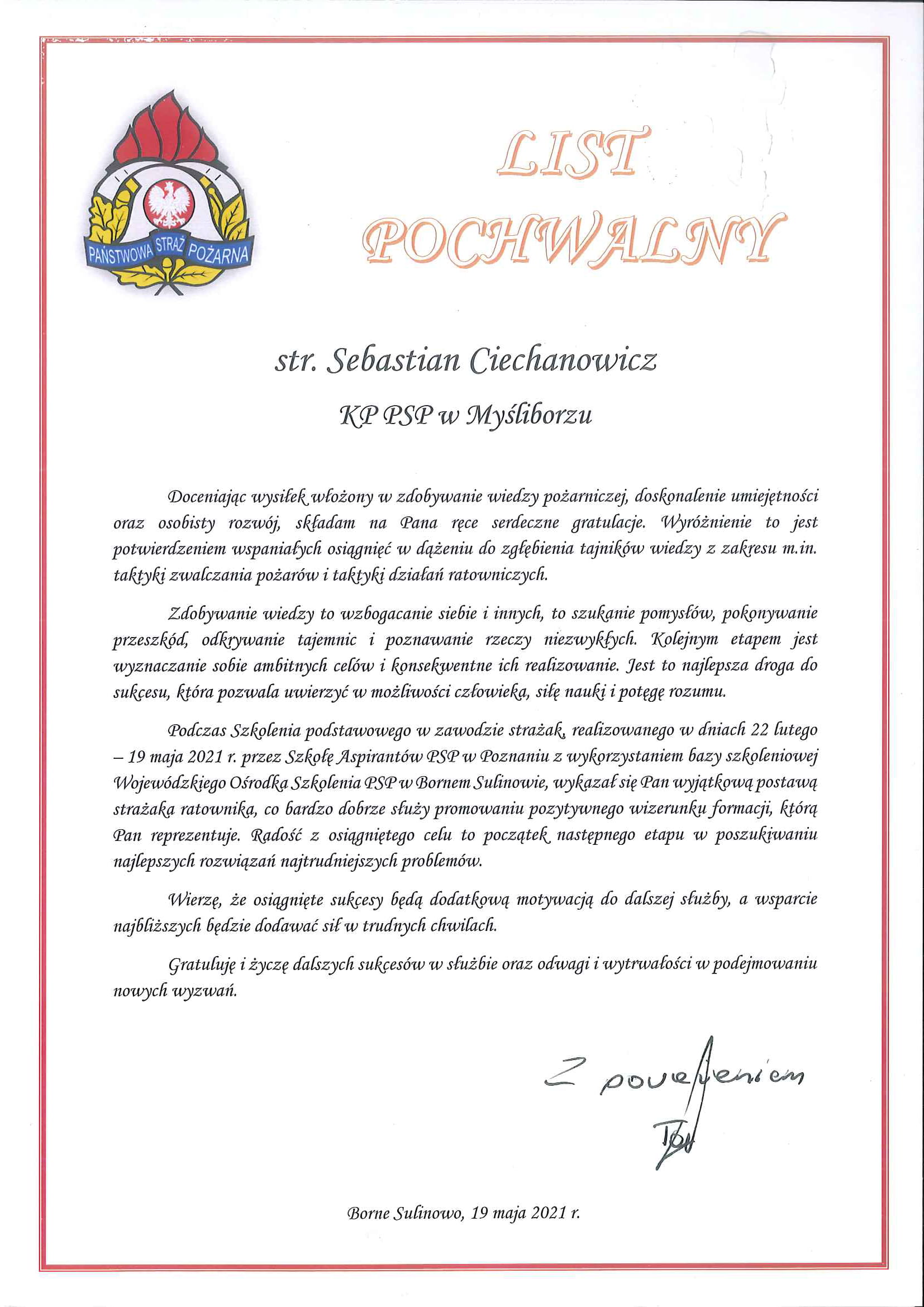 Świeżo upieczony funkcjonariusz otrzymał list pochwalny od Zachodniopomorskiego Komendanta Wojewódzkiego PSP za wzorową postawę oraz bardzo dobre wyniki w nauce. Podczas zmiany służby, gratulacje Panu Sebastianowi złożyli także Komendant Powiatowy PSP w Myśliborzu oraz Dowódca JRG.