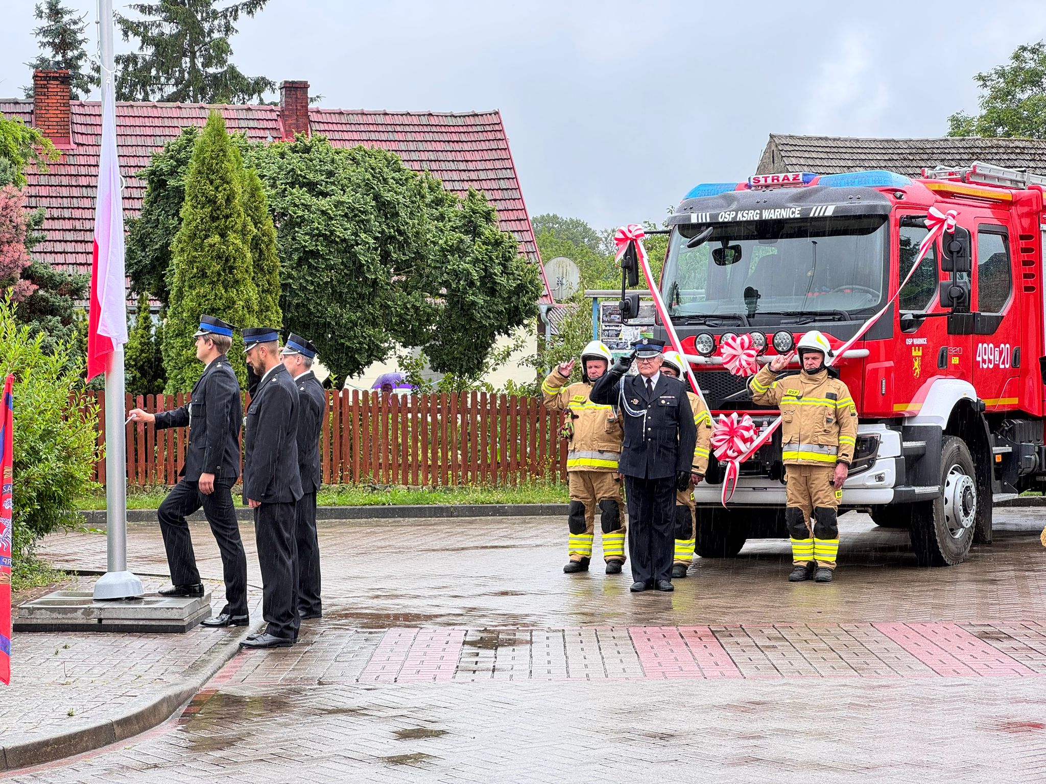 Następnie odegrano hymn Rzeczypospolitej Polskiej i podniesiono flagę państwową. Po przywitaniu zaproszonych gości przez Prezesa Jednostki Ochotniczej Straży Pożarnej w Warnicy dh. Adama Ekierta dokonano uroczystego przekazania aktu oraz kluczyków.
