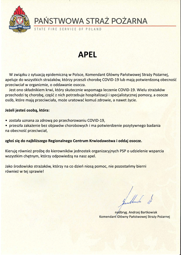 Do 24 marca br. wśród strażaków PSP i OSP, którzy zachorowali na COVID-19, odnotowano 4092 „ozdrowieńców” (3662 PSP/430 OSP). Wciąż jednak pojawiają się nowe zachorowania. W związku z tym, dla dobra wszystkich funkcjonariuszy i ich rodzin oraz całego społeczeństwa, Komendant Główny PSP nadbryg. Andrzej Bartkowiak apeluje do wszystkich strażaków, którzy przeszli chorobę COVID-19 lub mają potwierdzoną obecność przeciwciał w organizmie, o oddawanie osocza – jest ono składnikiem krwi, który skutecznie wspomaga leczenie COVID-19.