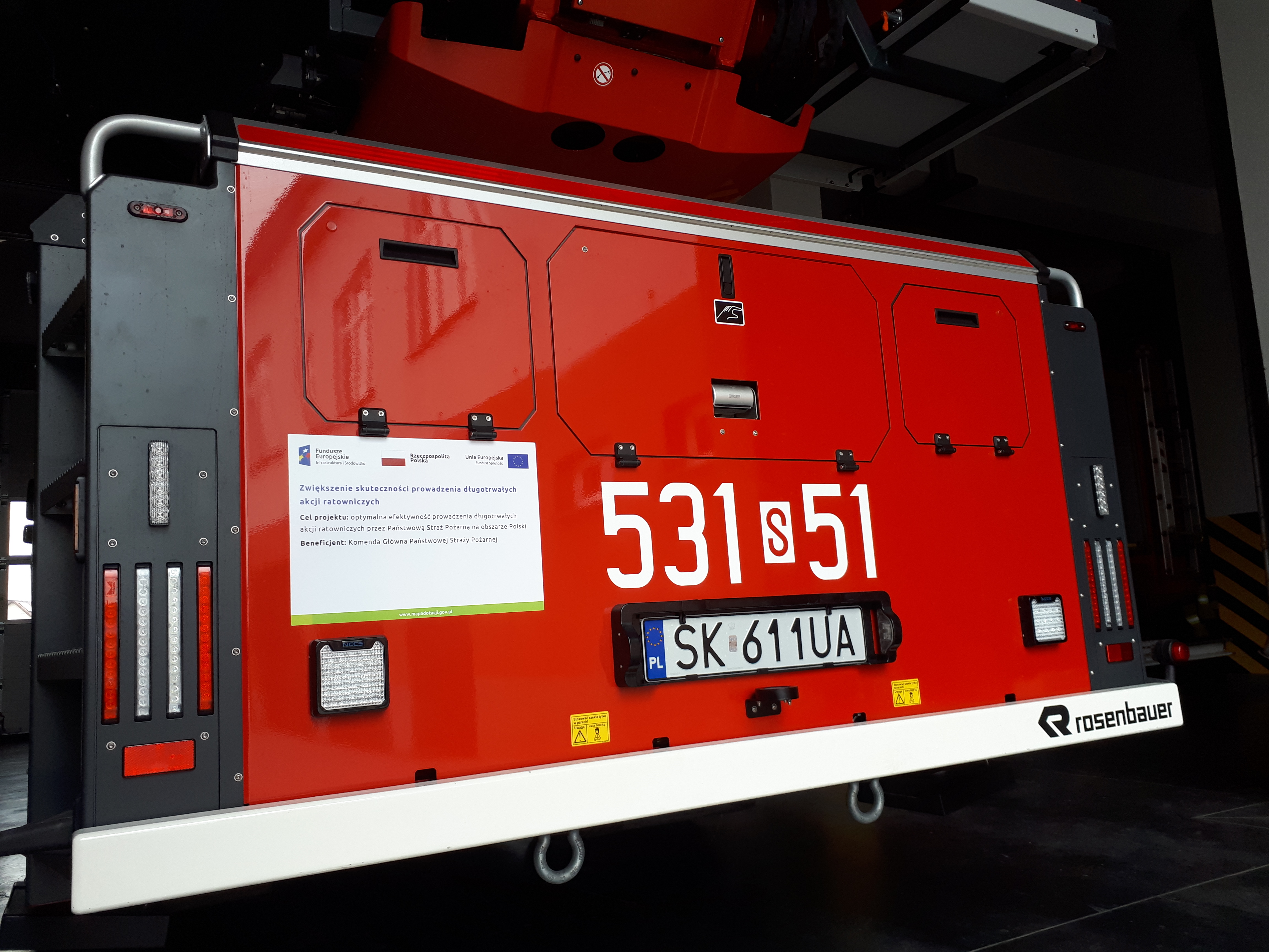 Nowa drabina mechaniczna zakupiona została w ramach realizowanego przez Państwową Straż Pożarną projektu ze środków europejskich „Zwiększenie skuteczności prowadzenia długotrwałych akcji ratowniczych”. Zabudowę pojazdu wykonała firma Rosenbauer Polska.