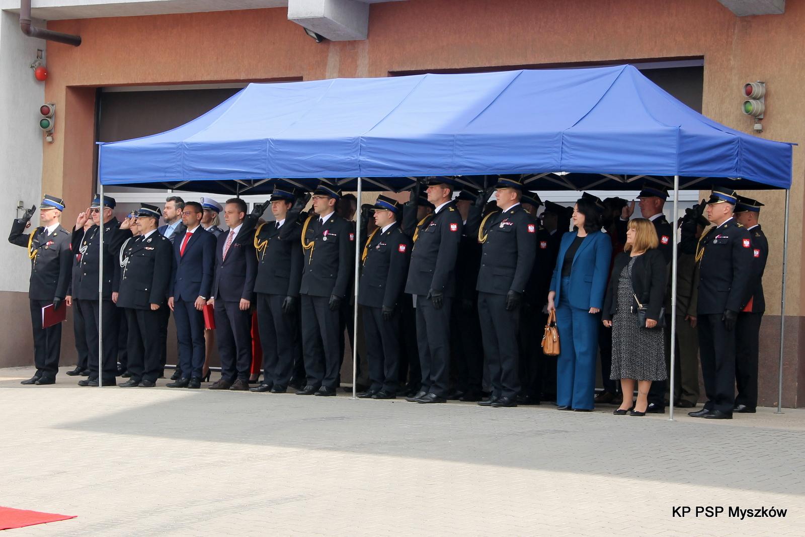 st. kpt. Grzegorza Paul na stanowisko Komendanta Powiatowego Państwowej Straży Pożarnej w Myszkowie, przywitanie się ze sztandarem Komendy oraz złożenie meldunku Śląskiemu Komendantowi Wojewódzkiemu Państwowej Straży Pożarnej o przejęciu obowiązków. Komendant Powiatowy Państwowej Straży Pożarnej w Myszkowie st. kpt. Grzegorz Paul powitał wszystkich przybyłych gości.