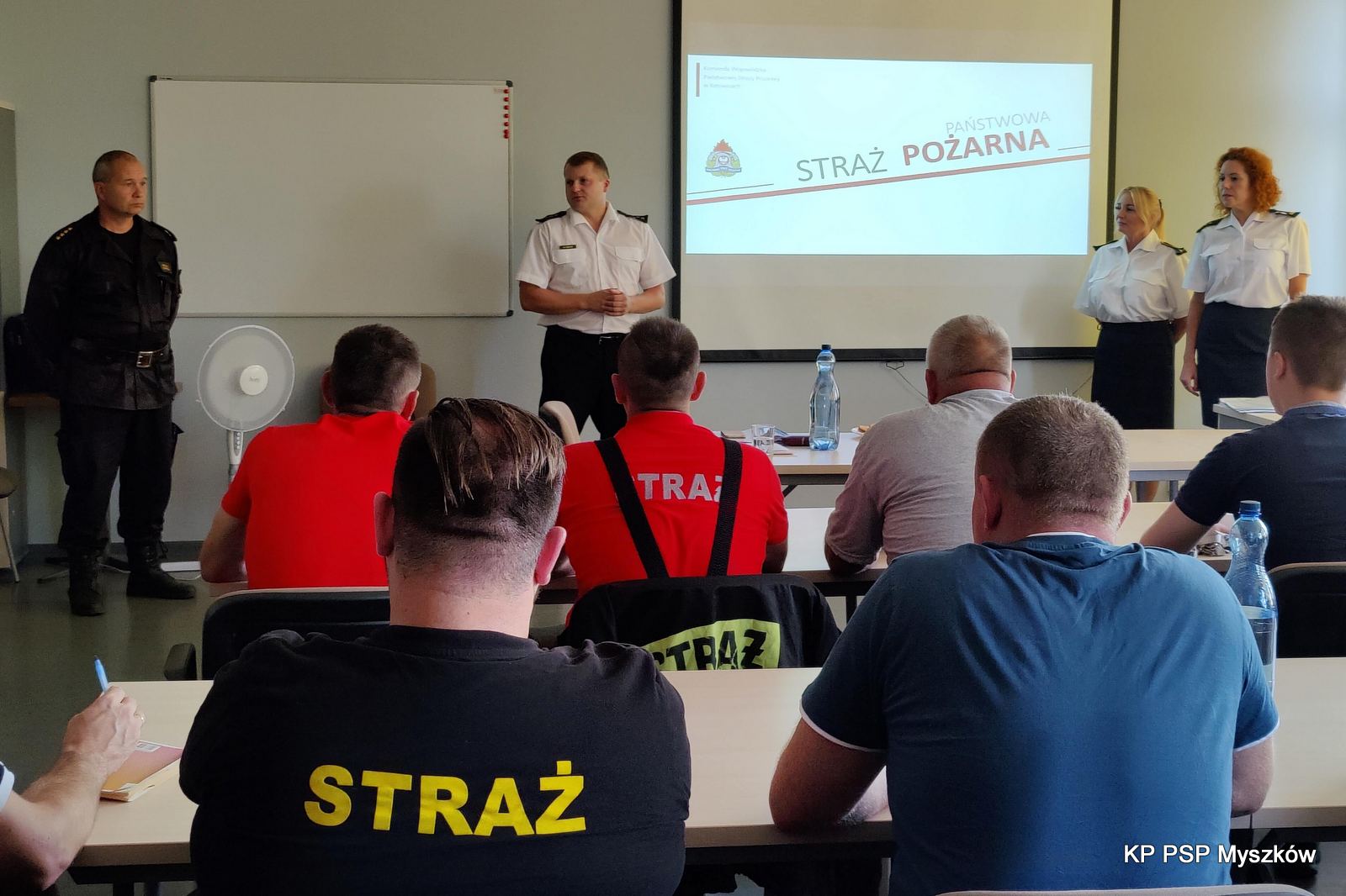W dniu 16.08.2022r. w KP PSP w Myszkowie odbyło się szkolenia dla Naczelników Jednostek OSP z terenu powiatu z zakresu metodyki prowadzenia szkoleń BHP. Organizatorem szkolenia był Ośrodek Szkolenia KW PSP w Katowicach, a wykładowcami byli bryg. A. Wąchała, mł. asp. I. Kurzeja i st. kpt. Michał Górecki. Zdobyta wiedza umożliwi Naczelnikom Jednostek prowadzenie szkoleń stanowiskowych dla strażaków przygotowująych się do czynnego udziału w działaniach ratowniczych.