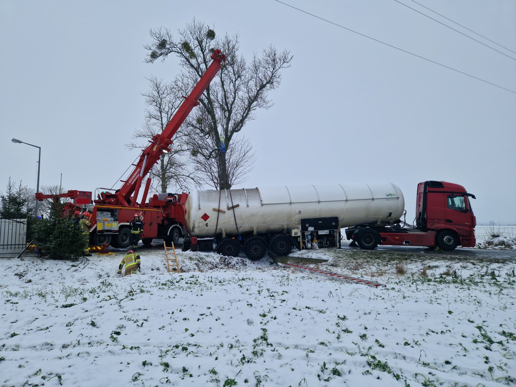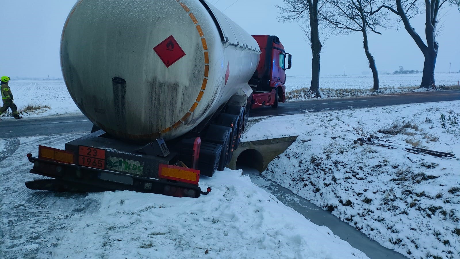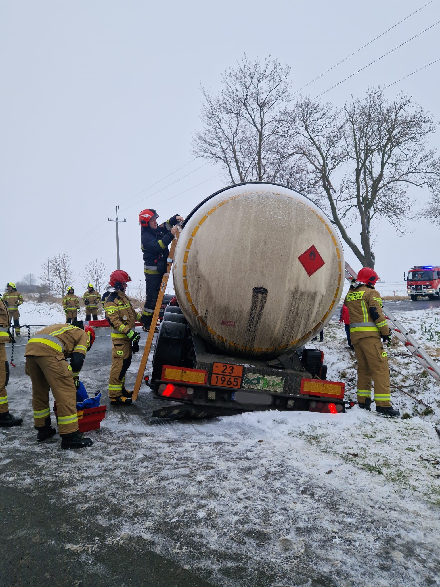 Po dojeździe na miejsce ustalono, że pojazd jest niebezpiecznie zawieszony naczepą na przepuście drogowym nad rowem melioracyjnym. Kierujący pojazdem samodzielnie opuścił pojazd przed przybyciem służb ratowniczych. Potwierdzono również, że nie doszło do wycieku paliwa oraz płynów eksploatacyjnych z samochodu, w tym także przewożonego gazu propan-butan.