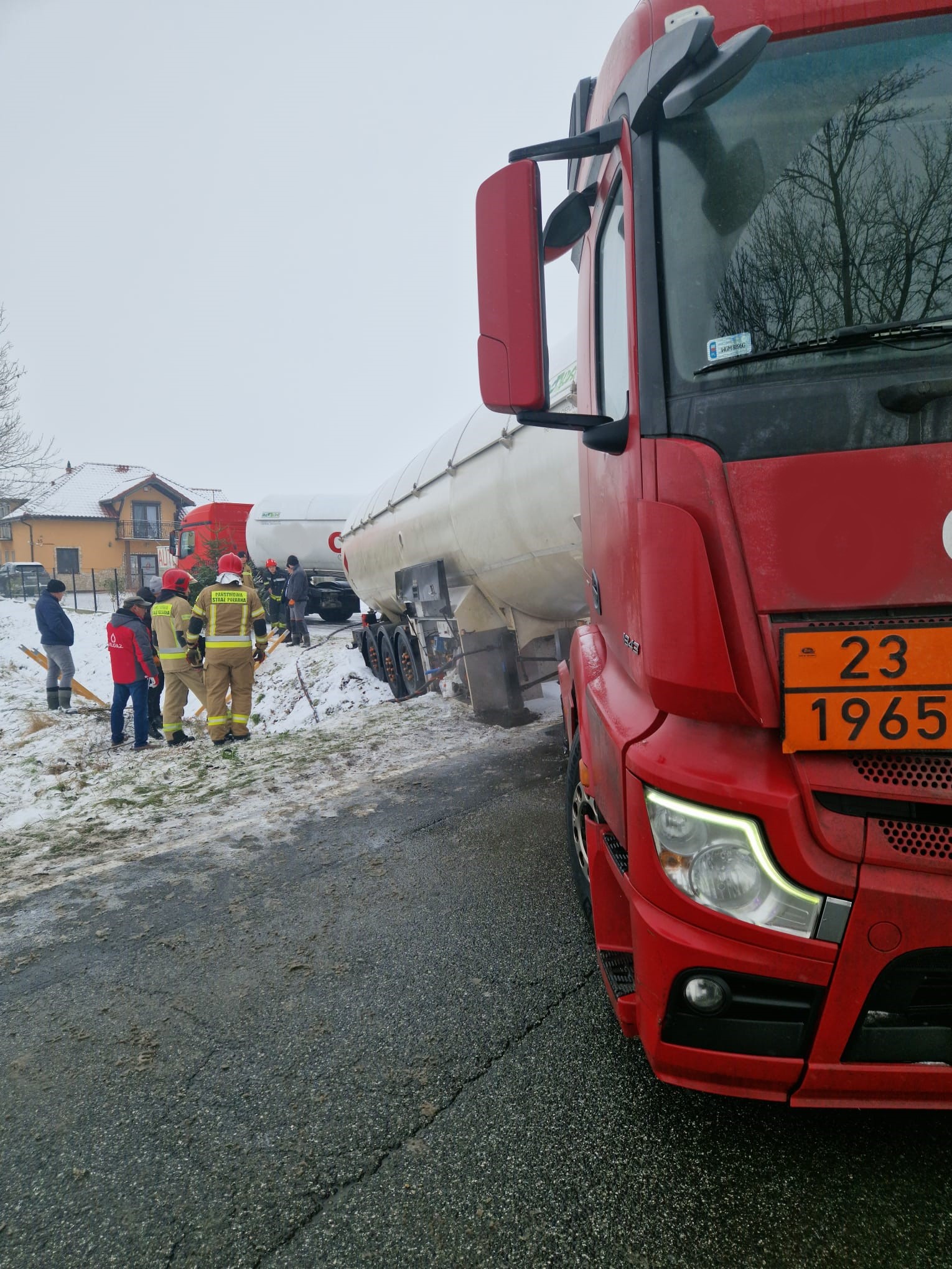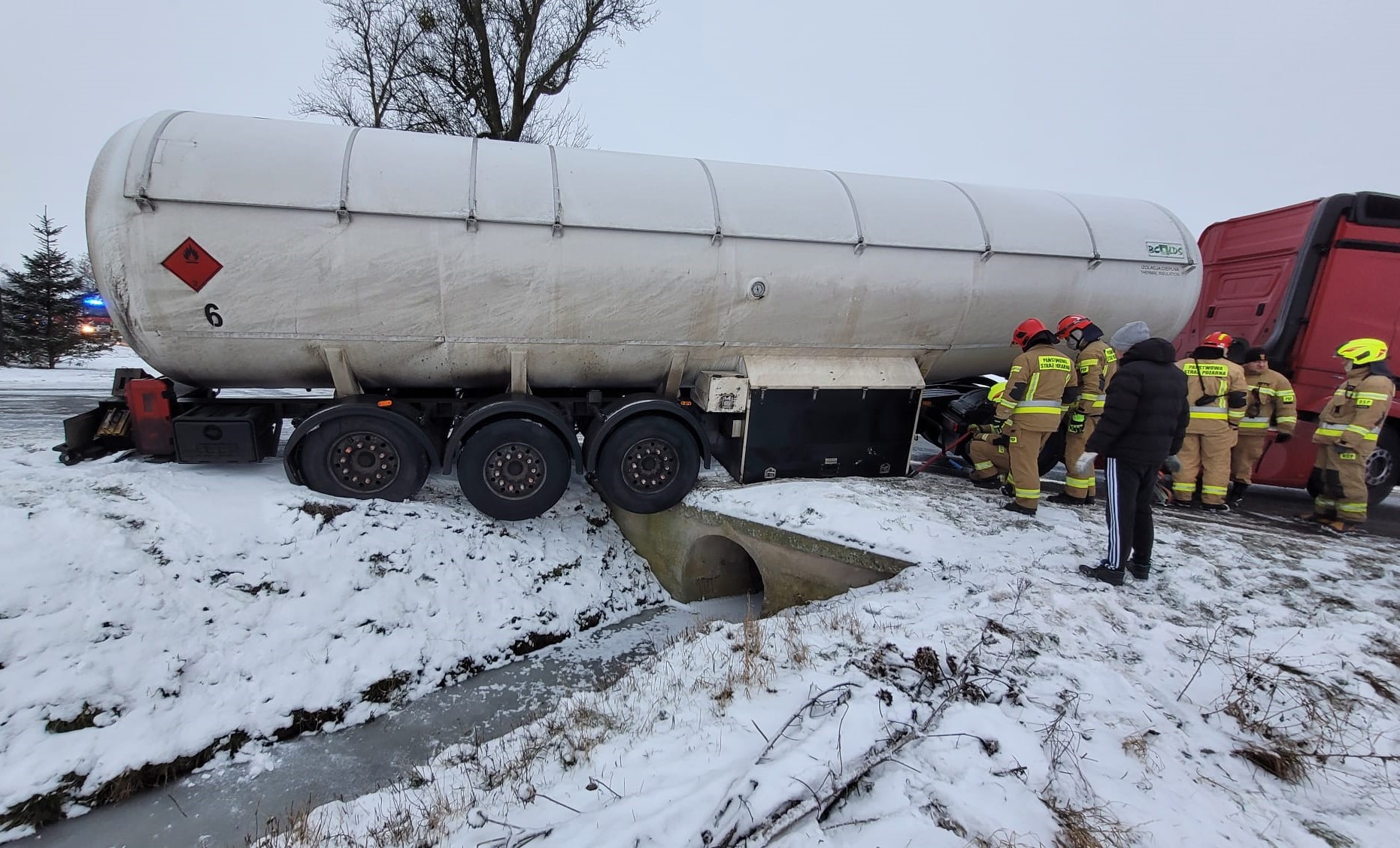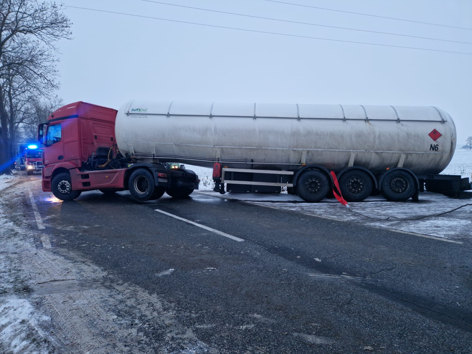 Po dojeździe na miejsce ustalono, że pojazd jest niebezpiecznie zawieszony naczepą na przepuście drogowym nad rowem melioracyjnym. Kierujący pojazdem samodzielnie opuścił pojazd przed przybyciem służb ratowniczych. Potwierdzono również, że nie doszło do wycieku paliwa oraz płynów eksploatacyjnych z samochodu, w tym także przewożonego gazu propan-butan.