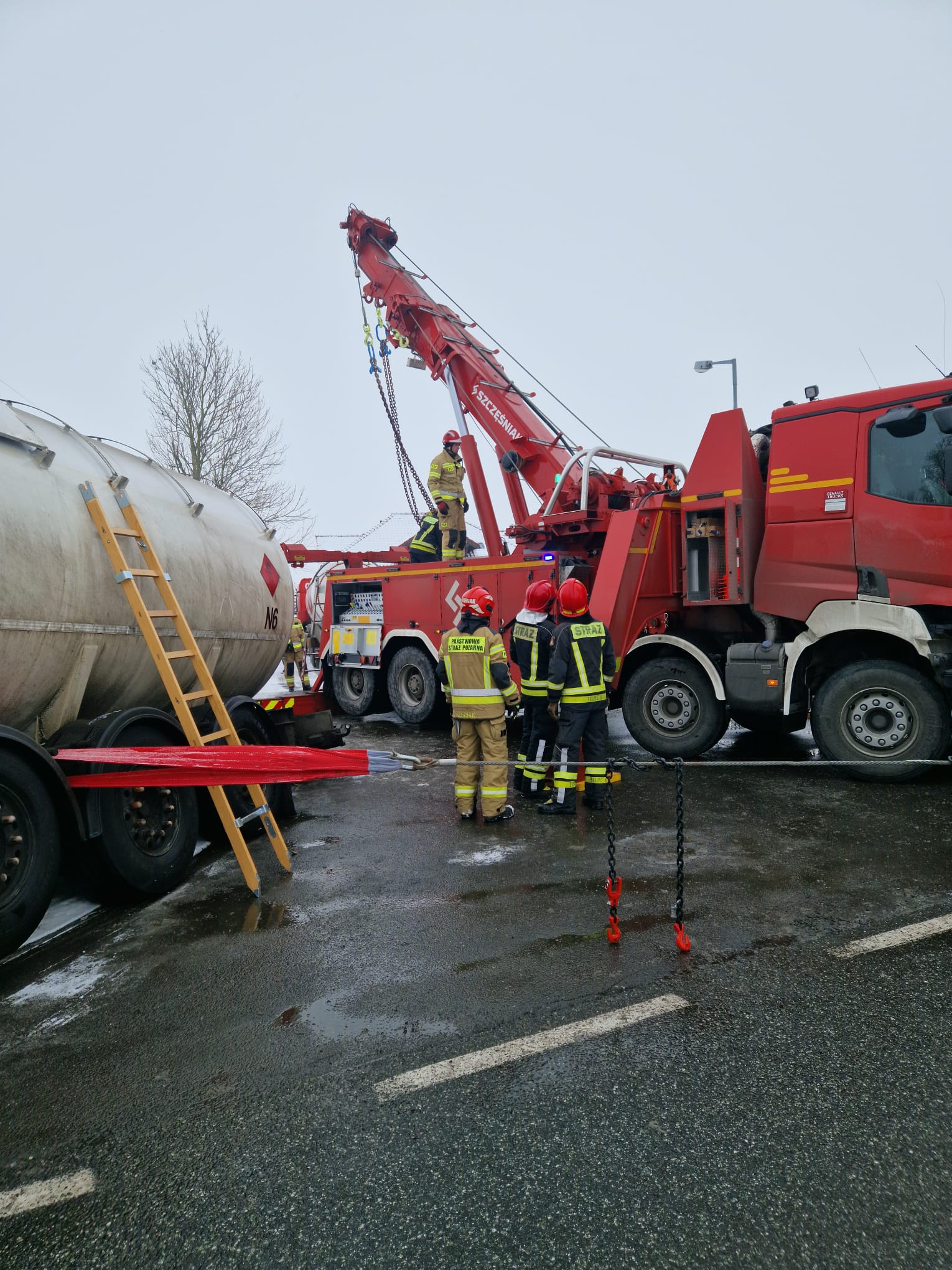 Działania zastępów trwające niespełna pięć godzin polegały na zabezpieczeniu miejsca zdarzenia i docelowo z wykorzystaniem specjalistycznego sprzętu po przepompowaniu gazu do zastępczej cysterny bezpiecznym przemieszczeniu zestawu na jezdnię.