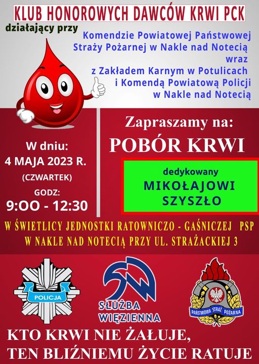 Zapotrzebowanie na bezcenny lek, jakim jest ludzka krew nie ustaje. Wychodząc naprzeciw tym potrzebom, kolejny raz organizujemy zbiórkę krwi. Wszystkich honorowych krwiodawców oraz osoby chętne, by krwiodawcami się stać, zapraszamy 4 maja (czwartek) 2023 roku do świetlicy Jednostki Ratowniczo-Gaśniczej w Nakle nad Notecią przy