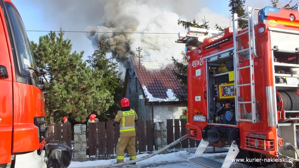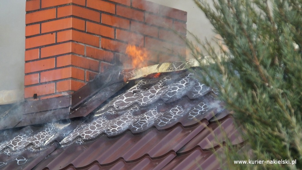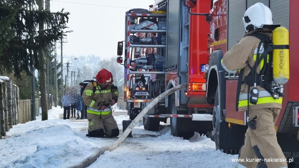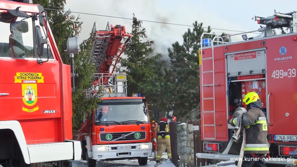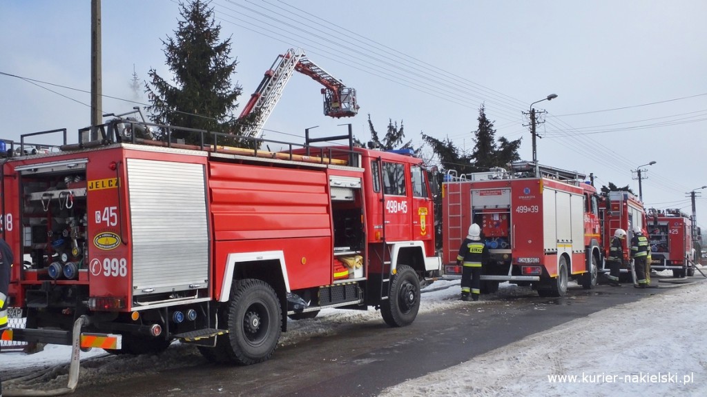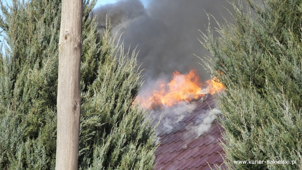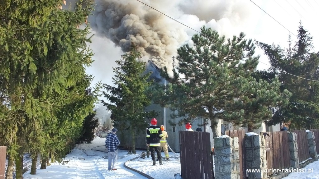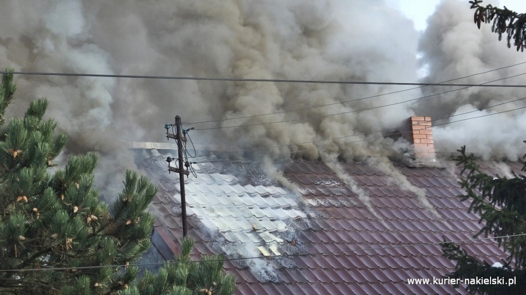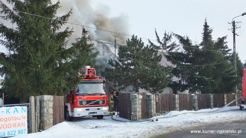 Podjęto decyzję zadysponowania na miejsce zdarzenia łącznie dziesięciu zastępów Straży Pożarnej. Po przybyciu na miejsce pierwszych zastępów z Jednostki Ratowniczo-Gaśniczej Państwowej Straży Pożarnej z Nakła oraz zastępów z Ochotniczych Straży Pożarnych z terenu gminy Nakło nad Notecią zastano rozwinięty pożar konstrukcji dachowej budynku jednorodzinnego pokrytego blachodachówką. Sytuacja pożarowa na miejscu była bardzo dynamiczna, a płomienie wydobywały się ponad kalenicę dachu. Przebywający wewnątrz mieszkańcy zostali poinformowani o nakazie opuszczenia obiektu. Łącznie zostały ewakuowane cztery osoby, które nie wymagały udzielenia pomocy przedmedycznej. Kierowanie akcją oraz prowadzone działania gaśnicze zmierzały do ograniczenia rozprzestrzeniania się pożaru oraz minimalizacji strat popożarowych. W tym celu strażacy wyposażeni w sprzęt ochrony układu oddechowego prowadzili zarówno działania gaśnicze wewnątrz jak i na zewnątrz obiektu. Ze względów bezpieczeństwa budynek został odłączony od zasilania energią elektryczną. W fazie działań gaśniczych dokonano m.in. prac rozbiórkowych piłami mechanicznymi poprzez usunięcie nadpalonych, drewnianych elementów więźby dachowej.
