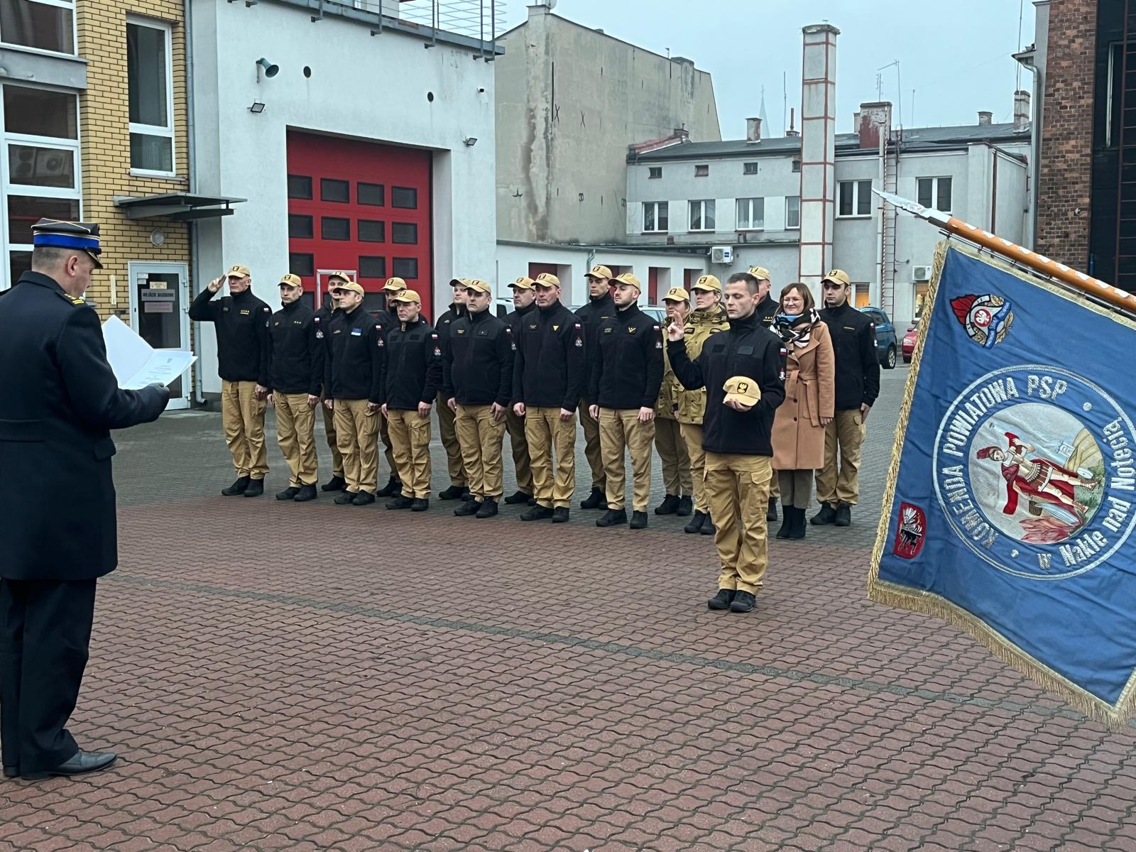 4 grudnia 2024 roku nowo przyjęty do służby funkcjonariusz Państwowej Straży Pożarnej złożył uroczyste ślubowanie. Str. Paweł Murawski przeszedł pozytywnie wszystkie etapy naboru i z dniem 1 grudnia 2024 roku został przyjęty do służby przygotowawczej w Komendzie Powiatowej PSP w Nakle nad Notecią. Dziś, w obecności Starosty Powiatu Nakielskiego Krzysztofa Błońskiego, dowództwa i załogi Jednostki Ratowniczo-Gaśniczej w Nakle nad Notecią, ślubował zachowanie ofiarności i męstwa w ratowaniu zagrożonego życia, mienia i środowiska oraz troskę o dobre imię służby. Przyjmujący ślubowanie Komendant Powiatowy PSP w Nakle nad Notecią st. bryg. Sławomir Murawski, życzył młodemu strażakowi, by rotę ślubowania, jaka wybrzmiała podczas uroczystości, wypełniał z właściwym zaangażowaniem, czerpiąc satysfakcję z podjętej służby.