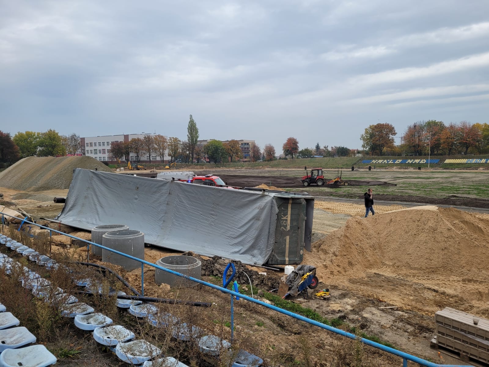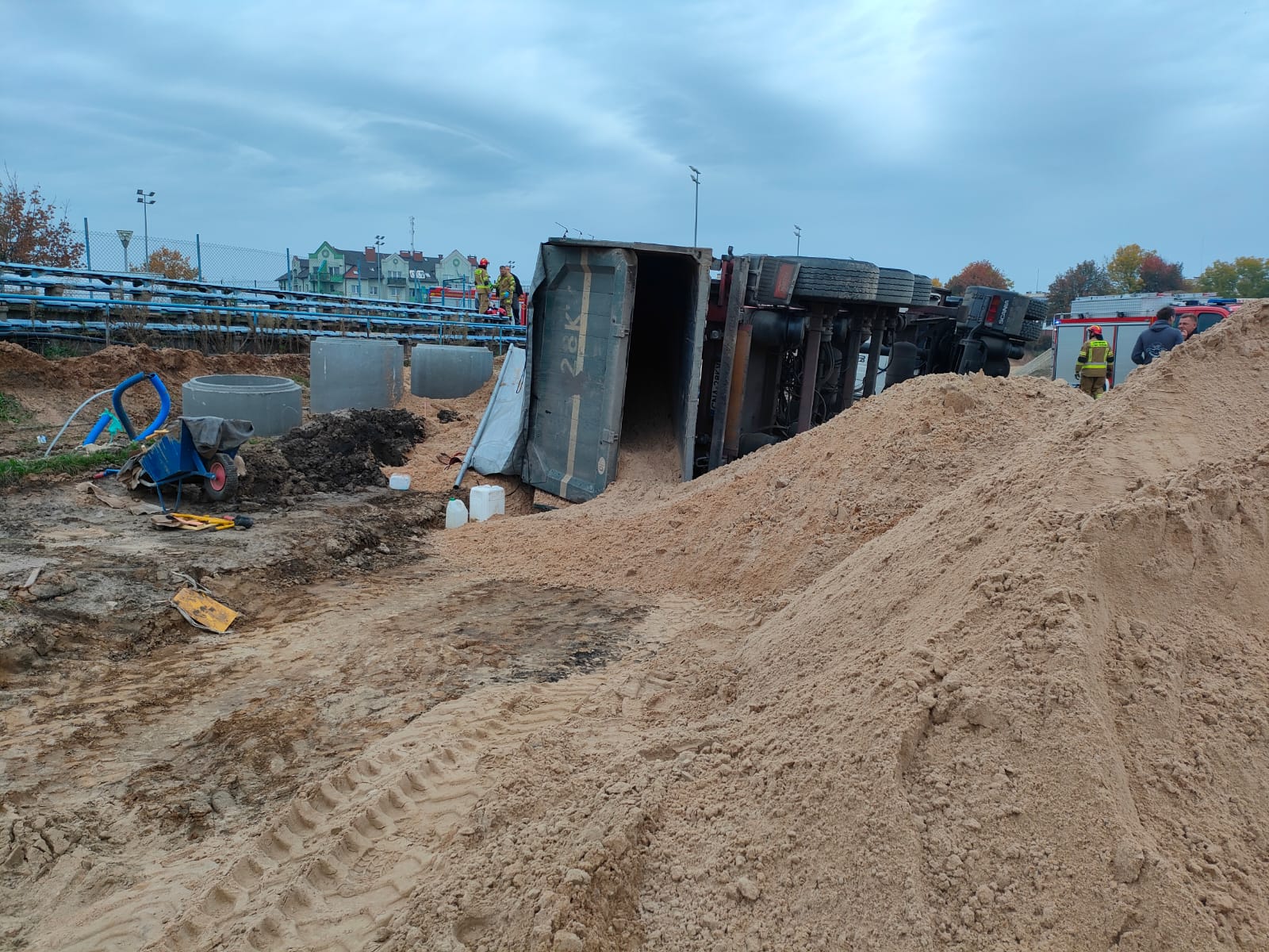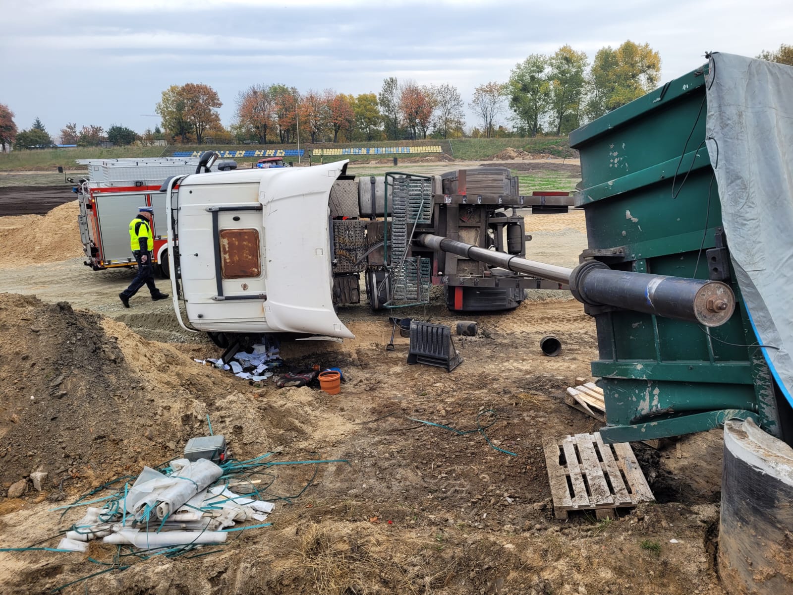 Wypadek ciężarówki podczas rozładunku na placu budowy