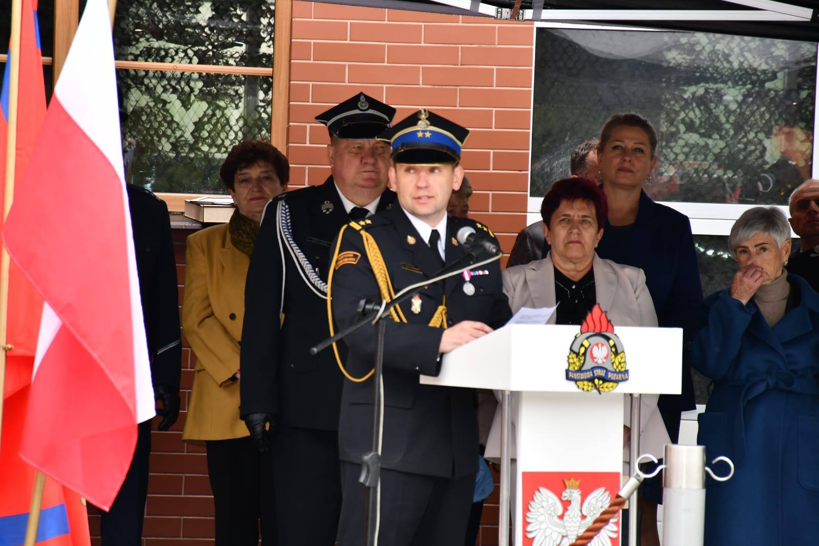 Następnie Komendant Powiatowy Państwowej Straży Pożarnej w Namysłowie bryg. Adrian Wilczyński przywitał zgromadzonych gości, funkcjonariuszy, druhów Ochotniczych Straży Pożarnej oraz pracowników cywilnych. W swoim przemówieniu wyraził wdzięczność wszystkim funkcjonariuszom i druhom za dotychczasowe działania na rzecz ochrony przeciwpożarowej powiatu.
