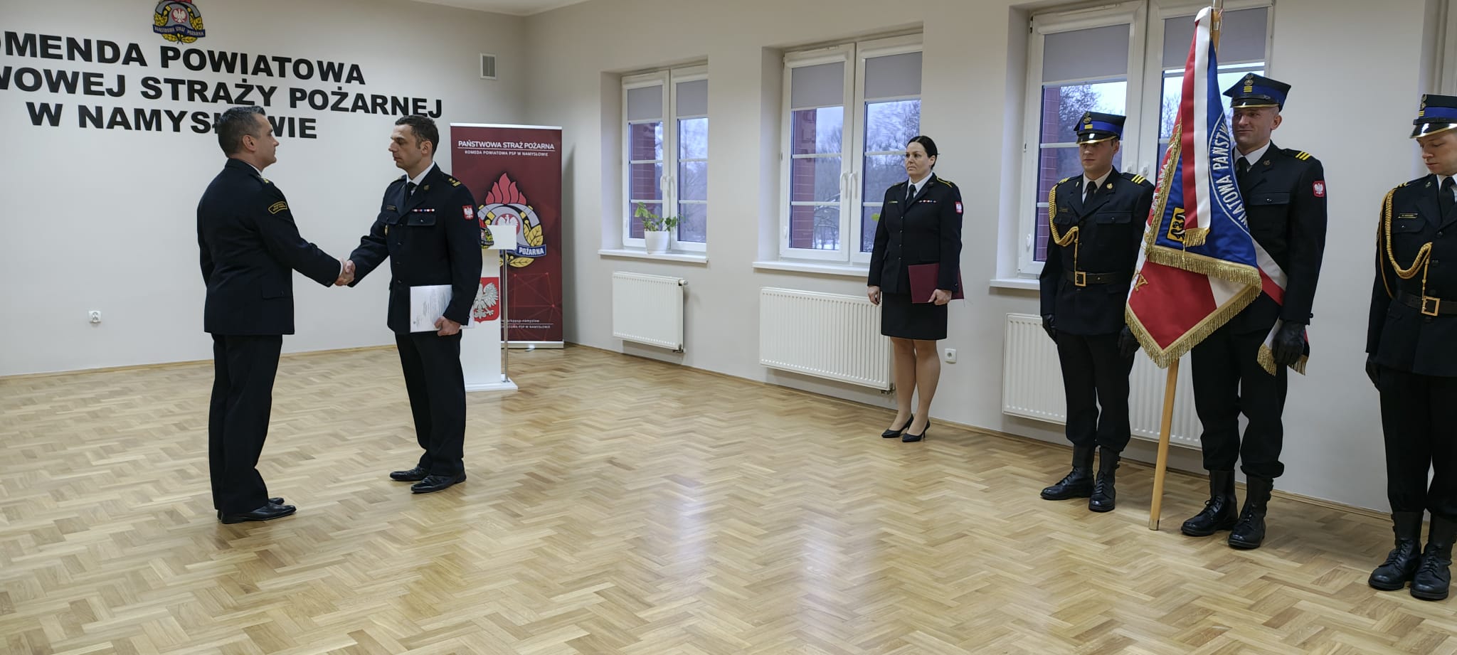 Podczas uroczystości Komendant Powiatowy Państwowej Straży Pożarnej w Namysłowie, bryg. Adrian Wilczyński, wręczył st. kpt. Krzysztofowi Grzybowi decyzję o mianowaniu na stanowisko Dowódcy Jednostki Ratowniczo-Gaśniczej PSP w Namysłowie.