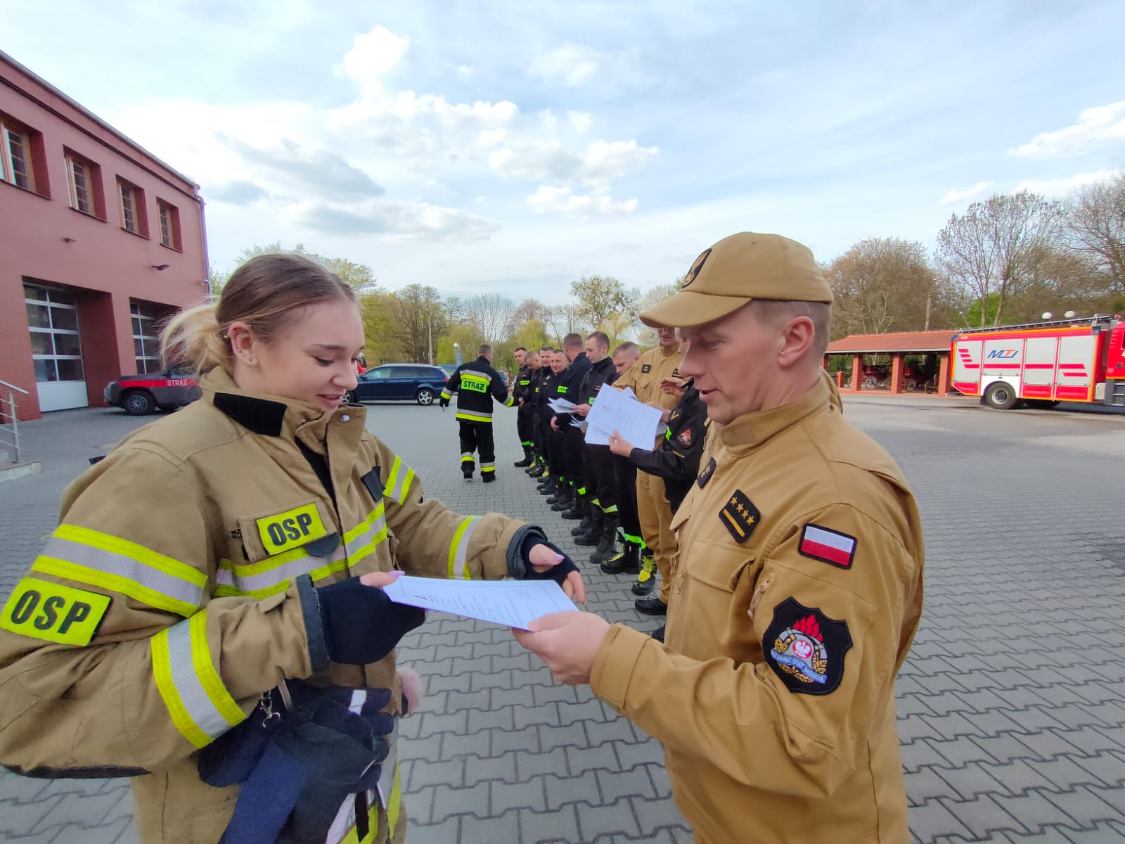 Uroczyste wręczenie dyplomów na szkoleniu podstawowym strażaka ratownika Ochotniczych Straży Pożarnych.