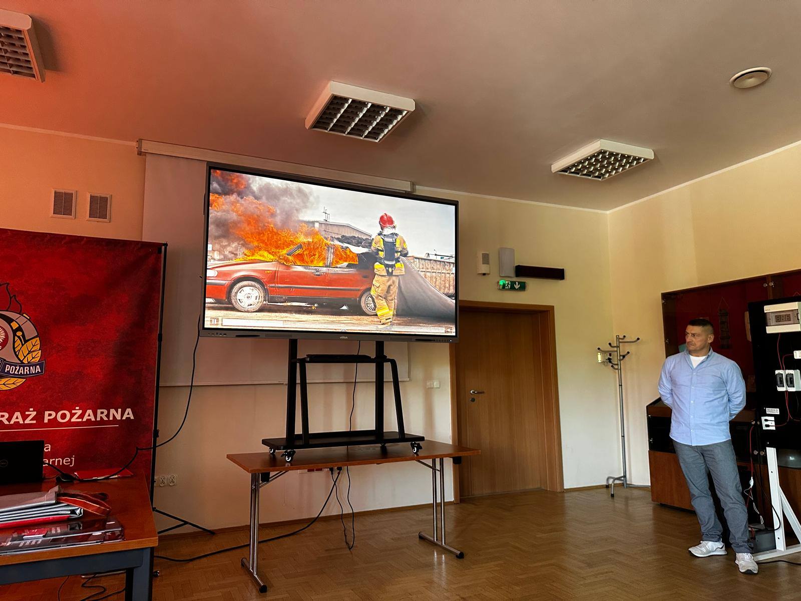 Warsztaty dla strażaków ochotniczych straży pożarnych z zakresu prowadzenia działań w obrębie instalacji fotowoltaicznych oraz gaszenia pożarów pojazdów przy użyciu płachty gaśniczej.