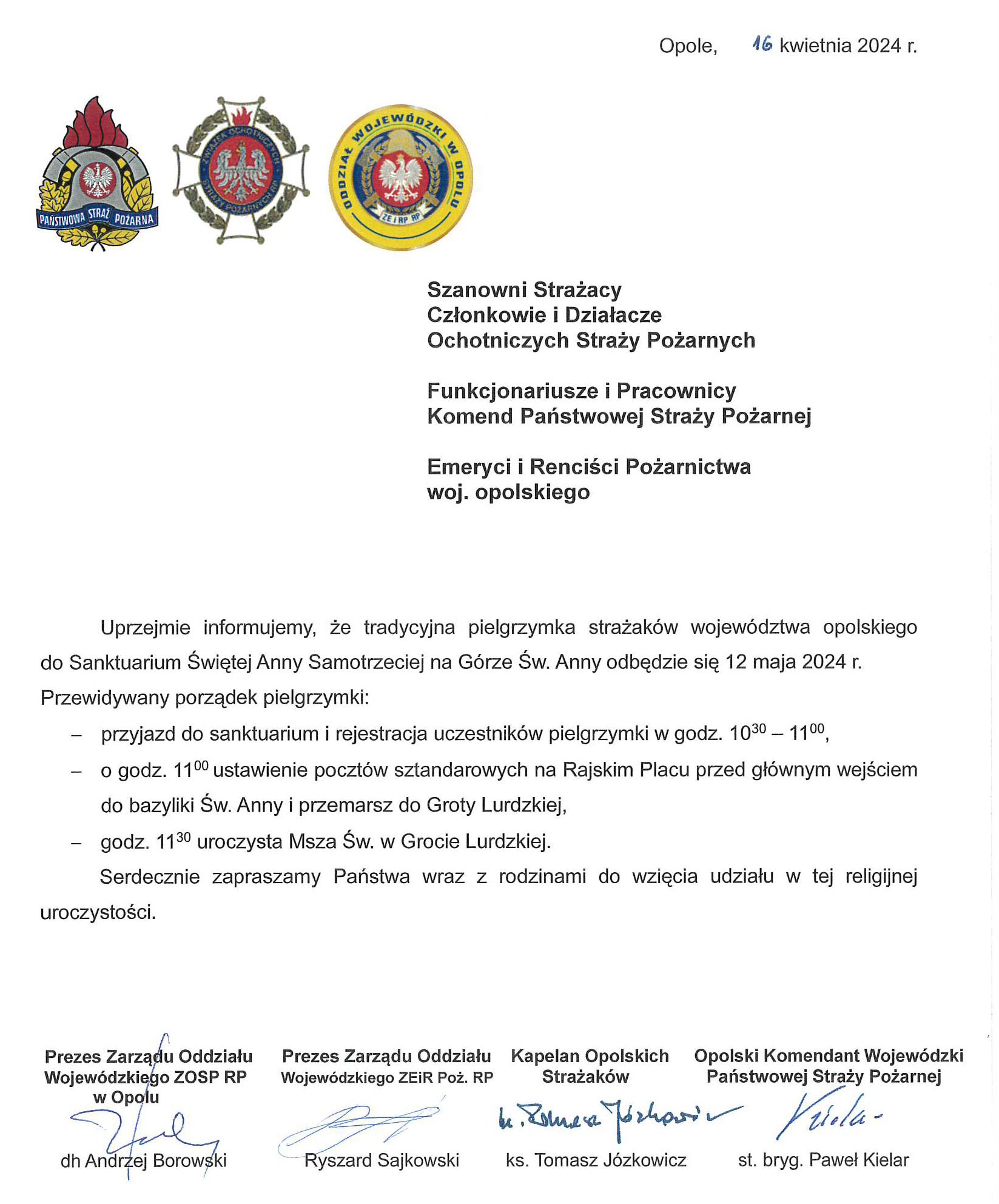 Informujemy, że tradycyjna pielgrzymka strażaków województwa opolskiego do Sanktuarium Świętej Anny Samotrzeciej na Górze Św. Anny odbędzie się 12 maja 2024 roku.