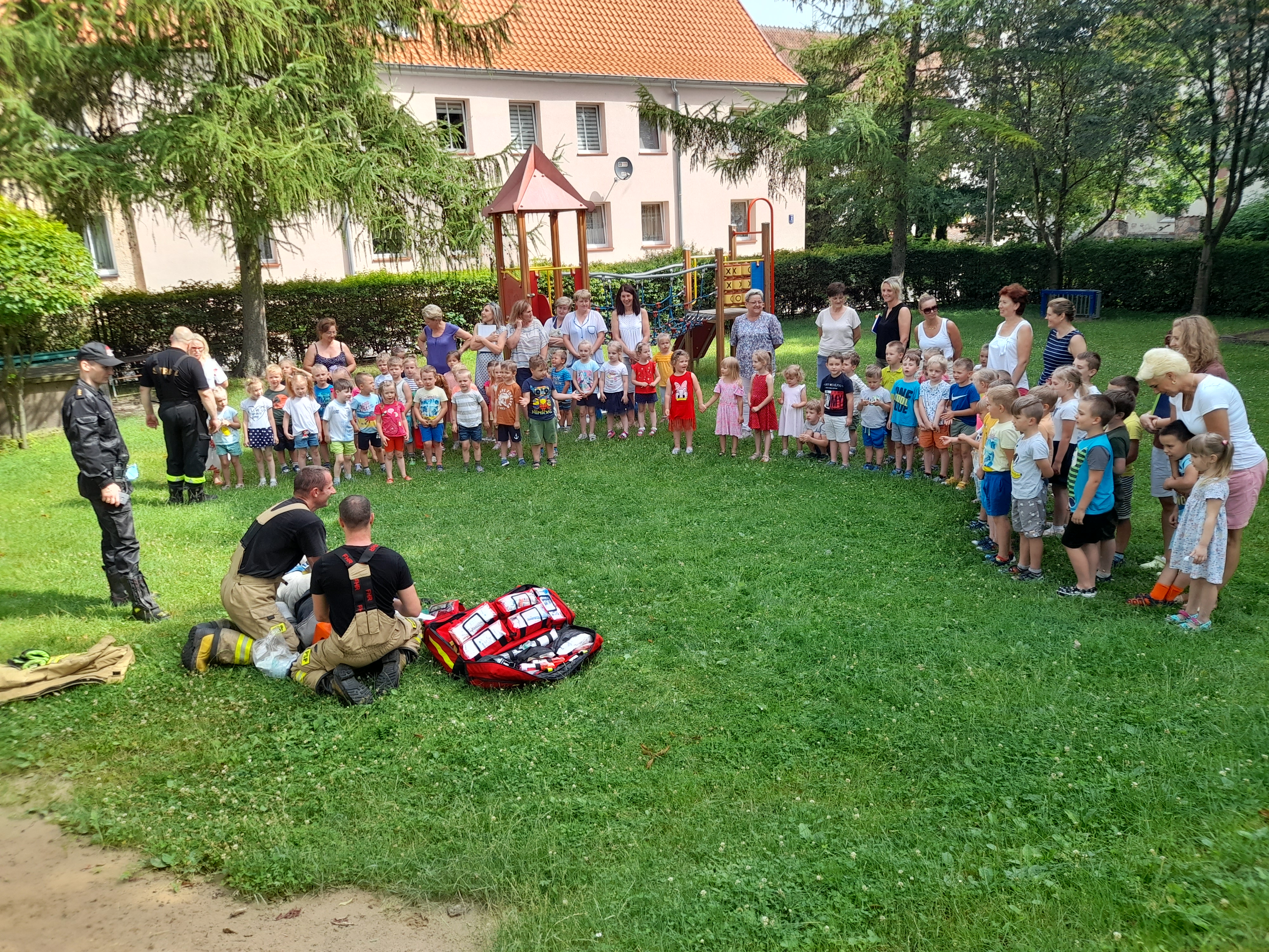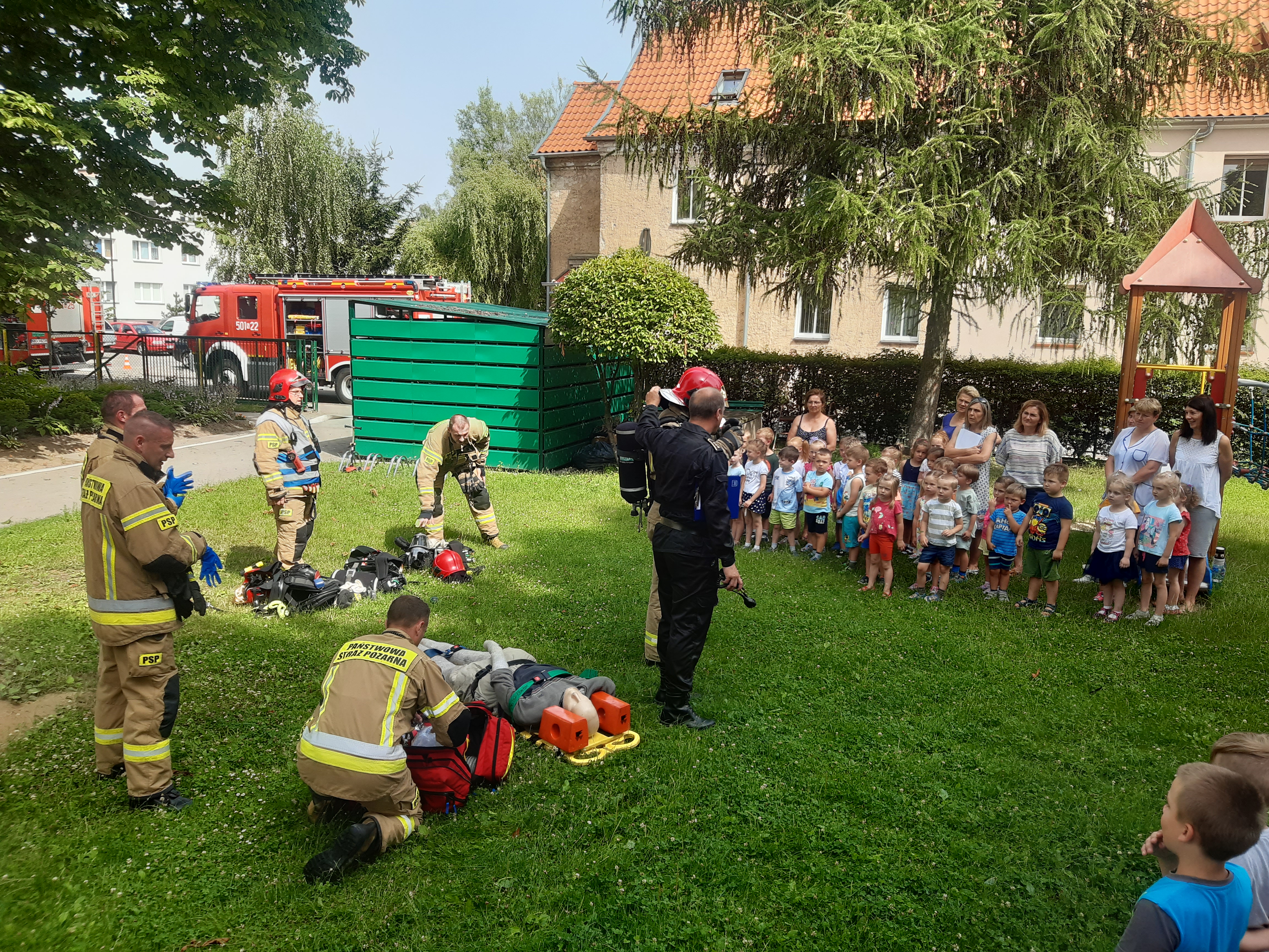 Trzydniowe zaznajomienie się z budynkiem oraz charakterystyką potencjalnych zagrożeń podsumowano ćwiczeniem, którego celem było sprawne przeprowadzenie ewakuacji oraz przygotowanie się do prowadzenia działań ratowniczo-gaśniczych podczas pożaru. W ćwiczenia zaangażowani zostali pracownicy przedszkola, którzy po ogłoszeniu alarmu sprawnie udali się z dziećmi do miejsca planowanej ewakuacji . W ramach ćwiczeń ratownicy, którzy czynnie współpracowali z zarządcą obiektu przeszukali zagrożone pomieszczenia, gdzie odnaleźli osobę poszkodowaną. Po udzieleniu niezbędnej pomocy strażacy przeprowadzili krótki pokaz umijętności, podczas którego przekazali wskazówki w zakresie udzielania pierwszej pomocy poszkodowanym oraz zaprezentowali wyposażenie. Ćwiczenie podsumowały głośne oklaski dzieci, który były nagrodą za sprawnie przeprowadzoną akcję oraz wyrazem sympatii i uznania dla pracy strażaka.