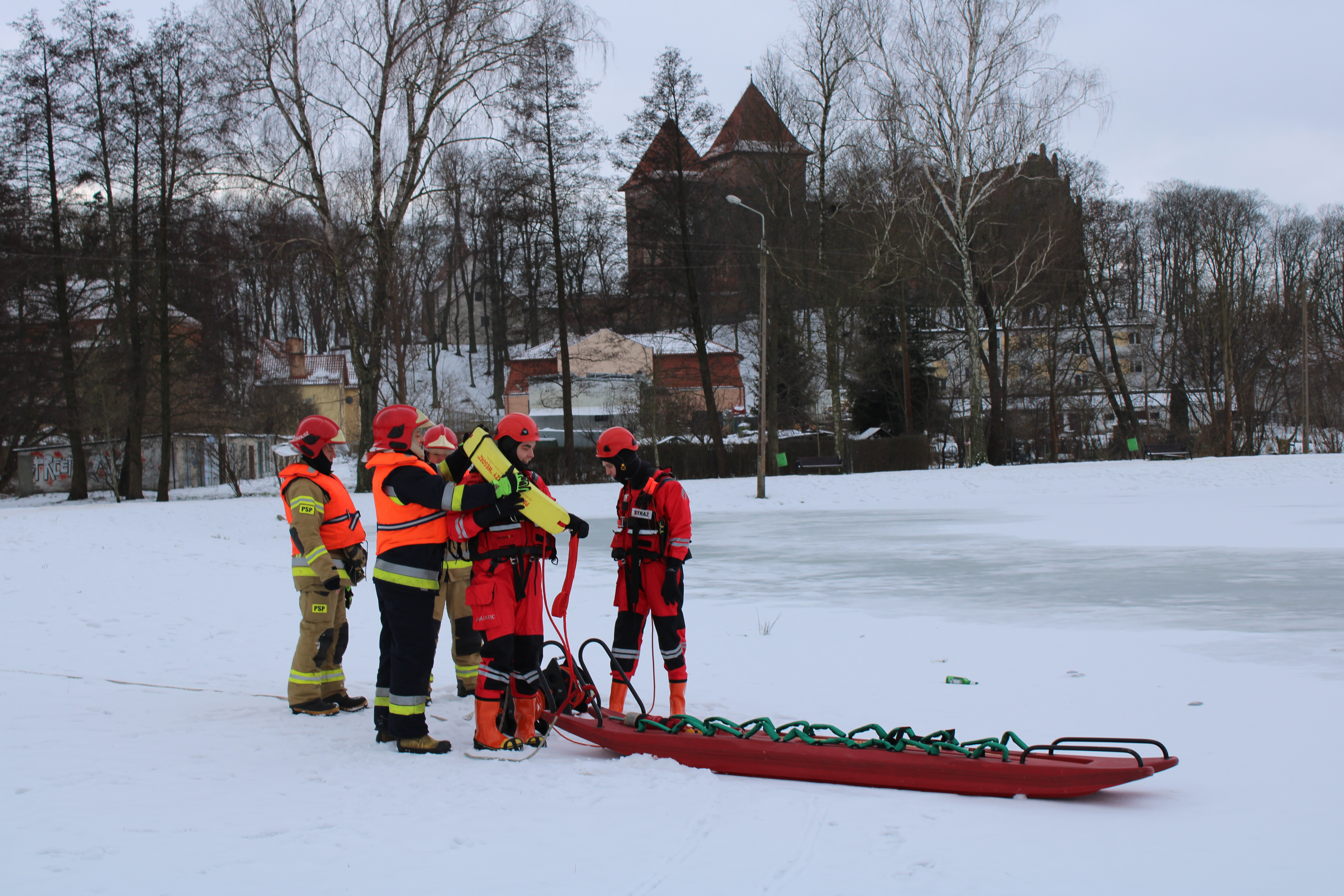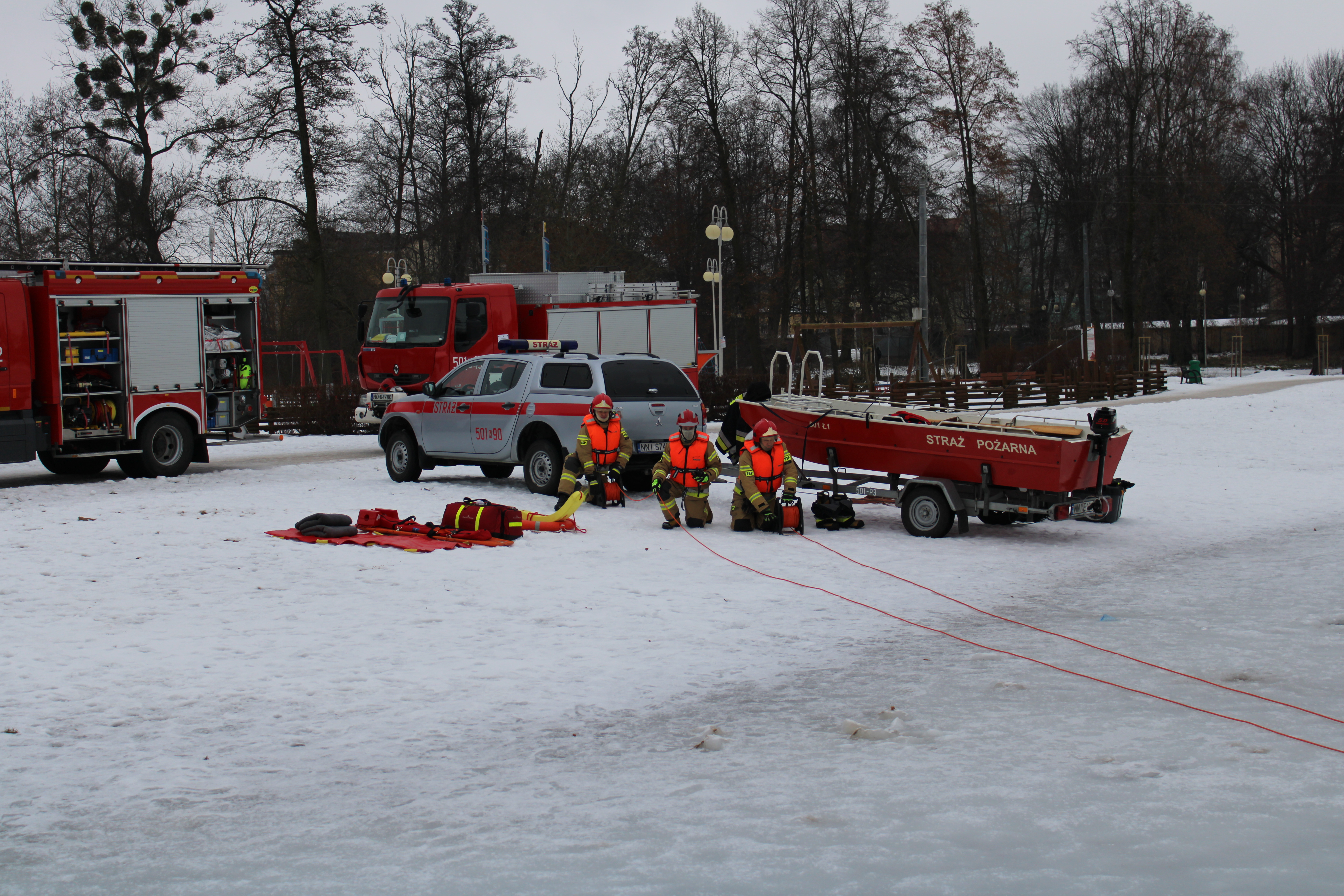 Ćwiczenia z ratownictwa lodowego na jeziorku w Nidzicy