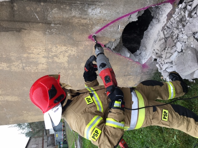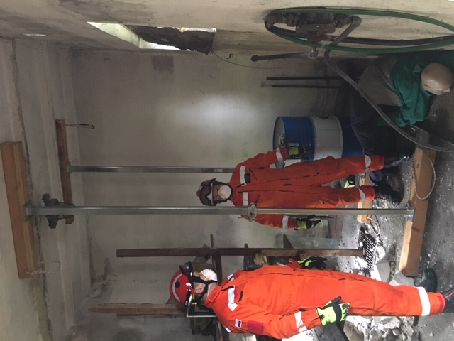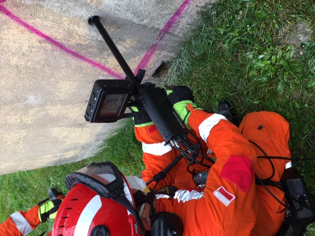 - przeprowadzono próby lokalizacji osoby poszkodowanej w pierwszej kolejności metodą bezprzyrządową, a następnie metodą przyrządową przy wykorzystaniu elektronicznych urządzeń lokalizacyjnych (zlokalizowano osobę poszkodowaną poprzez wykonanie otworu rewizyjnego wiertnicą oraz wprowadzenie kamery wziernikowej),