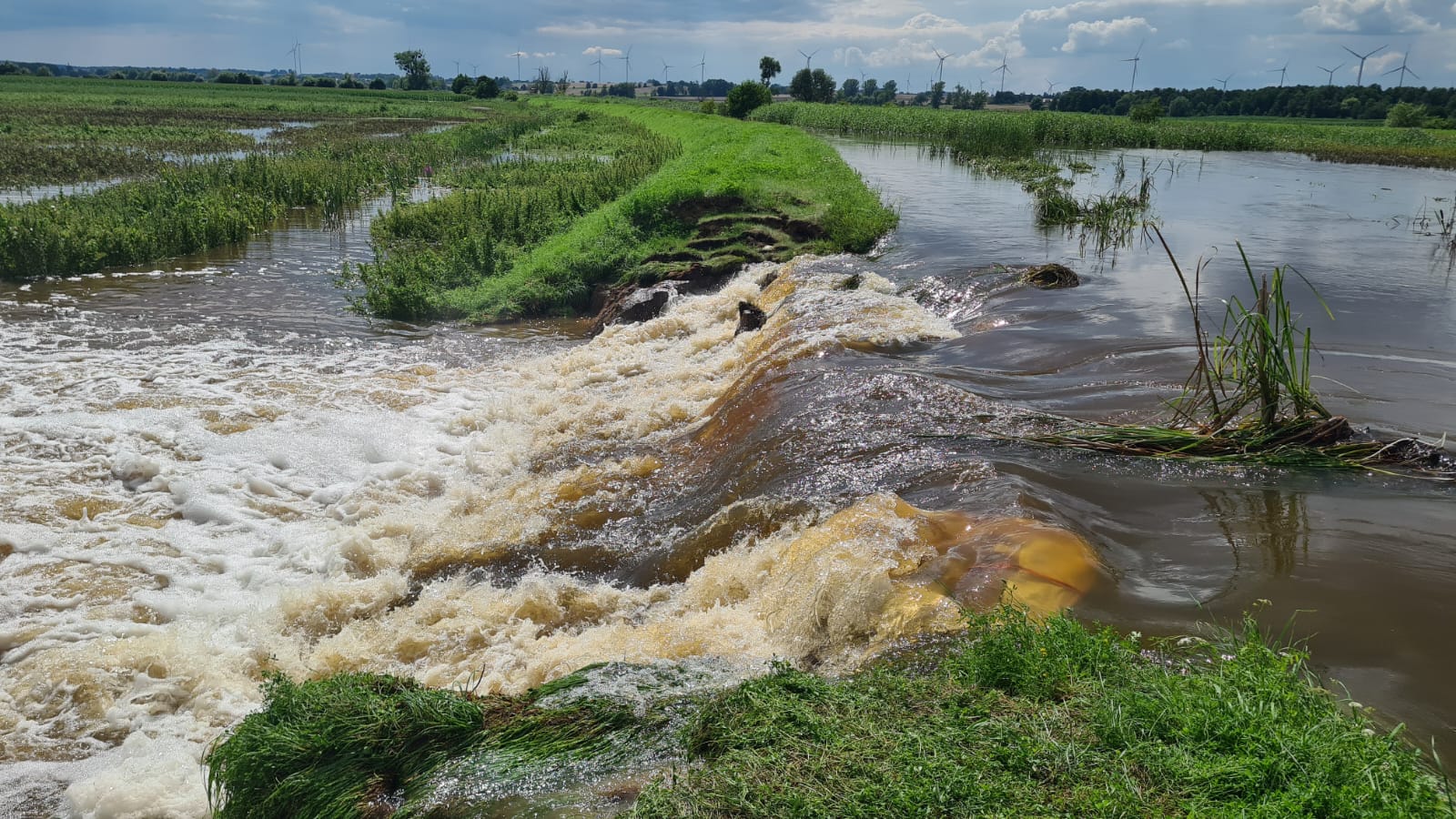 Wczesnym porankiem 31 lipca 2025 roku, nidziccy strażacy zostali pilnie zadysponowani do groźnej sytuacji w Powiecie Elbląskim, w okolicach miejscowości Święty Gaj, w Gminie Rychliki. Na rzece Dzierzgoń, w wyniku silnej nawałnicy, która przeszła nad Żuławami, doszło do przerwania wału przeciwpowodziowego. Woda przerwała wał w okolicy stacji pomp nr 77, tworząc około 10-metrową wyrwę.