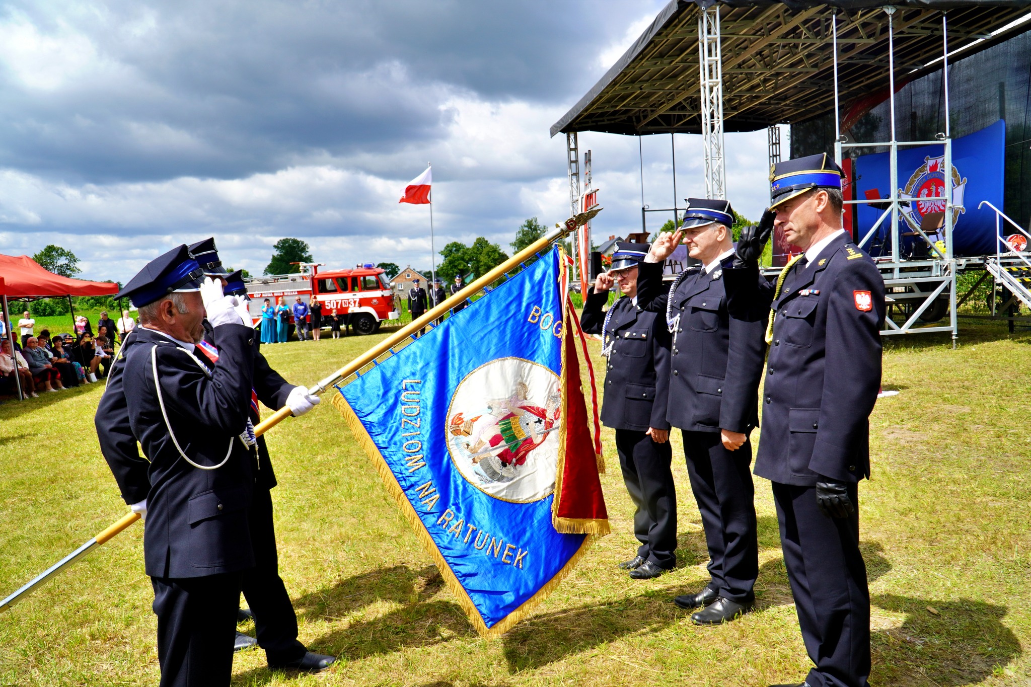 Następnie uhonorowano sztandar OSP w Nowej Wsi Wielkiej symboliczną wstęgą z okazji nadania jednostce Złotego Znaku Związku stanowiącego najwyższe odznaczenie przyznawane przez Związek Ochotniczych Straży Pożarnych Rzeczypospolitej Polskiej.
