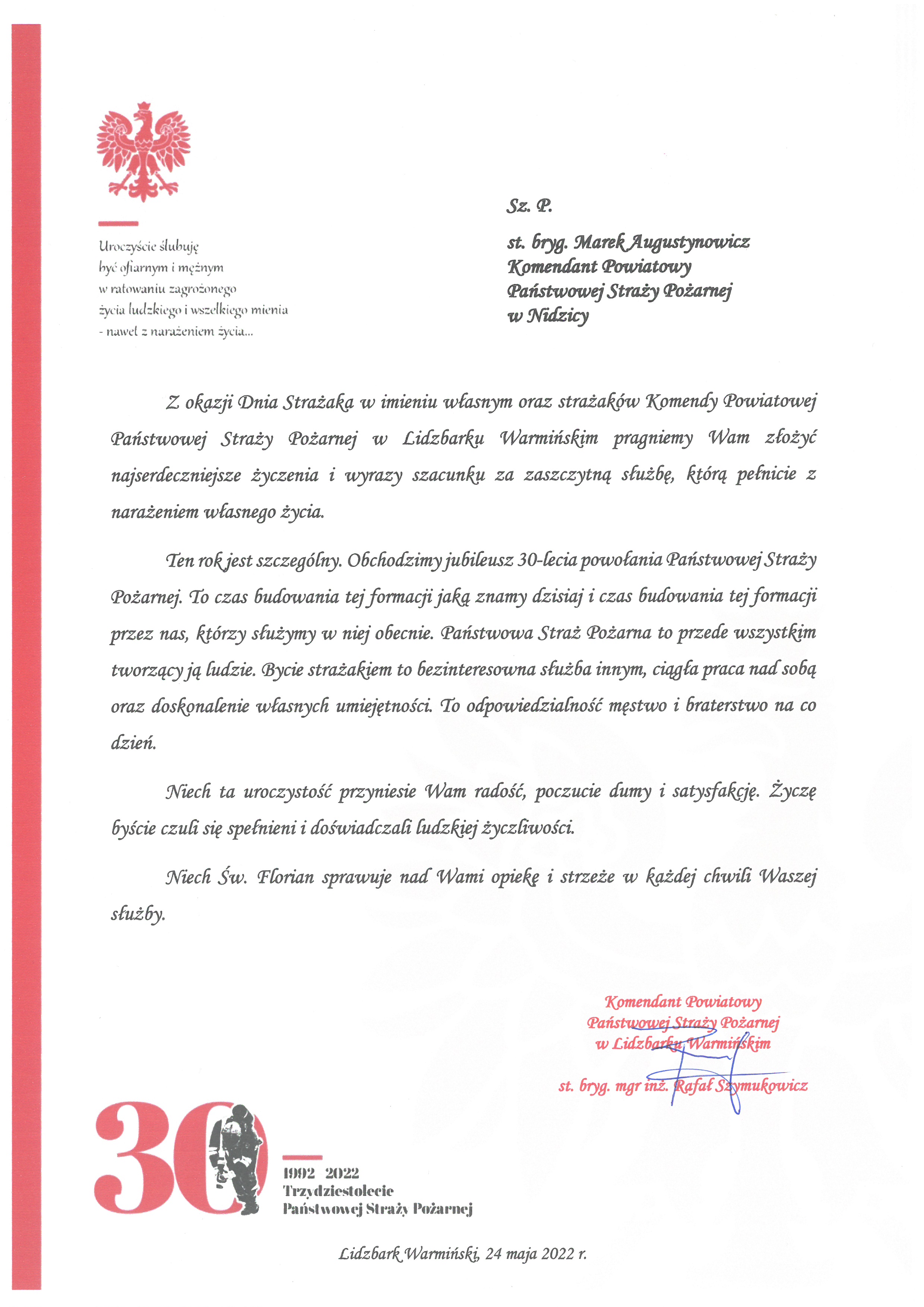 Komendant Powiatowy Państwowej Straży Pożarnej w Nidzicy st.bryg.Marek Augustynowicz, przywitał przybyłych gości oraz wygłosił przemówienie okolicznościowe w związku z jubileuszem 30-lecia Państwowej Straży Pożarnej, w którym podsumował powstanie i rozwój nidzickiej komendy oraz podziękował za działania, które przyczyniły się do wzmacnianie potencjału ratowniczego powiatu.