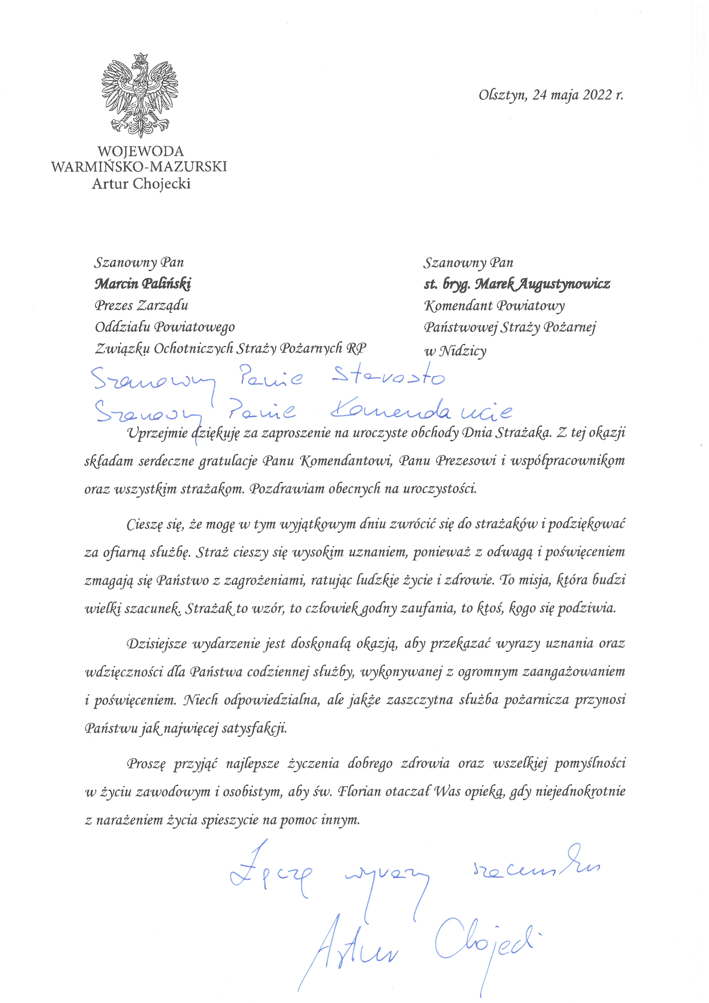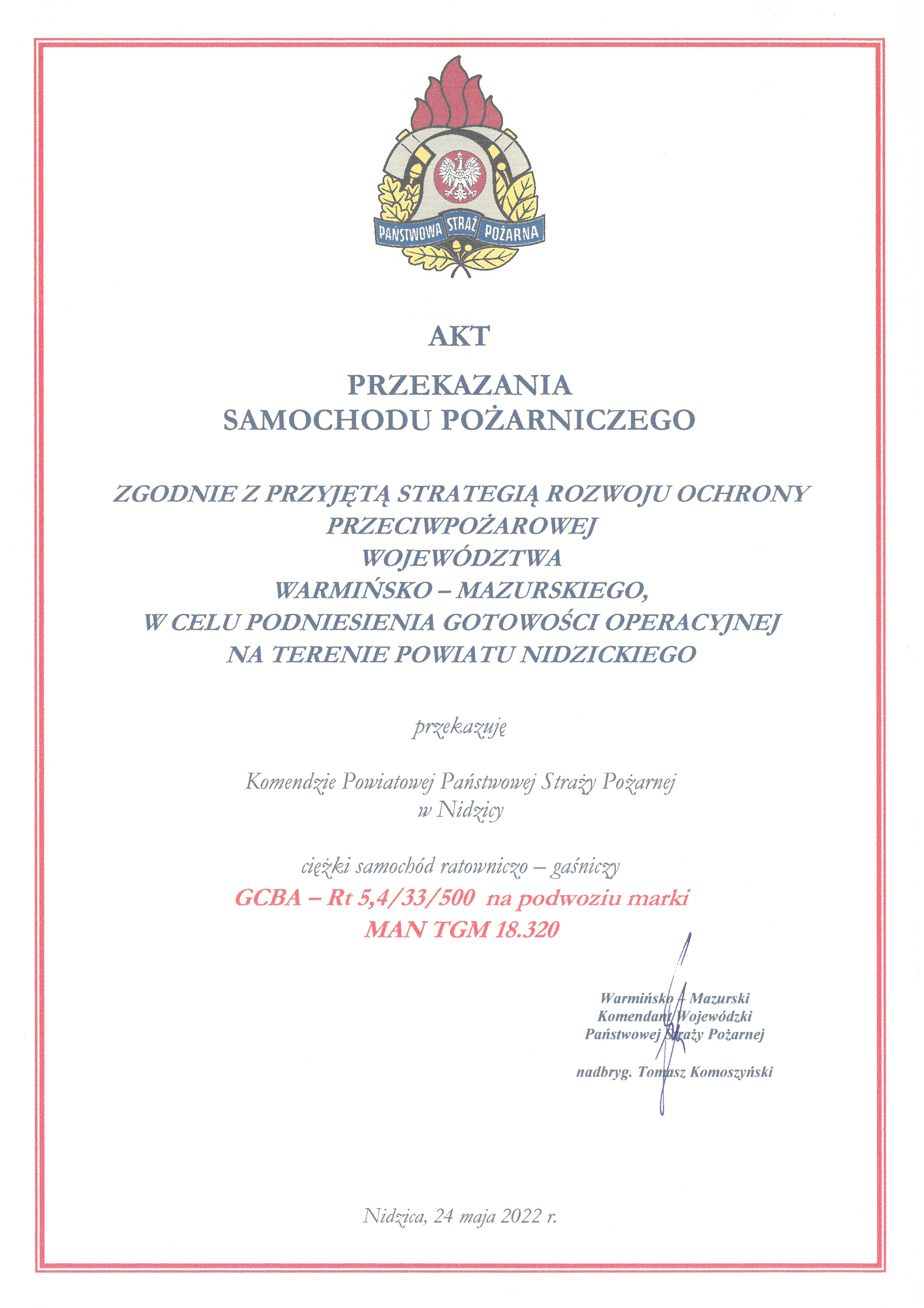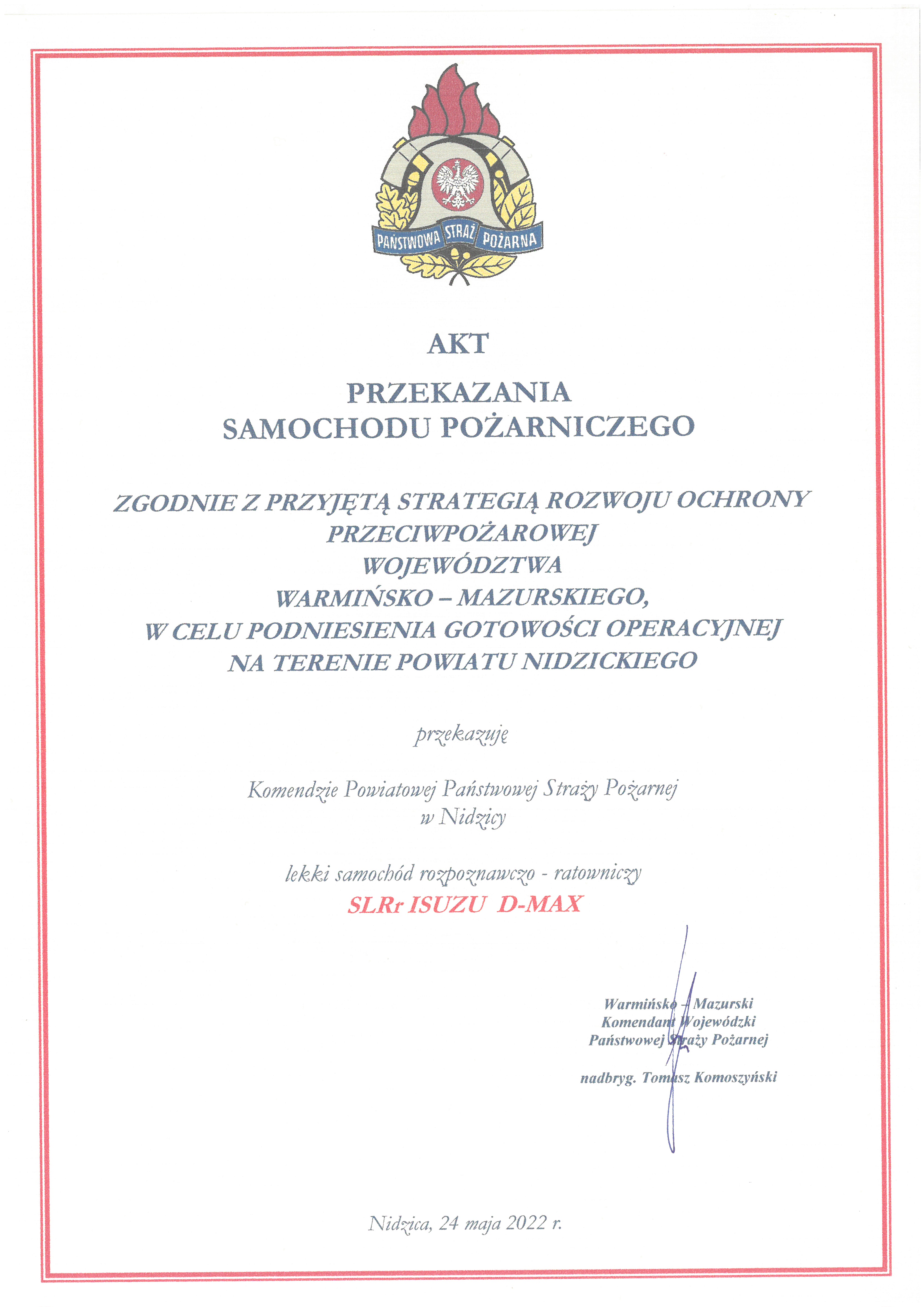 Wręczenia aktów przekazania dokonał Podsekretarz Stanu w MSWiA Pan Błażej Poboży, Pan Wojewoda Warmińsko-Mazurski Artur Chojecki w asyście Starosty Nidzickiego Pana Marcina Palińskiego oraz Warmińsko-Mazurski Komendant Wojewódzki nadbryg. Tomasz Komoszyński.