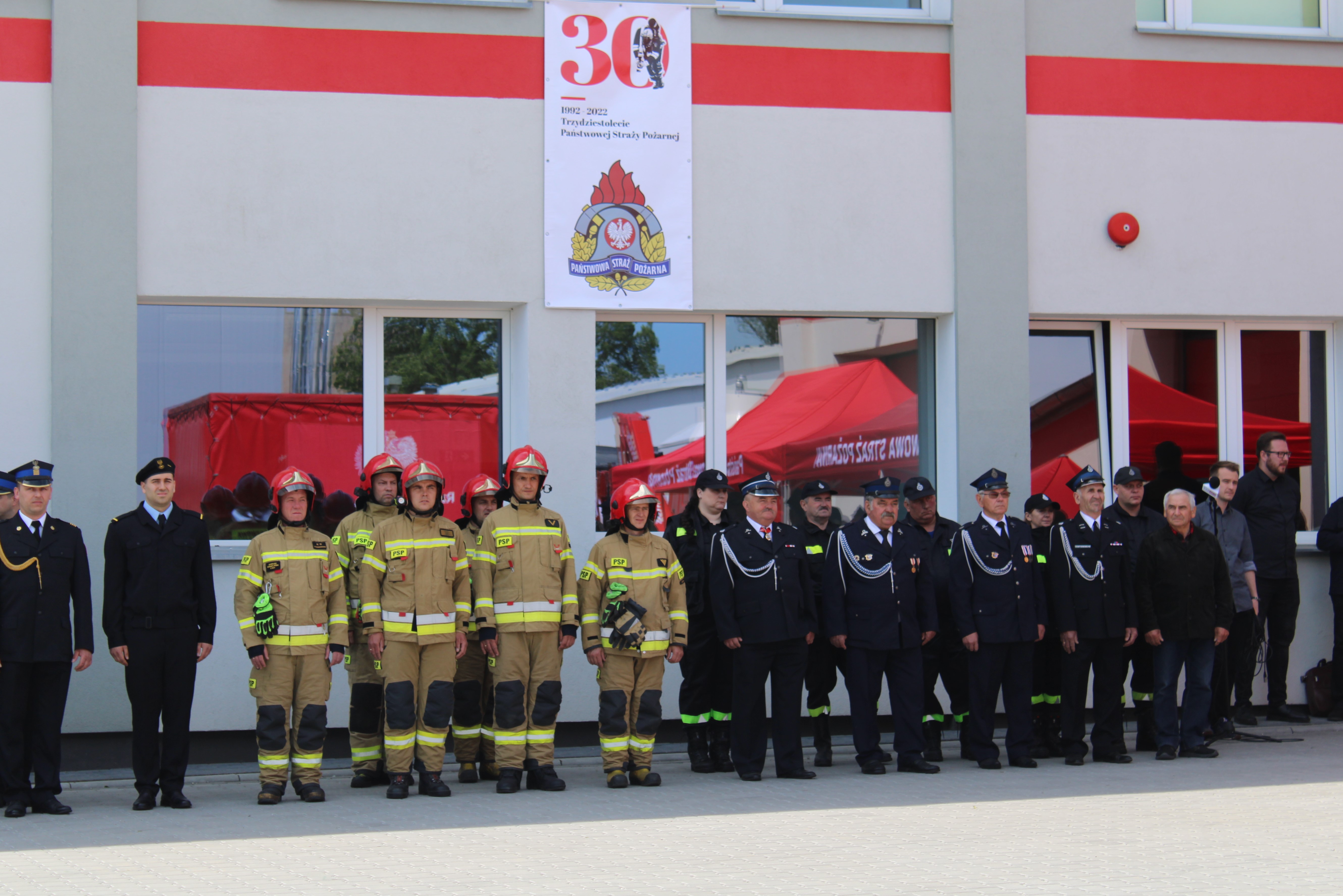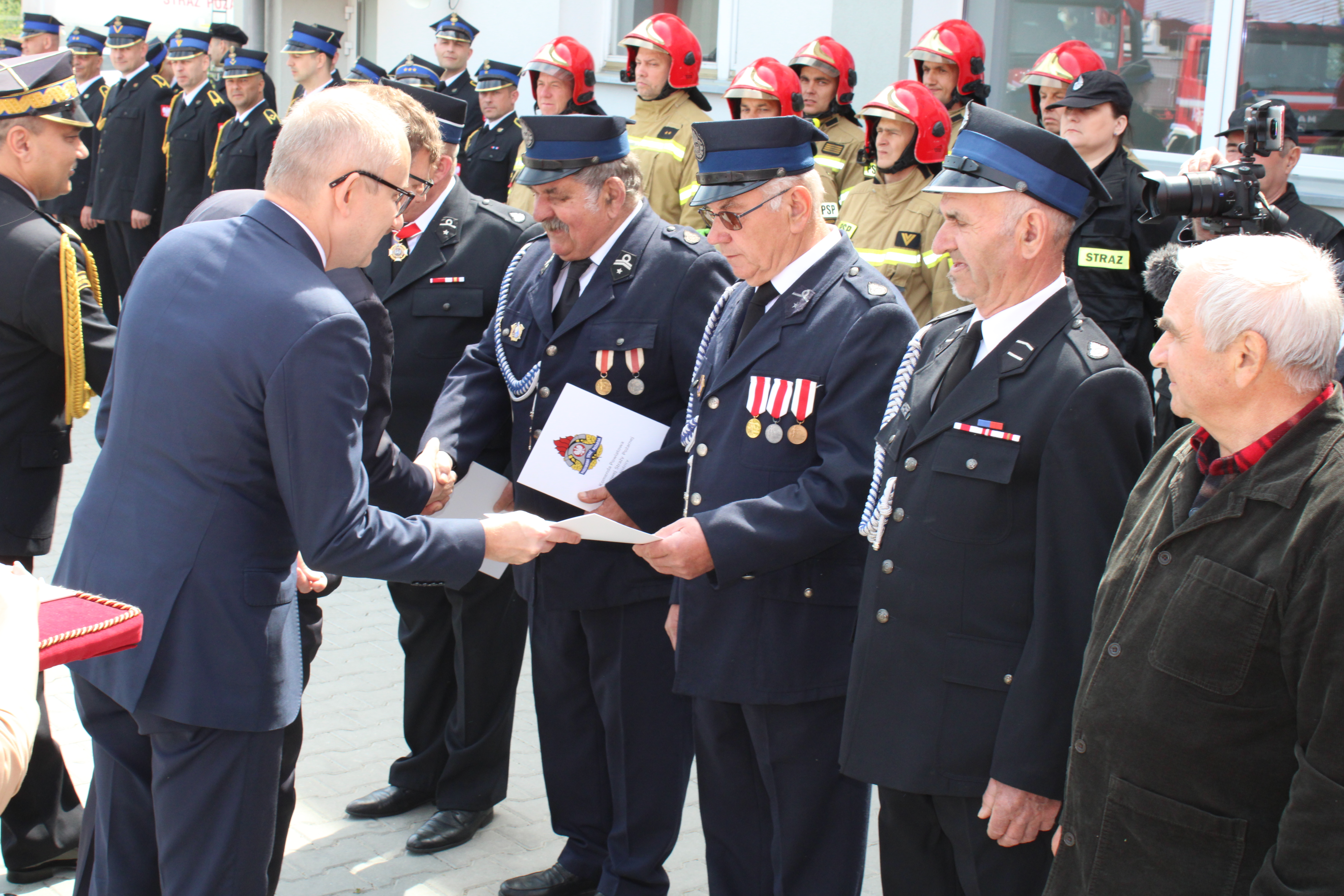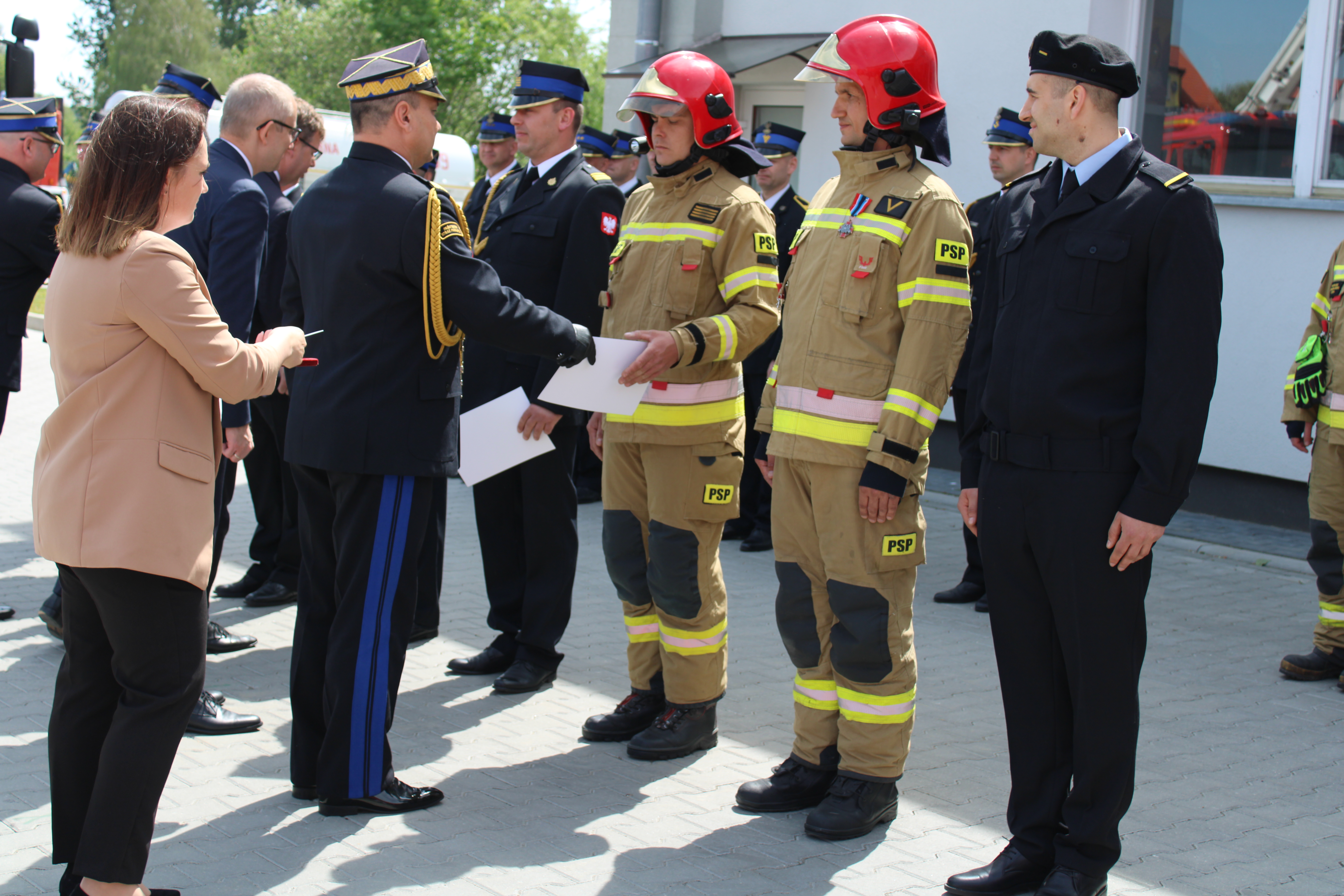 Następnie dokonano wręczenia odznaczeń, awansów i wyróżnień funkcjonariuszom Państwowej Straży Pożarnej oraz decyzji o przyznaniu świadczeń ratowniczych druhom z jednostek Ochotniczych Straży Pożarnych.