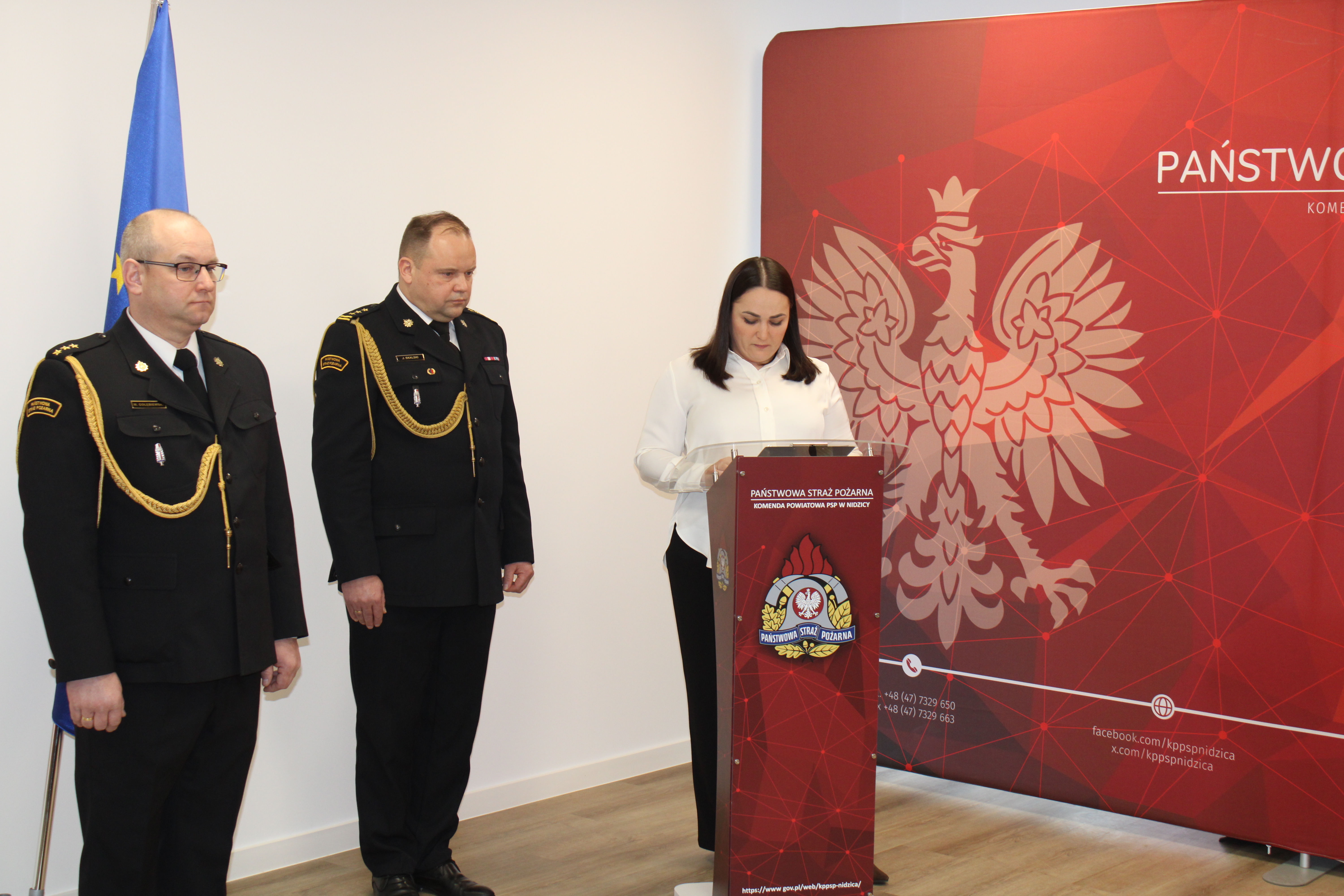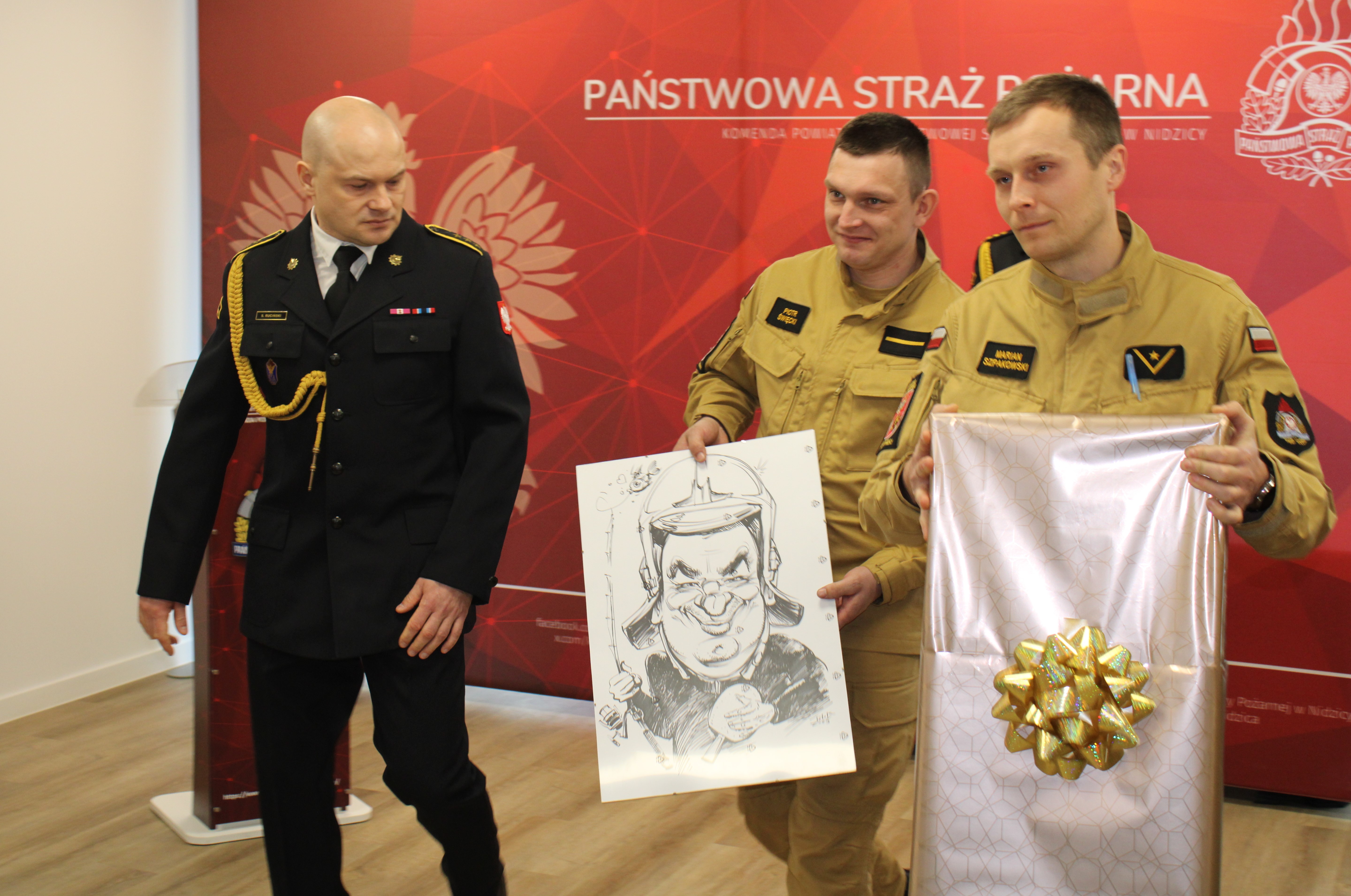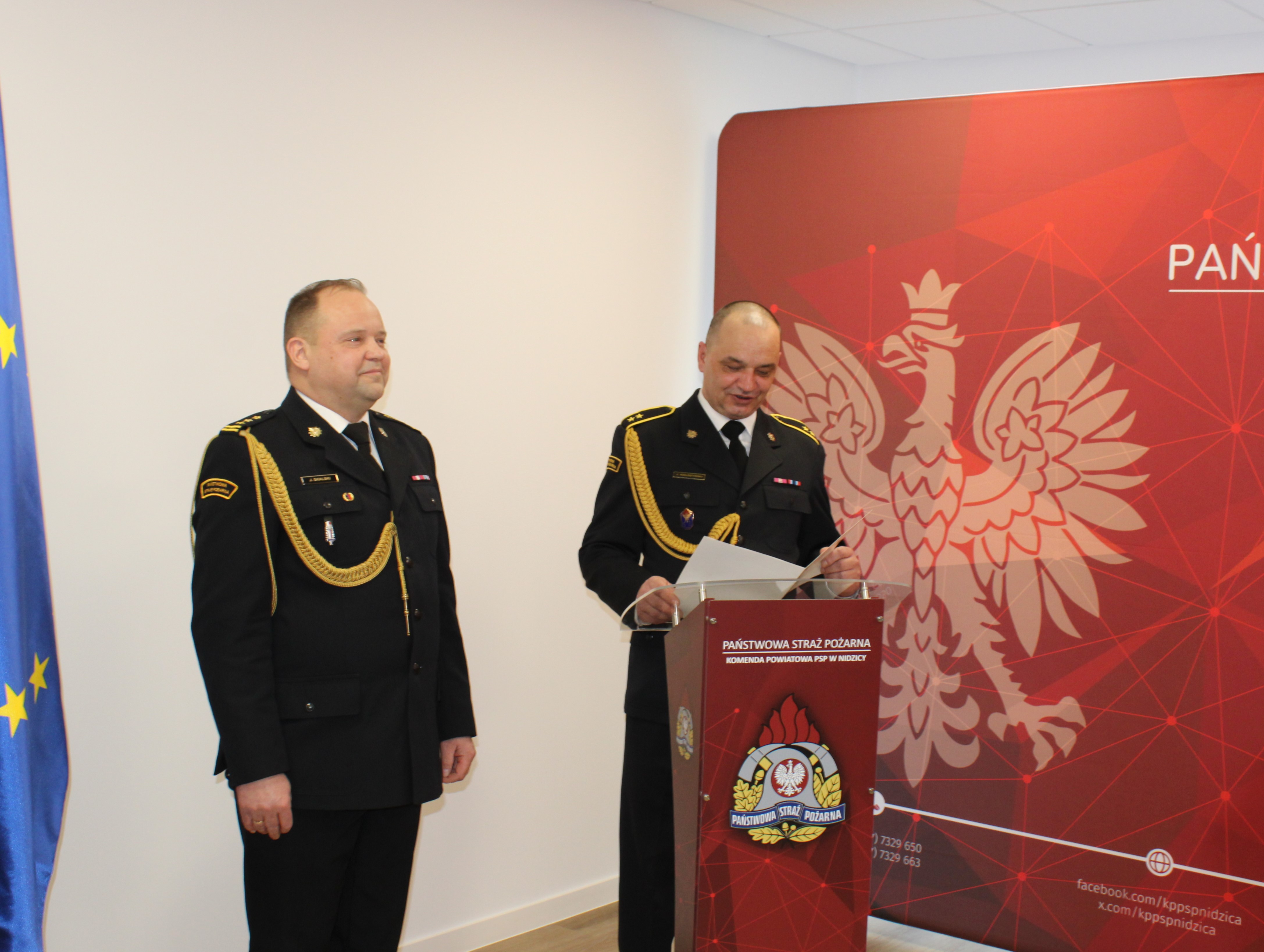 Komendant Powiatowy PSP w Nidzicy st.bryg. Jarosław Skalski podziękował odchodzącemu ze służby funkcjonariuszowi za wzorowe wywiązywanie się z obowiązków służbowych, koleżeńską postawę i godne reprezentowanie komendy na zewnątrz. st. asp. Jacek Kołodyński rozpoczął służbę w Państwowej Straży Pożarnej 17 kwietnia 2001 roku. Przez ponad dwie dekady wykonywał różne zadania, zdobywając bogate doświadczenie oraz coraz wyższe kwalifikacje zawodowe. Jego ścieżka kariery obejmowała zarówno stanowiska ratownicze, jak i specjalistyczne, co przyczyniło się do rozwoju jego umiejętności i kompetencji. W czasie służby brał bezpośredni udział w licznych akcjach ratowniczo-gaśniczych zarówno jako ratownik, kierowca, operator sprzętu i dowódca, przyczyniając się do uratowania wielu osób i mienia. st. asp. Jacek Kołodyński z dużymi sukcesami reprezentował Komendę Powiatową Państwowej Straży Pożarnej w Nidzicy w wielu turniejach w tenisie stołowym zdobywając miejsca na podium Mistrzostw Województwa Warmińsko-Mazurskiego Strażaków oraz kultywując kulturę fizyczną w komendzie.