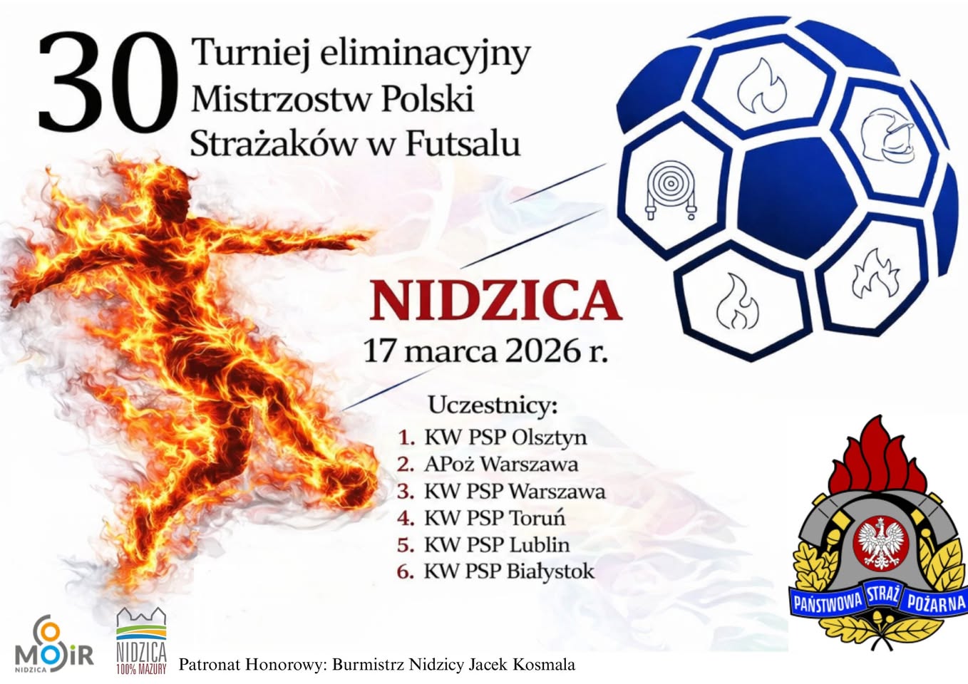 Zapraszamy do udziału w Turnieju Eliminacyjnym 30. Mistrzostw Polski Strażaków PSP w Futsalu, który odbędzie się 17 marca 2026 r. w Nidzicy. Zawody rozegrane zostaną na hali widowiskowo-sportowej w Nidzicy, ul. Polna 8. Start wydarzenia: godz. 8:15 - uroczyste otwarcie turnieju.