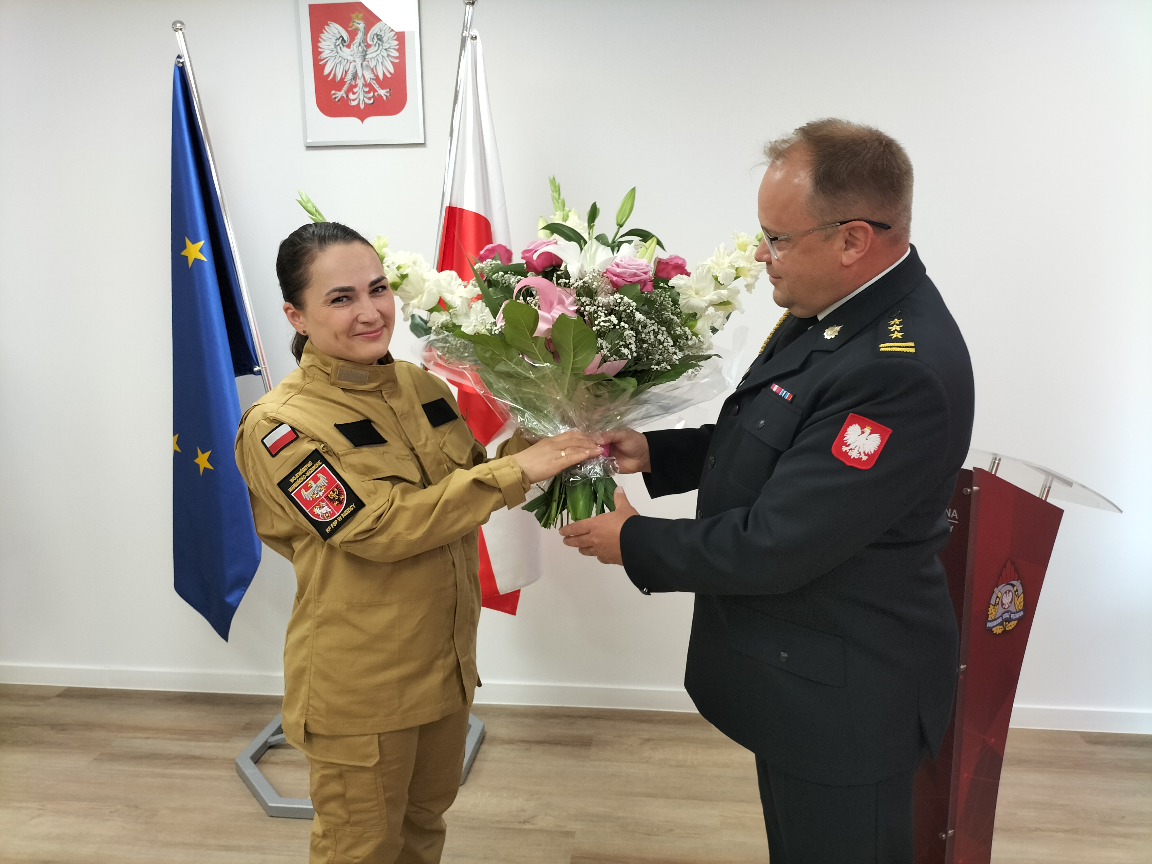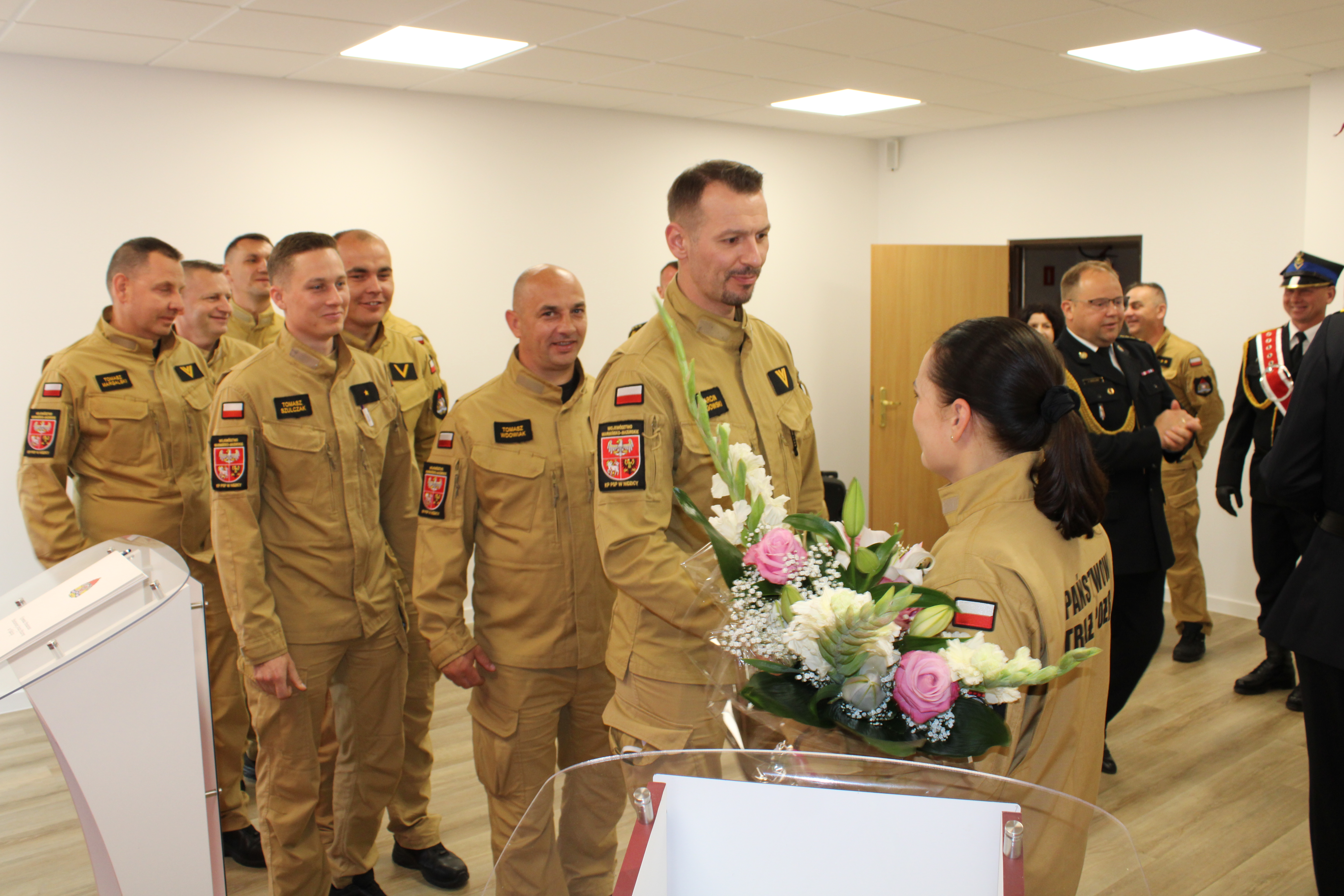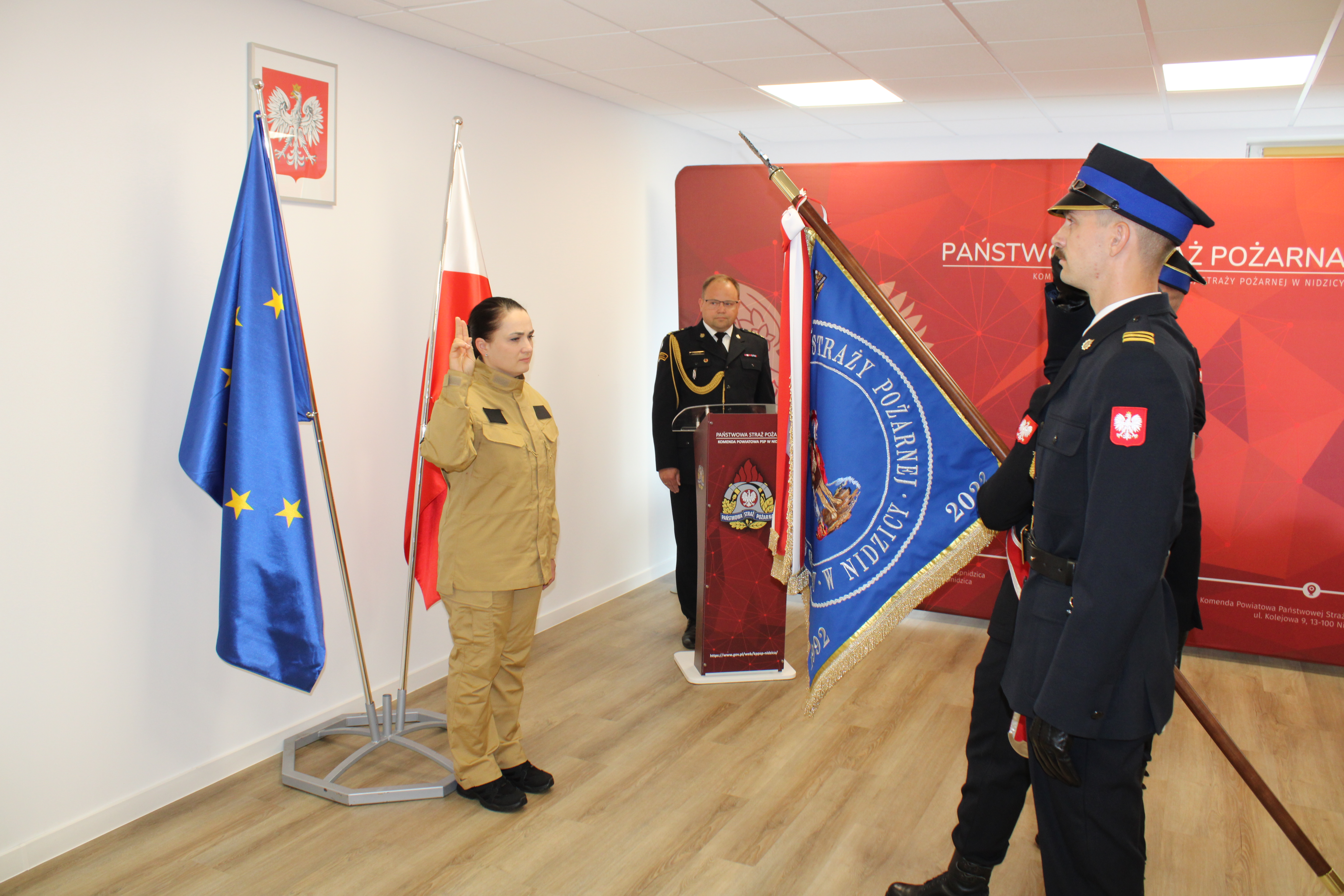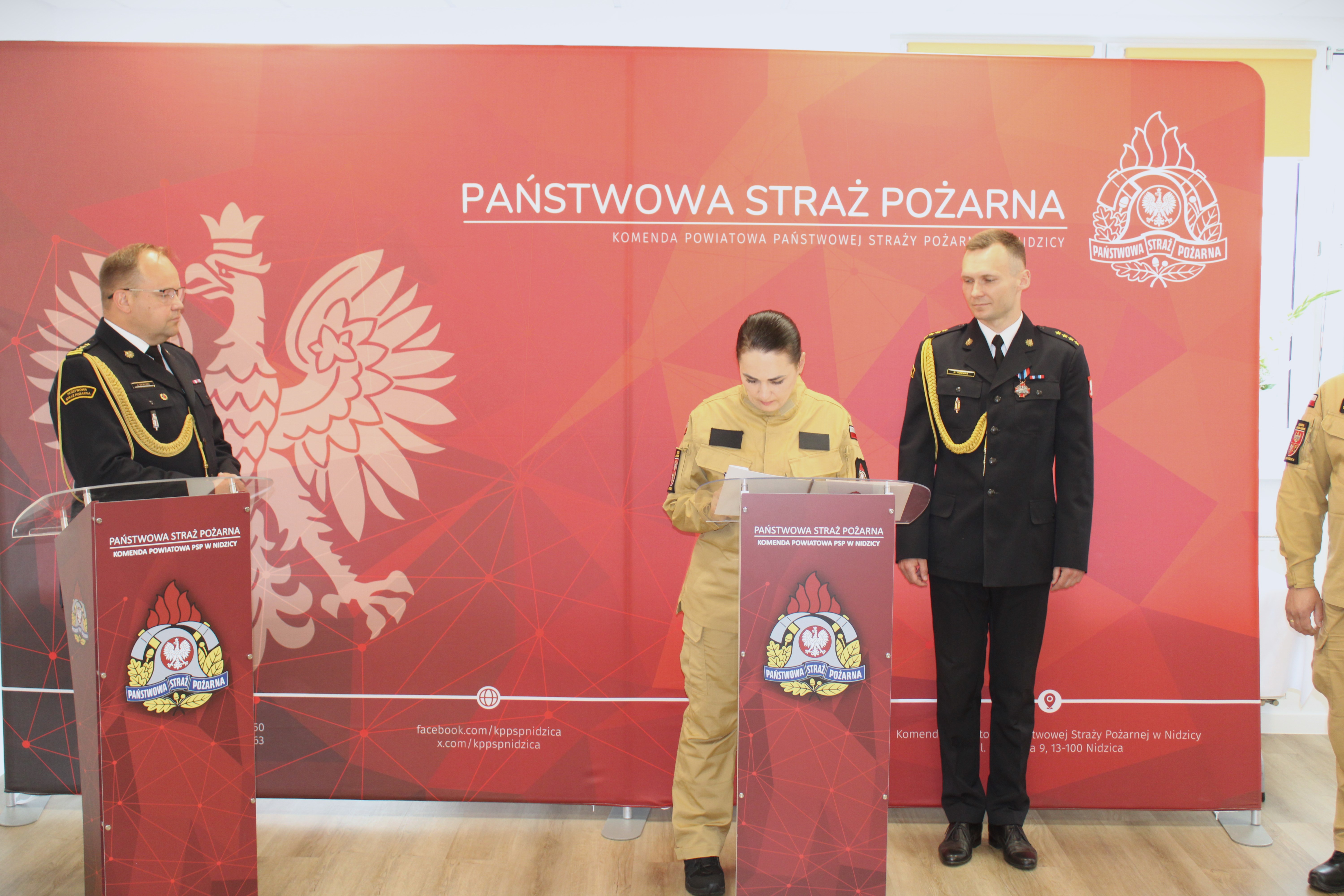 Uroczystość z udziałem pocztu sztandarowego Komendy Powiatowej Państwowej Straży Pożarnej w Nidzicy poprowadził Zastępca Komendanta PSP st. kpt. Nikodem Woźniak. Po ślubowaniu nastąpiło podpisanie oraz uroczyste wręczenie aktu ślubowania.