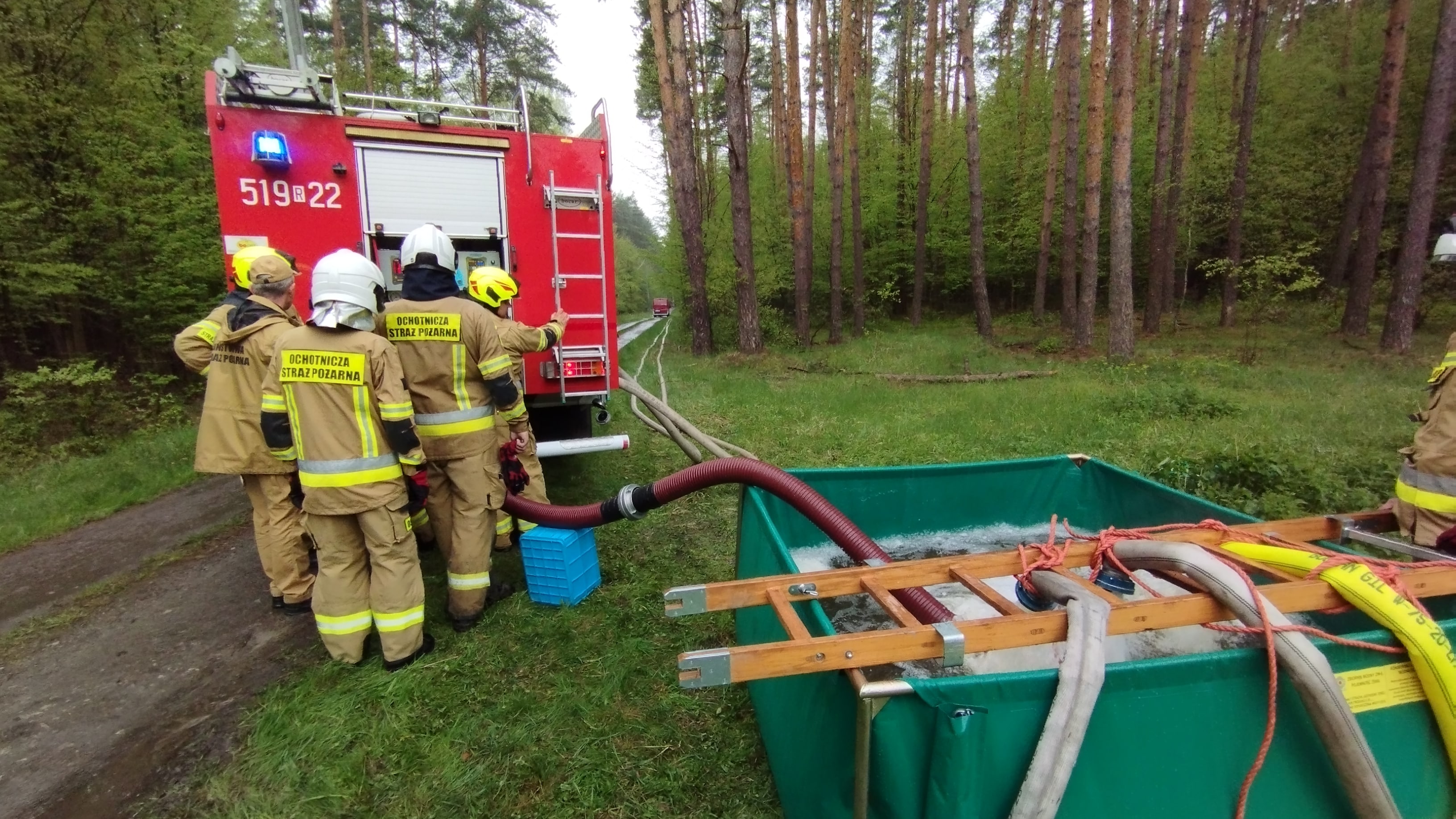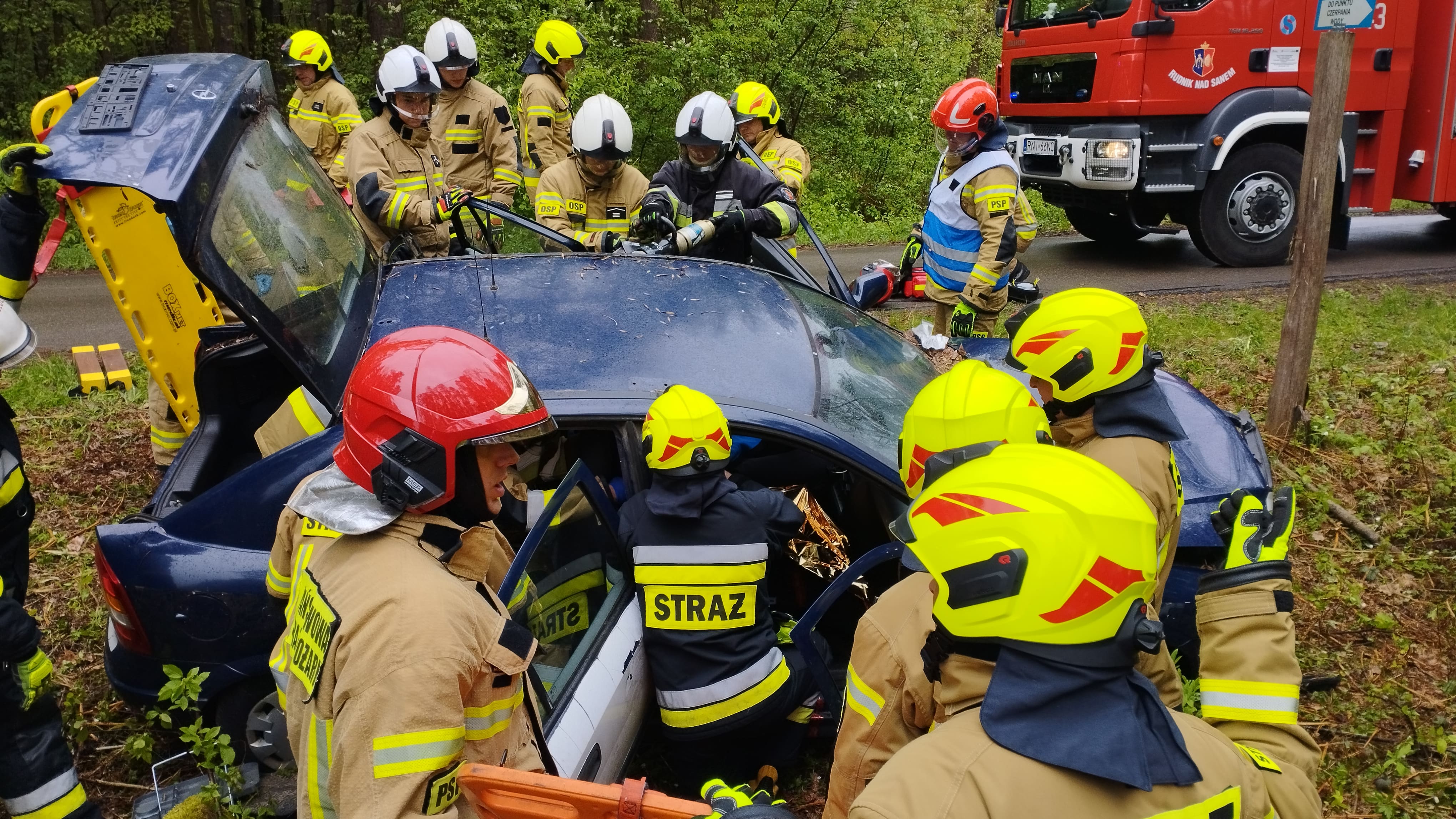 W ramach doskonalenia prowadzenia działań ratowniczo-gaśniczych oraz poprawy współdziałania pomiędzy podmiotami krajowego systemu ratowniczo – gaśniczego, Komenda Powiatowa Państwowej Straży Pożarnej w Nisku zorganizowała i przeprowadziła w dniu 25 kwietnia br ćwiczenia międzygminne połączone z przeglądem sprzętu dla jednostek ochrony przeciwpożarowej z terenu powiatu niżańskiego. Ćwiczenia zostały przeprowadzone na terenie Nadleśnictwa Rudnik, Leśnictwo Czarny Las, a w ich ramach przećwiczone zostały zagadnienia związane z taktyką gaszenia pożarów, ratownictwem technicznym oraz z zakresu kwalifikowanej pierwszej pomocy. W trakcie manewrów przećwiczono dwa epizody: wypadek samochodu osobowego z trzema osobami poszkodowanymi, w tym niemowlę i kobieta w ciąży oraz pożar lasu w odległości około 500 m od szkółki leśnej z koniecznością budowy stanowiska wodnego na rzece Rudna. W ćwiczeniach udział wzięły następujące siły i środki: