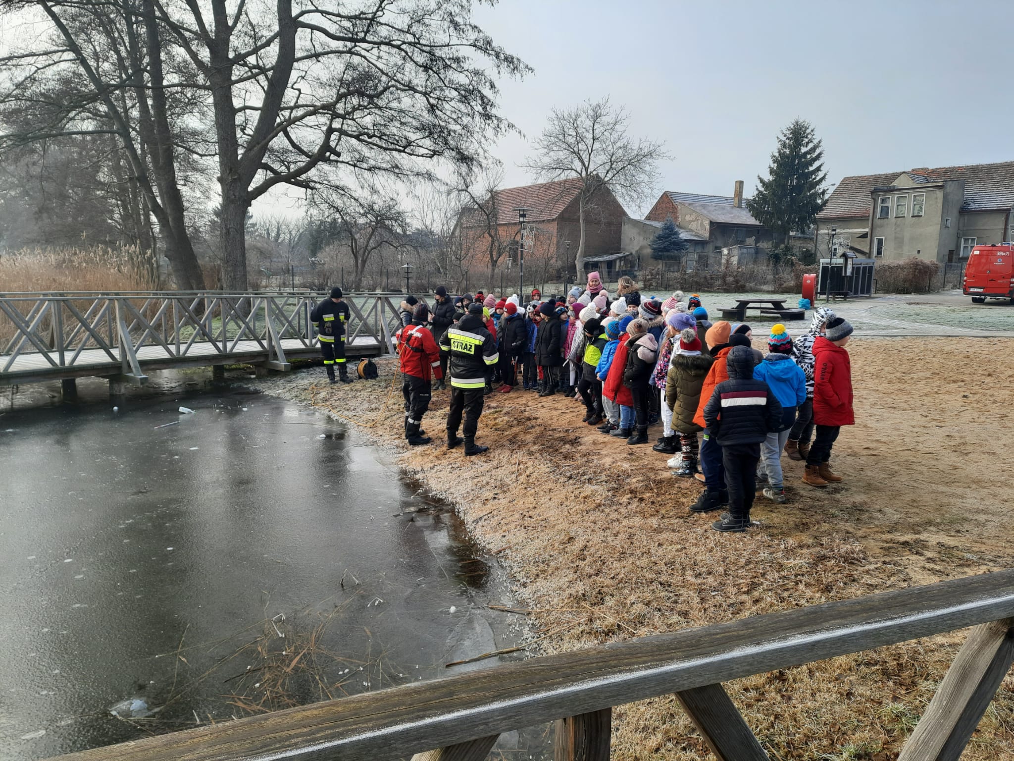Przed zbliżającymi się feriami zimowymi strażacy z Komendy Powiatowej Państwowej Straży Pożarnej w Nowej Soli wraz z druhami z Ochotniczej Straży Pożarnej z Lubięcina przeprowadzili zajęcia edukacyjne dla dzieci z Zespołu Edukacyjnego w Lubięcinie, którym przekazano wiedzę na temat zasad zachowania bezpieczeństwa podczas wypoczynku zimowego. W ramach szkolenia strażacy wykonali pokaz jak należy się zachować w przypadku załamania się lodu oraz prawidłowego alarmowania służb ratunkowych.
