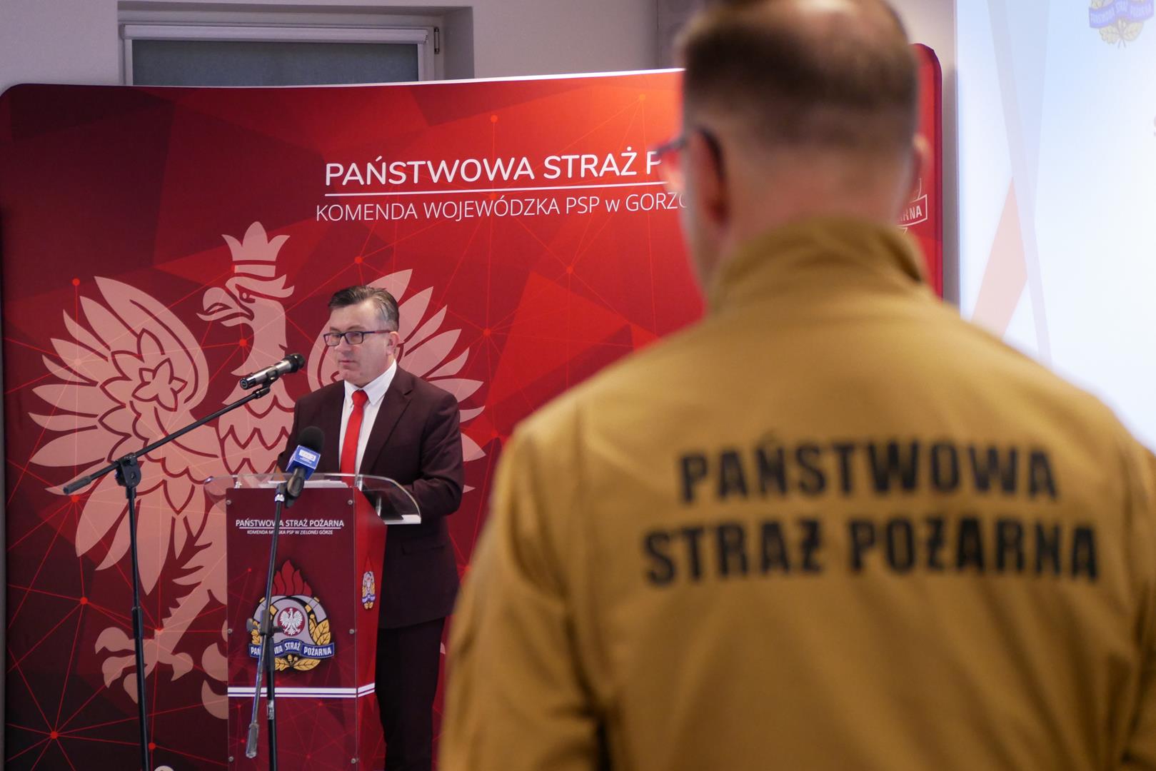 Gospodarze spotkania, Lubuski Komendant Wojewódzki st. bryg. Patryk Maruszak, Zastępca Lubuskiego Komendanta Wojewódzkiego st. bryg. Janusz Drozda, Prezes Zarządu Wojewódzkiego Funduszu Ochrony Środowiska i Gospodarki Wodnej w Zielonej Górze Mariusz Herbut oraz Wiceprezes WFOSiGW Ireneusz Madej, zaprezentowali zebranym gościom pozyskany sprzęt oraz omówili szczegółowo współpracę w 2022 roku.