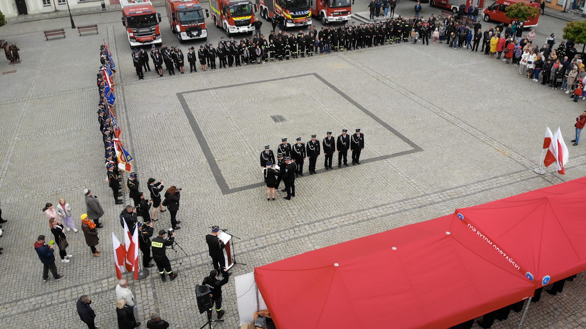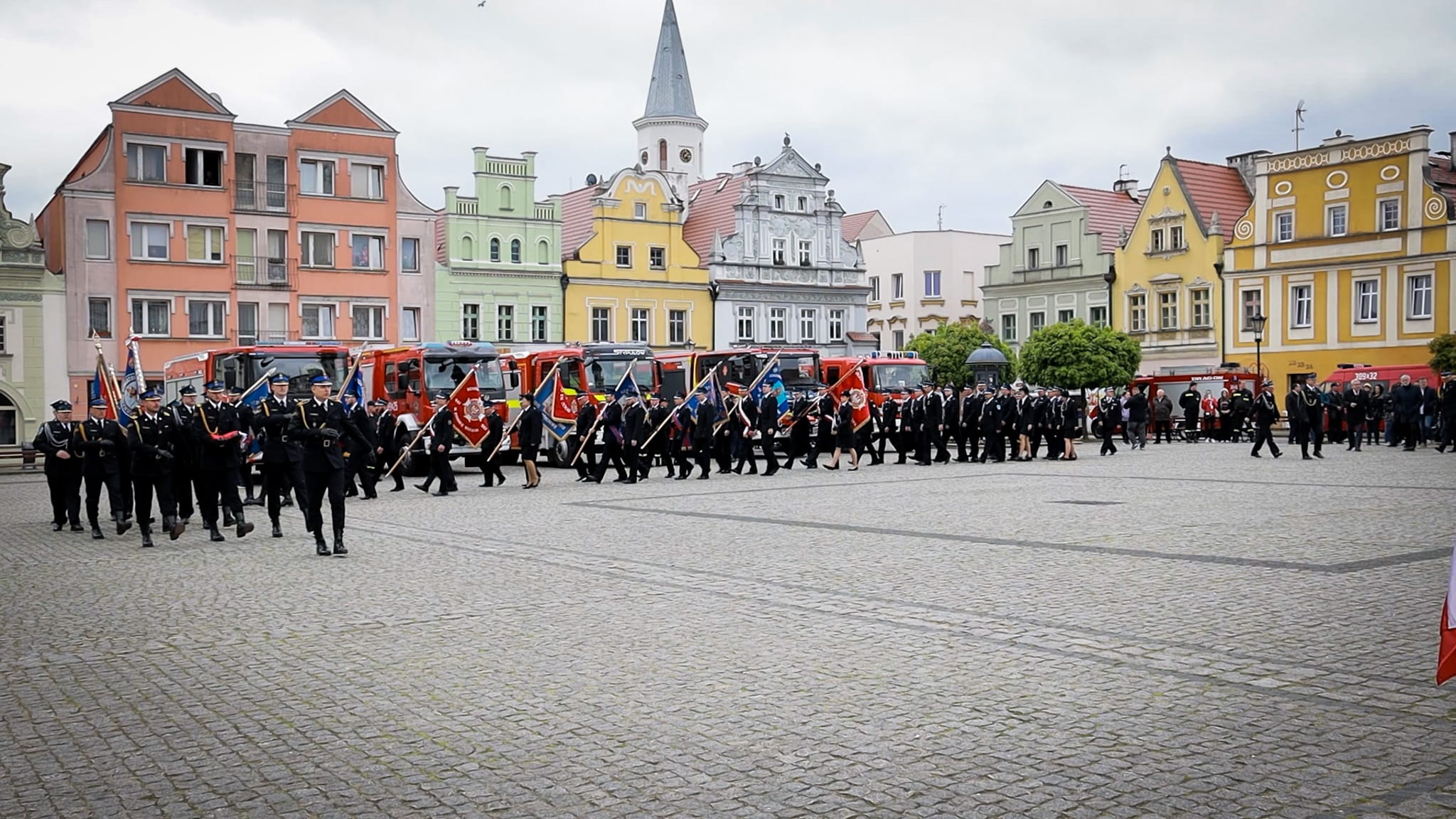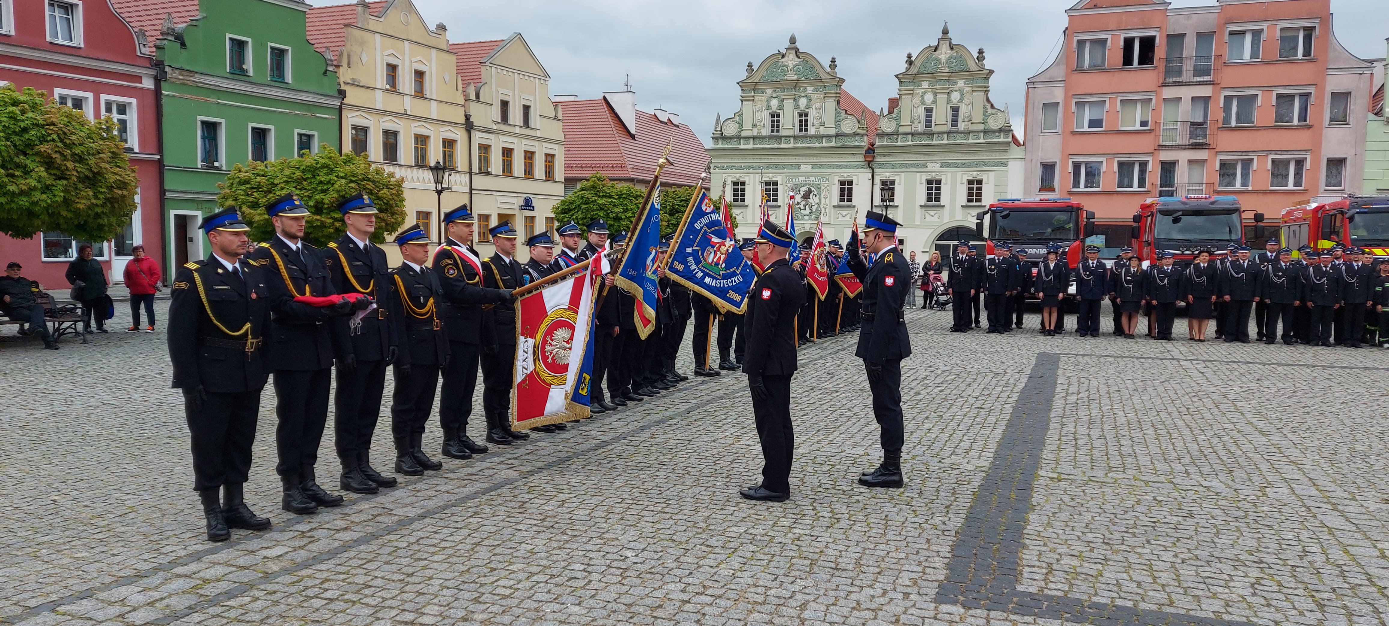 w intencji strażaków i ich rodzin. Następnie pododdziały i zaproszeni goście przemaszerowali na Rynek miasta, gdzie odbył się uroczysty apel, rozpoczęty od złożenia meldunku przed Zastępcą Lubuskiego Komendanta Wojewódzkiego Państwowej Straży Pożarnej st.bryg. Januszem Drozdą przez Dowódcę Uroczystości mł. asp. Artura Jaskulskiego.