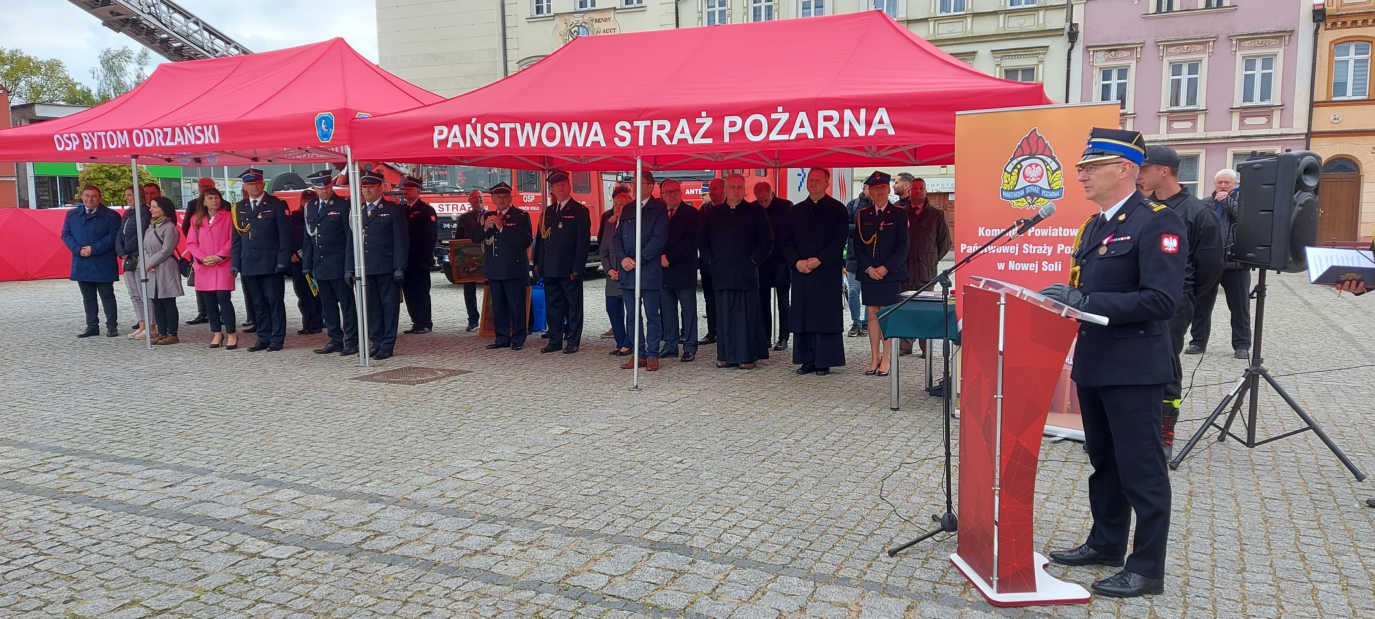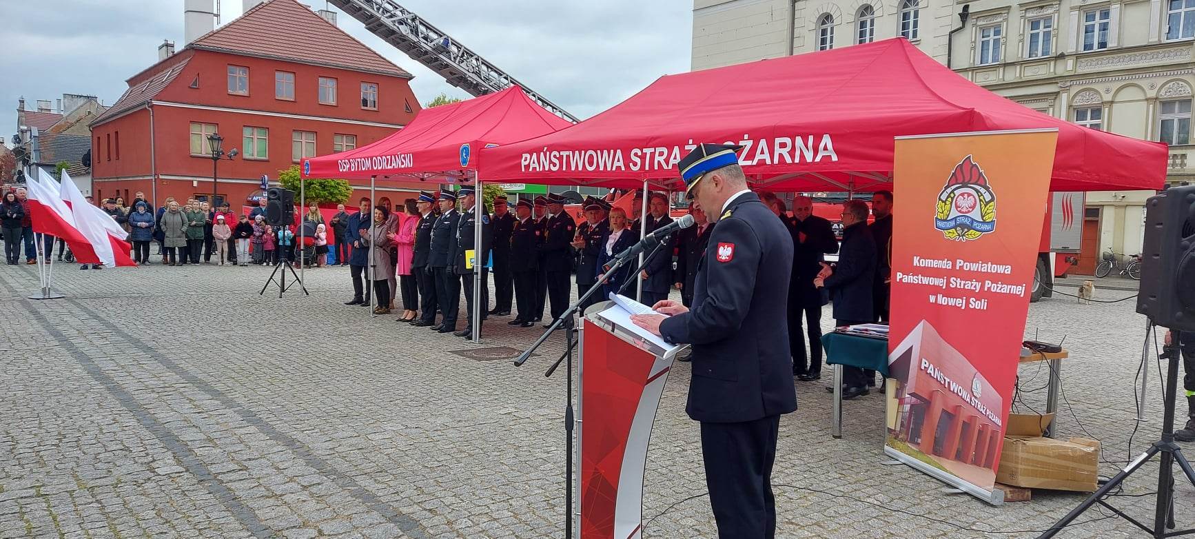 Po podniesieniu flagi państwowej oraz odegraniu Hymnu Państwowego Komendant Powiatowy Państwowej Straży Pożarnej w Nowej Soli bryg. Tomasz Duber przywitał przybyłych gości, a wśród nich: Senatora RP Wadima Tyszkiewicza, radnych sejmiku woj. Lubuskiego, Zastępcę Lubuskiego Komendanta Wojewódzkiego Państwowej Straży Pożarnej st. bryg. Janusza Drozdę, Wiceprezesa Zarządu Oddziału Wojewódzkiego Związku Ochotniczych Straży Pożarnych Rzeczypospolitej Polskiej Województwa Lubuskiego Druha Andrzeja Staroszczuka, Starostę Powiatu Nowosolskiego Iwonę Brzozowską, Prezydenta Miasta Nowej Soli Jacka Milewskiego, oraz wielu innych znamienitych gości począwszy od włodarzy gmin powiatu nowosolskiego, Prezesa Zarządu Oddziału Powiatowego Związku Ochotniczych Straży Pożarnych Rzeczypospolitej Polskiej w Nowej Soli druha Jarosława Intka przez reprezentantów innych służb współdziałających z Państwową i Ochotniczą Strażą Pożarną, oraz wszystkich zasłużonych dla pożarnictwa.