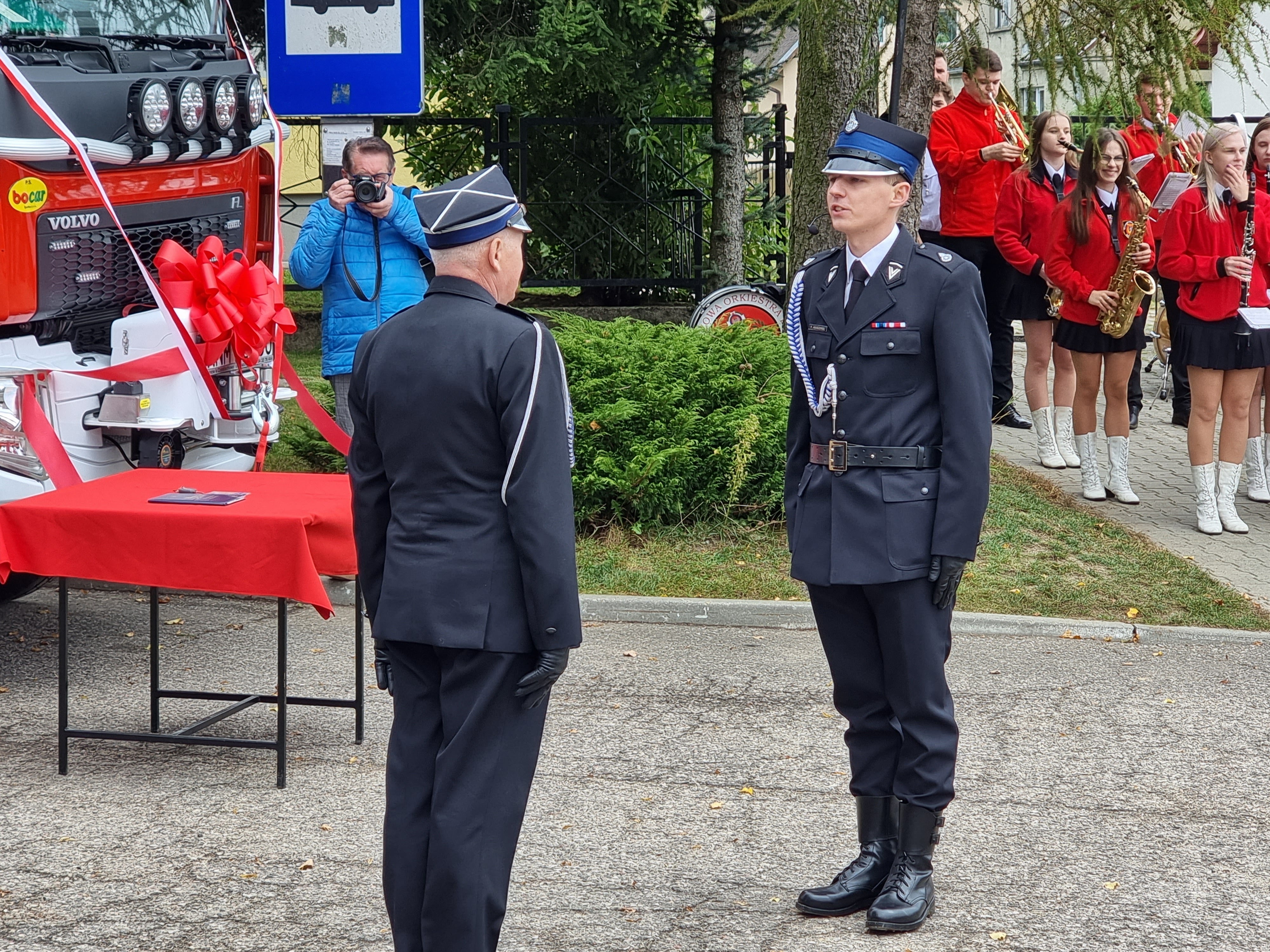 Uroczystego wręczenia kluczyków do samochodu dokonał dh. Tomasz Waruszewski Wójt Gminy Nowe Miasto Lubawskie w asyście st. bryg. Krzysztofa Mierzejewskiego Zastępcy Warmińsko - Mazurskiego Komendanta Wojewódzkiego PSP i dha Gustawa Marka Brzezina Marszałka Województwa Warmińsko-Mazurskiego.