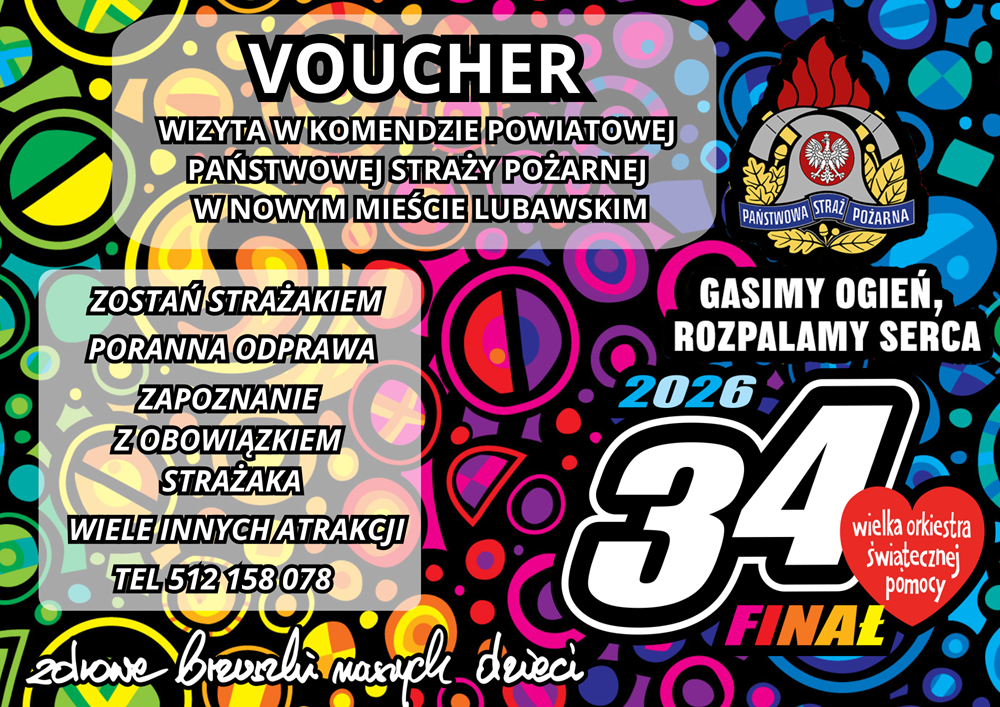 Komendant Powiatowy Państwowej Straży Pożarnej wraz z funkcjonariuszami włącza się w 34. Finał Wielkiej Orkiestry Świątecznej Pomocy, przekazując na aukcję wyjątkowe vouchery i czujki tlenku węgla, które będą licytowane podczas tegorocznego finału. Vouchery dedykowane są dla dzieci, sympatyków pożarnictwa, które uprawniają do jednodniowego zwiedzania i zapoznania się ze służbą w strażackim mundurze. Natomiast czujniki tlenku węgla są przydatnymi urządzeniami, które z pewnością poprawią bezpieczeństwo mieszkańców.