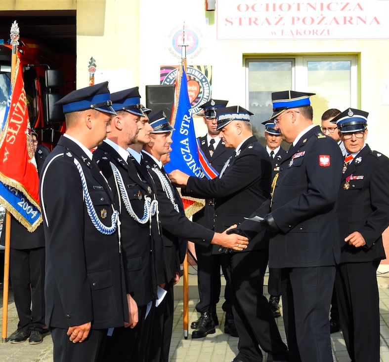 W dalszej części uroczystości przedstawiono rys historyczny OSP Łąkorz oraz zostały odczytane postanowienia, wg których 15 strażaków tej jednostki zostało odznaczonych medalami „Za Zasługi Dla Pożarnictwa” a jednemu strażakowi nadano odznakę „Strażak Wzorowy”
