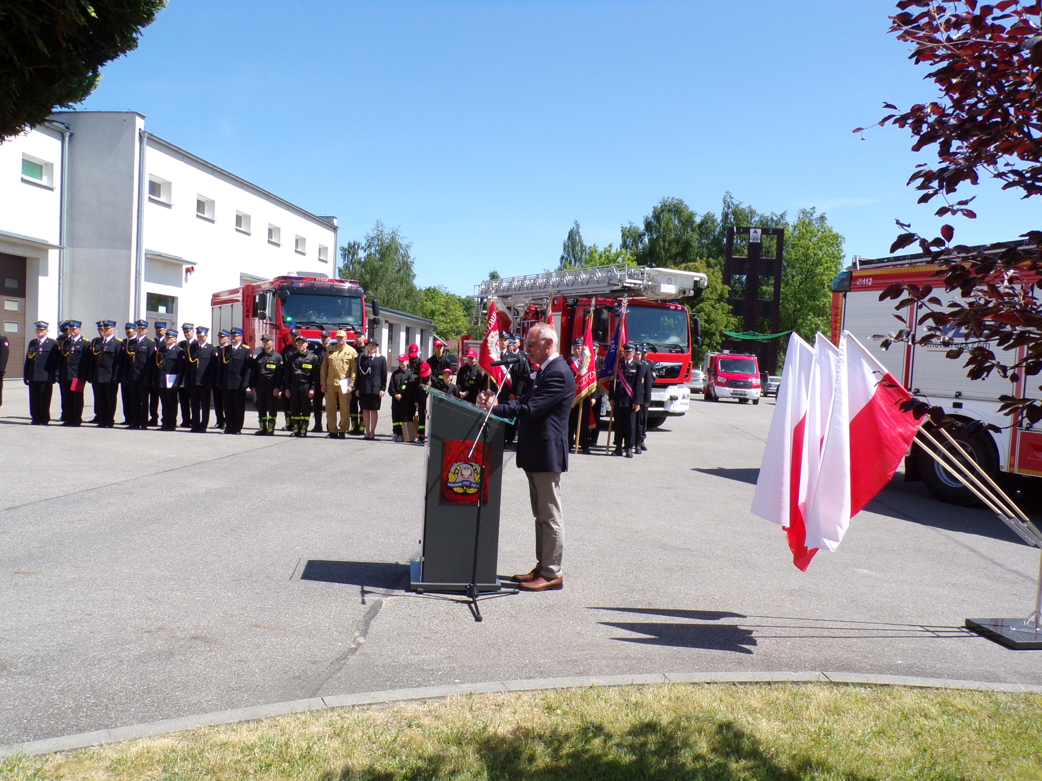 Uroczysty apel rozpoczął się złożeniem meldunku st. bryg. Tomaszowi Ostrowskiemu Zastępcy Warmińsko-Mazurskiego Komendanta Wojewódzkiego Państwowej Straży Pożarnej, który dokonał przeglądu pododdziałów i przywitał się z pocztami sztandarowymi. Następnie podniesiono flagę państwową i odegrano hymn państwowy.