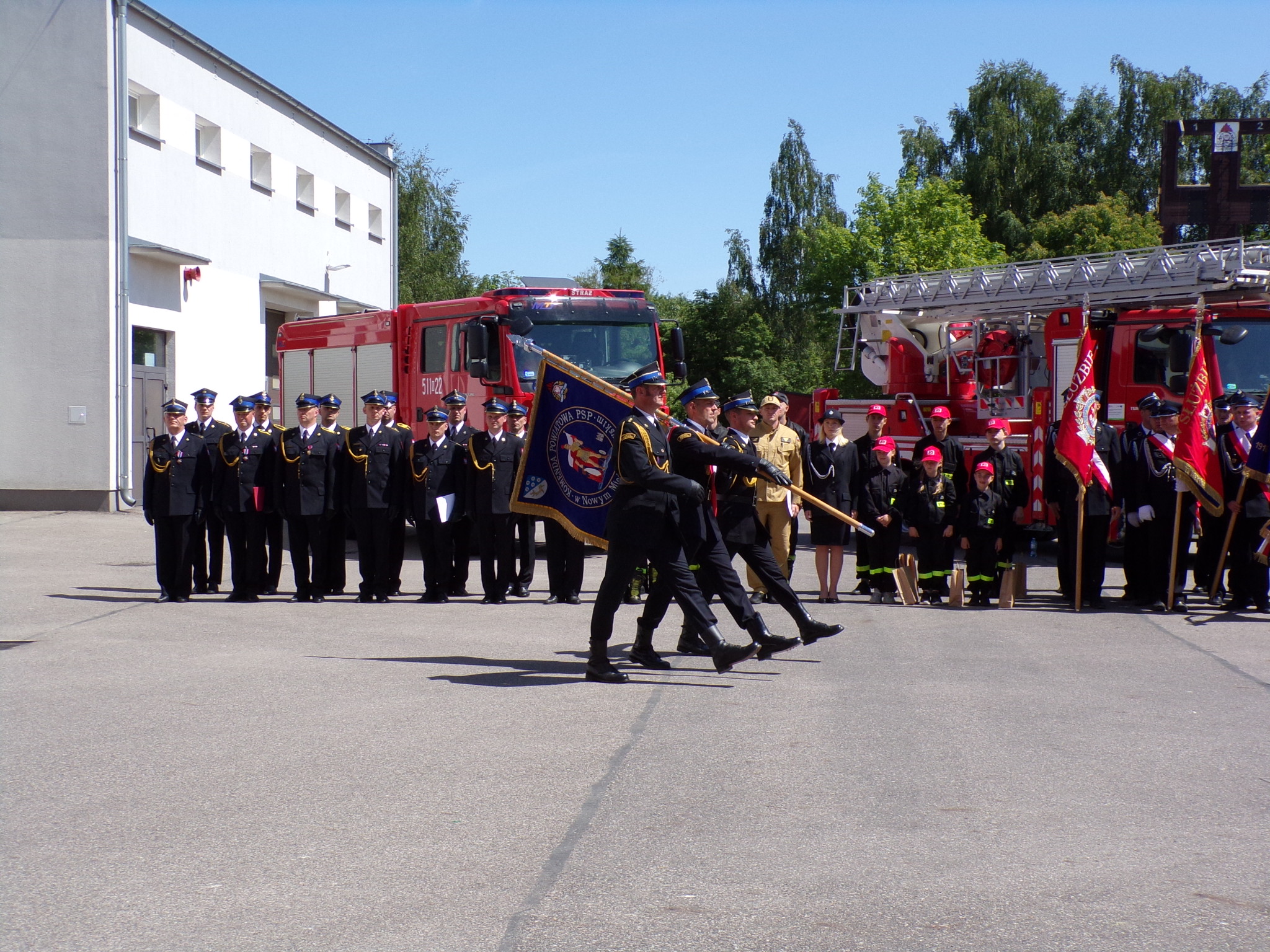 Uroczystość zakończyła się odprowadzeniem sztandaru Komendy Powiatowej PSP w Nowym Mieście Lub. oraz meldunkiem o zakończeniu uroczystego apelu.