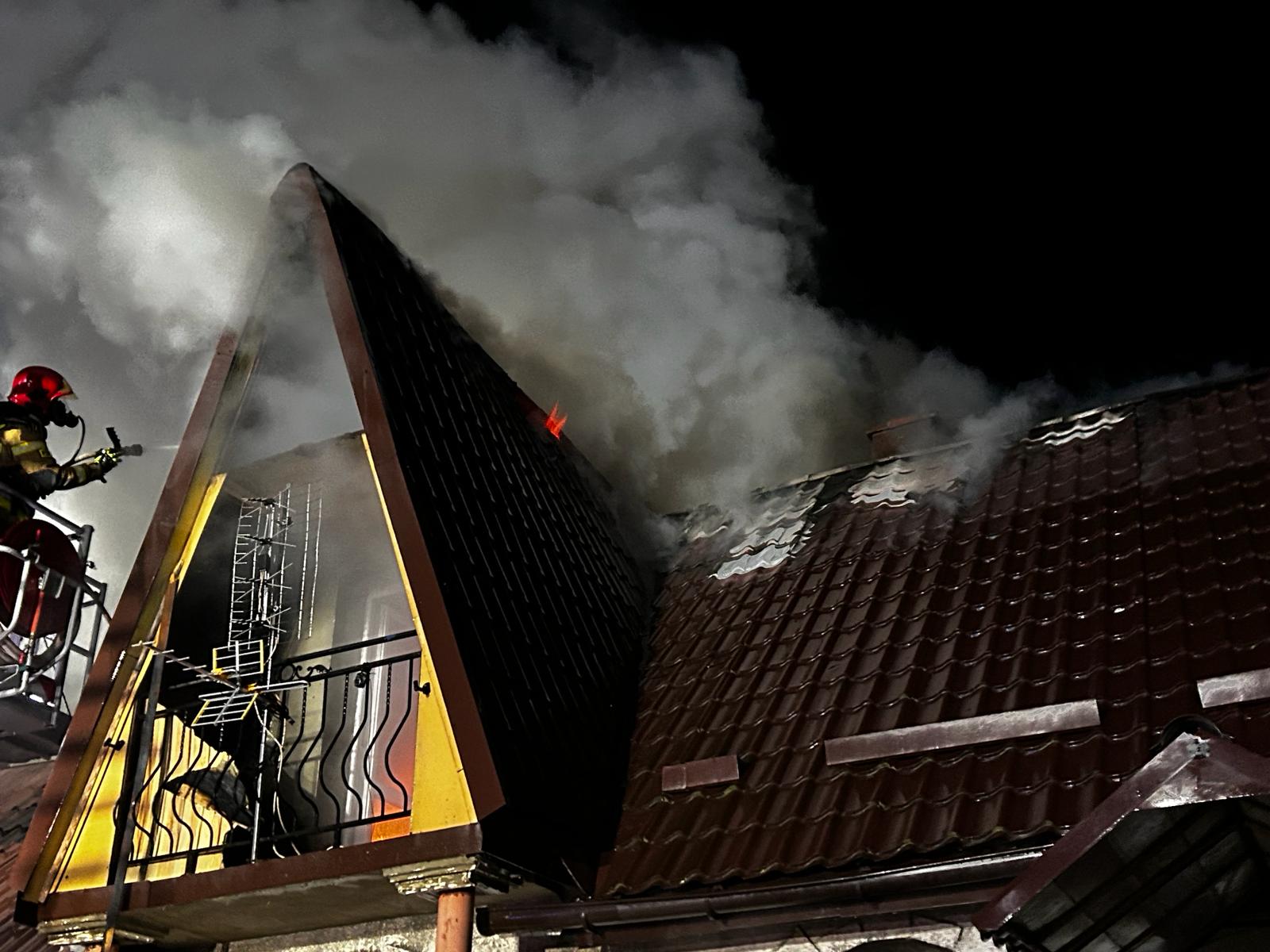 Po przybyciu na miejsce zdarzenia strażacy stwierdzili, że pożarem objęte jest poddasze oraz dach budynku mieszkalnego. Działania zastępów straży pożarnej polegały w szczególności na pracach rozbiórkowych konstrukcji dachu i podawaniu prądów wody na źródło pożaru.