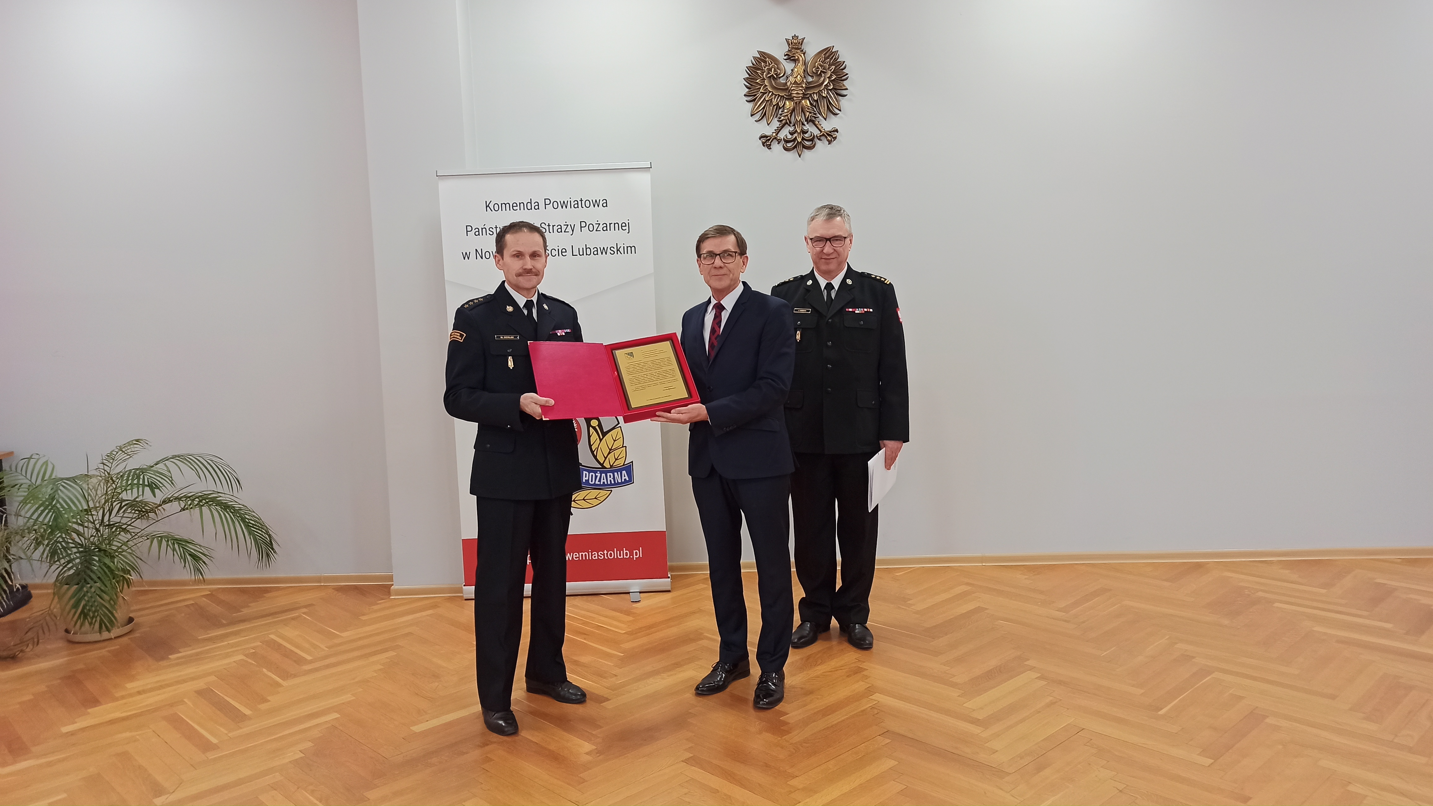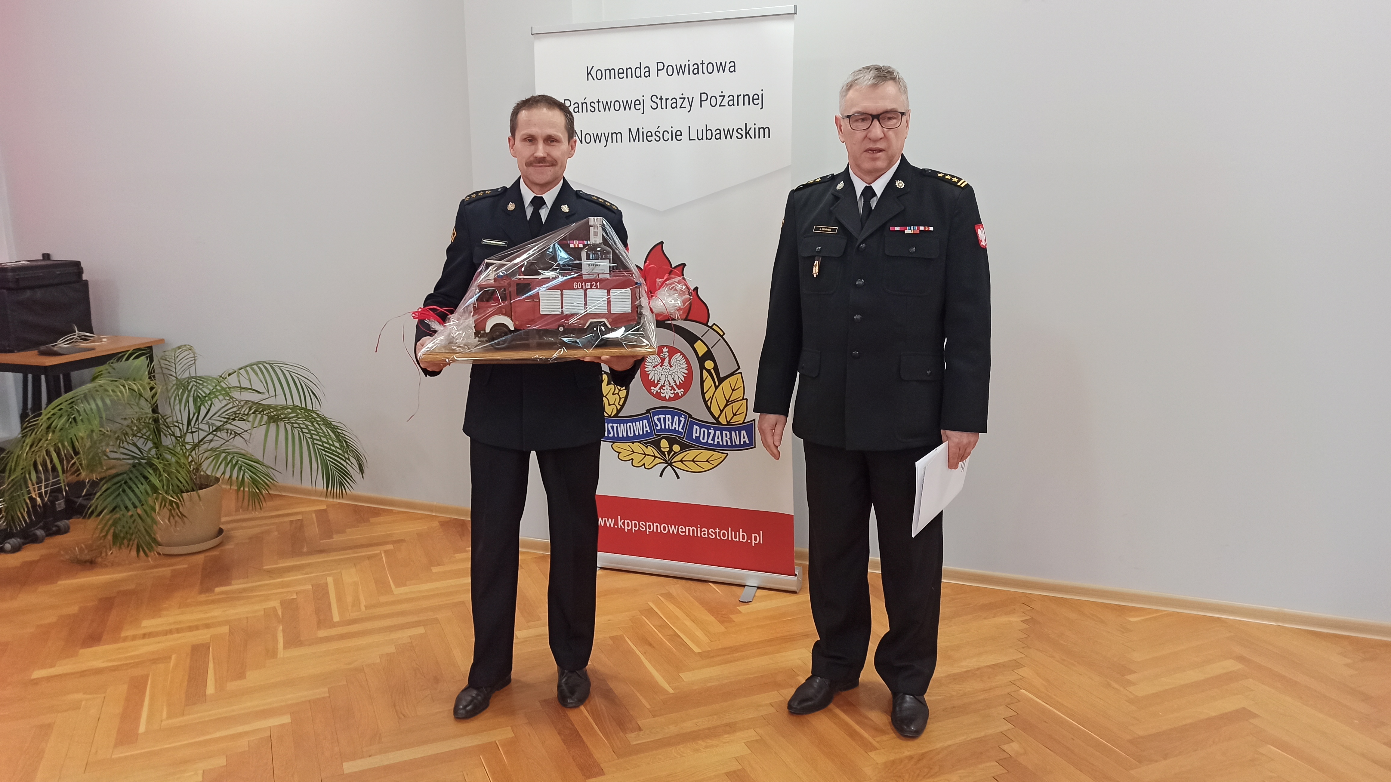 Słowa podziękowania za ponad 31 lat służby na rzecz ochrony przeciwpożarowej oraz życzenia zdrowia i pomyślności złożył mł. bryg. Krzysztof Szałkowski Komendant Powiatowy PSP w NML oraz st. bryg. Józef Dobies Zastępca Komendanta Powiatowego PSP w NML. Również słowa podziękowania za trudną, wieloletnią służbę złożył odchodzącemu funkcjonariuszowi uczestniczący w uroczystości Starosta Nowomiejski.