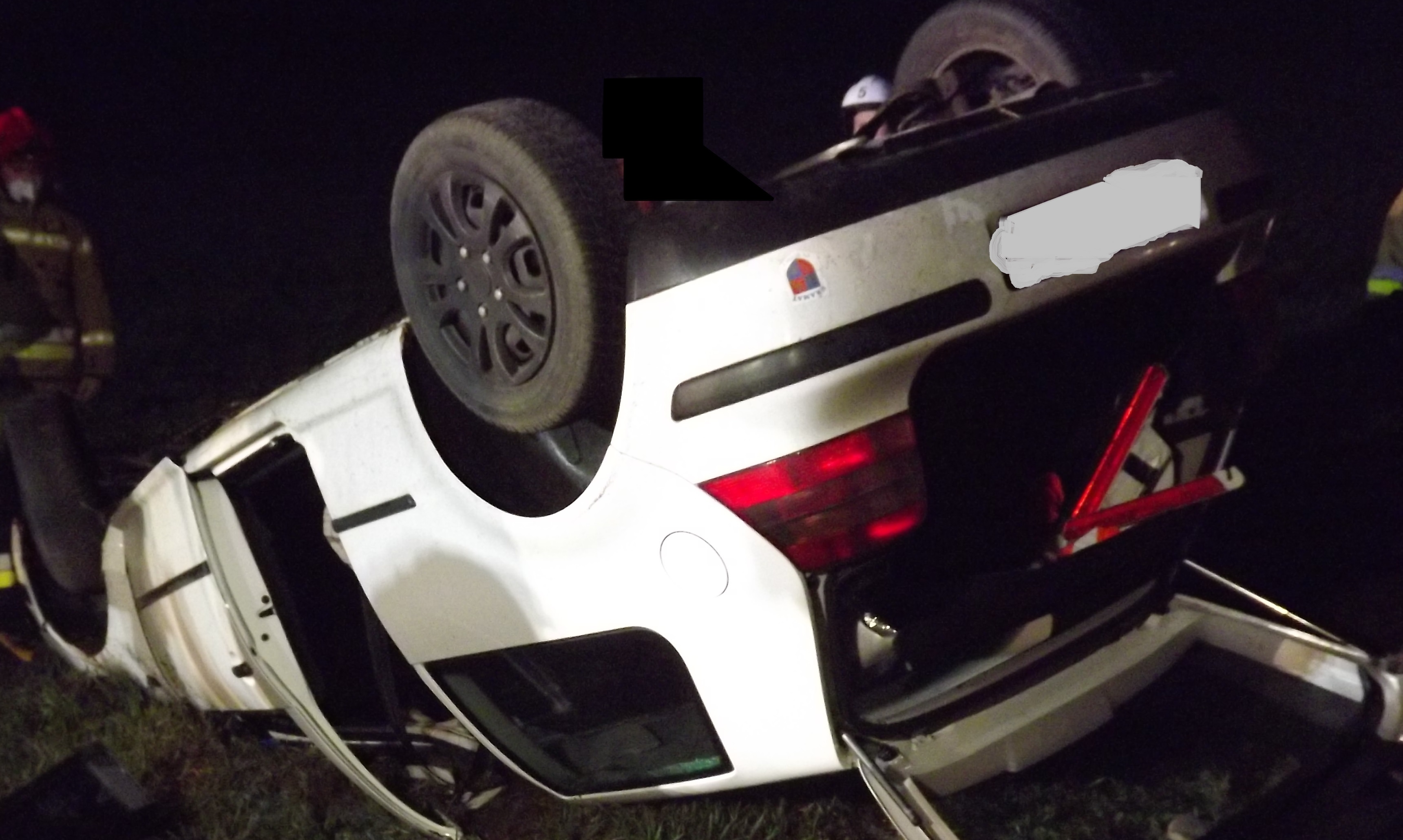 Po przybyciu na miejsce zdarzenia zastępów straży pożarnej w wyniku rozpoznania ustalono, że samochód osobowy uderzył w drzewo, na skutek uderzenia dachował. Pojazdem podróżowały dwie osoby. Działania straży polegały na zabezpieczeniu miejsca zdarzenia oraz oświetleniu miejsca zdarzenia.