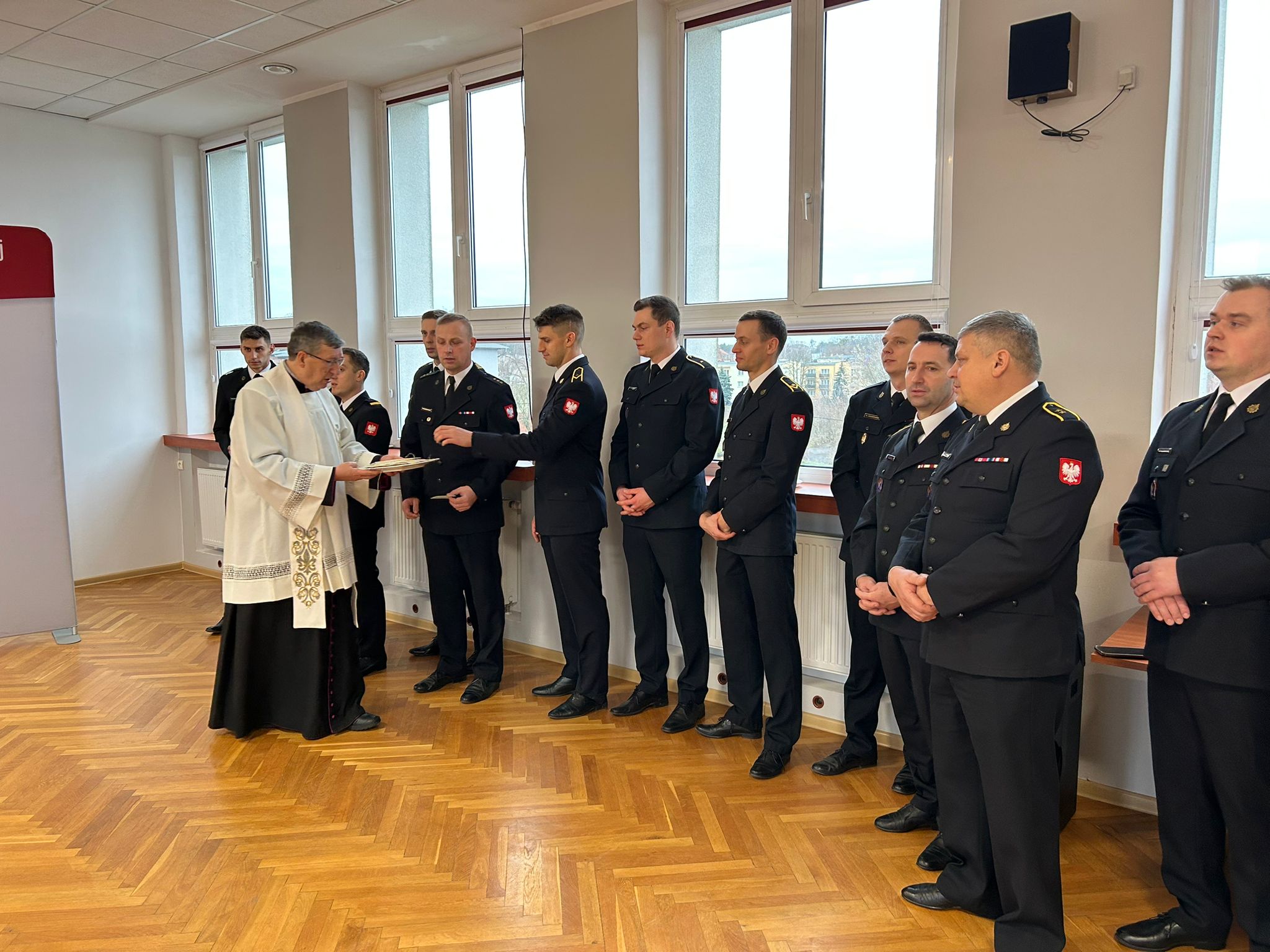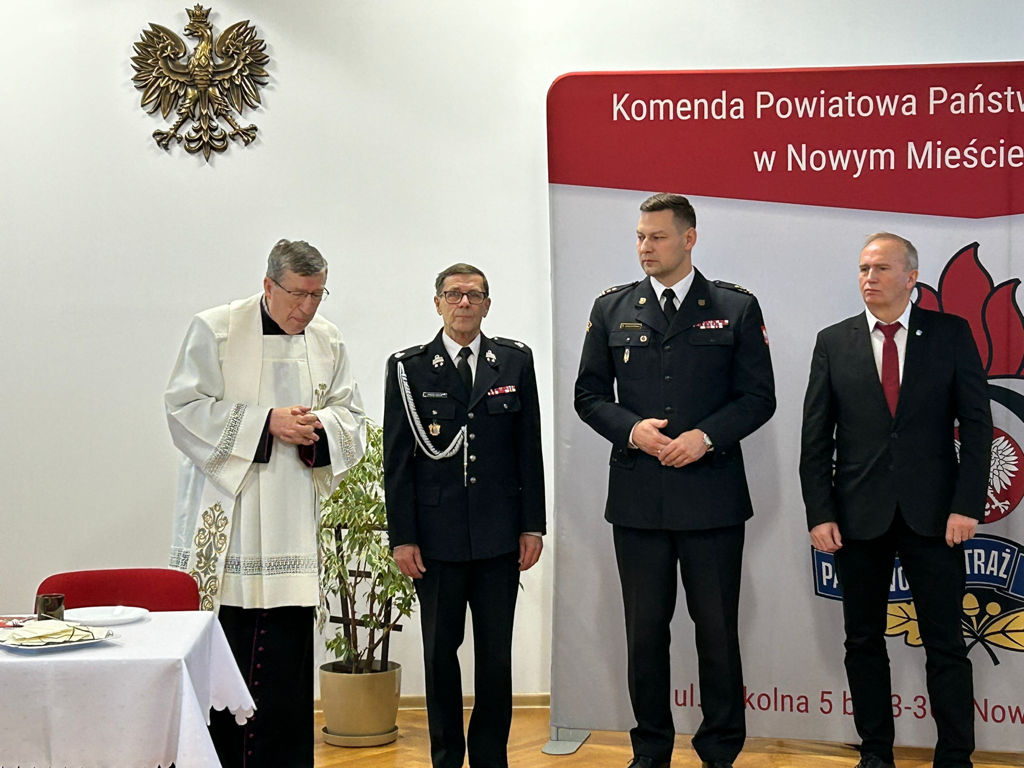 Boże błogosławieństwo przekazał obecny na spotkaniu ksiądz kanonik Zbigniew Markowski, który po modlitwie w swoim słowie podkreślił znaczenie braterstwa i wzajemnego wsparcia w strażackiej służbie dla dobra bliźnich.