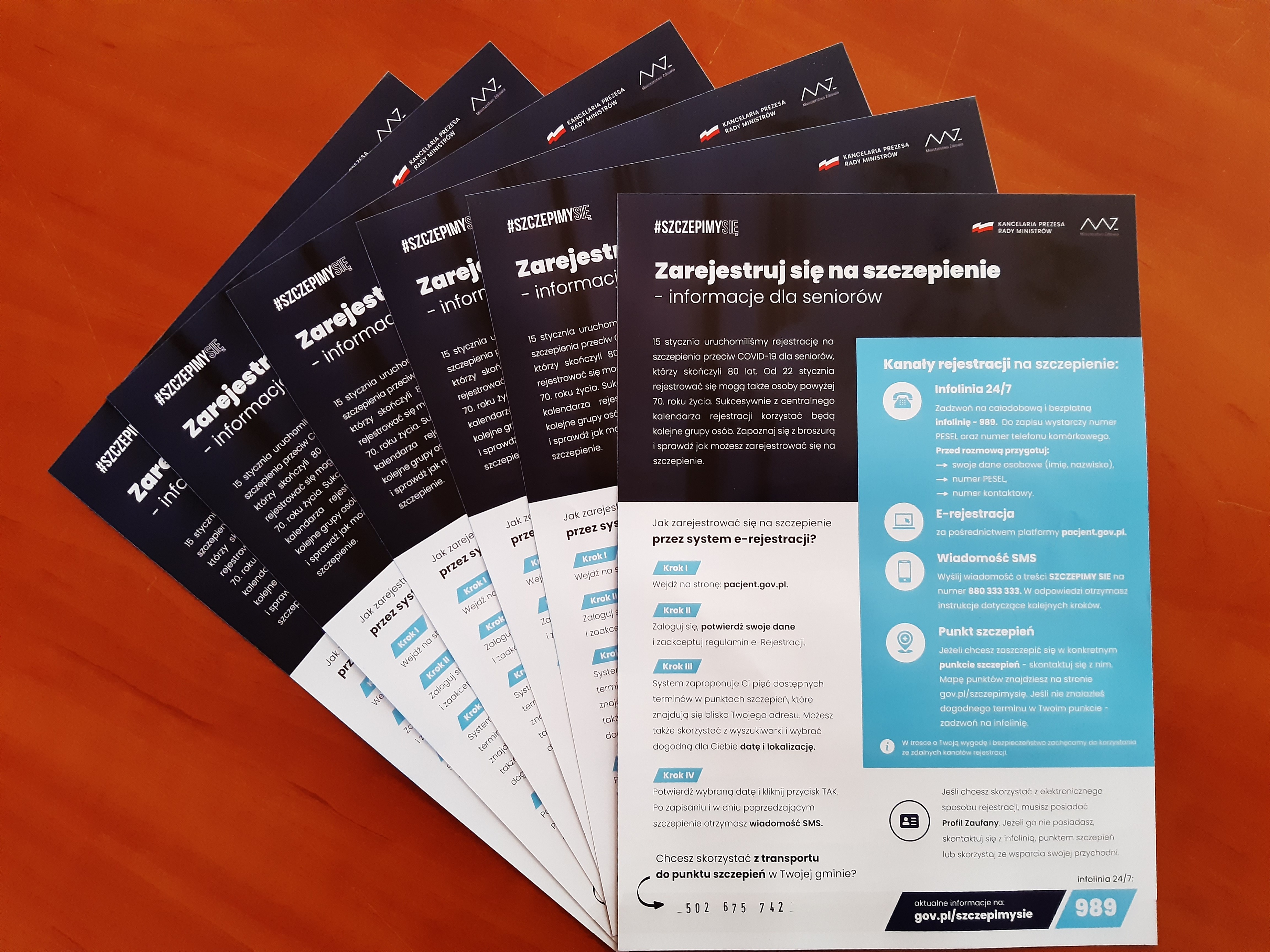 Przedmiotowe broszury mają przede wszystkim trafić do mieszkańców wykluczonych cyfrowo, którzy nie korzystają z zasobów internetu, często są samotni. Na ulotkach znajdziemy informacje jak zapisać się na szczepienie.