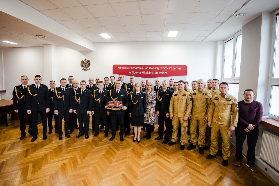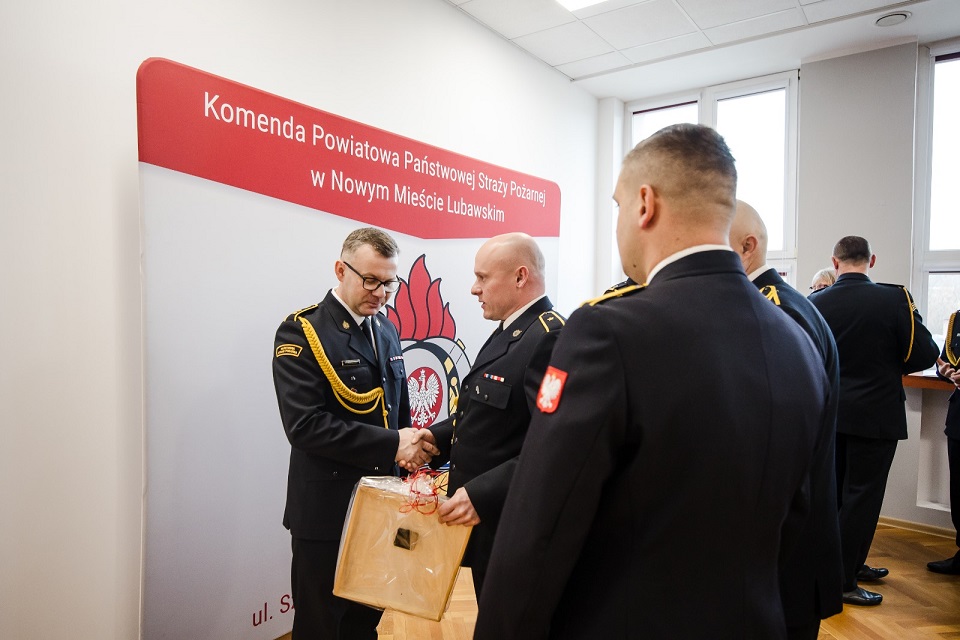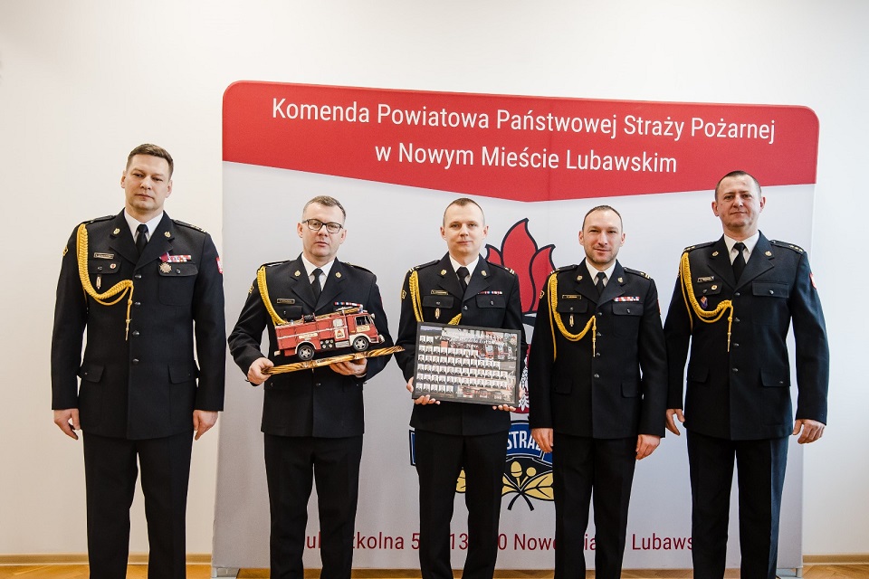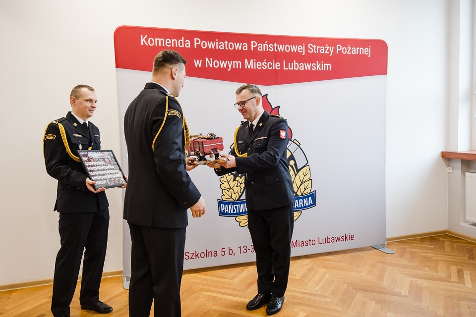 Podczas uroczystości st. asp. Robertowi Zdrojewskiemu towarzyszyli koleżanki i koledzy z nowomiejskiej Komendy, którzy wraz z Komendantem Powiatowym bryg. Krzysztofem Szałkowskim złożyli odchodzącemu funkcjonariuszowi życzenia oraz przekazali upominki na pamiątkę wspólnej służby w postaci tradycyjnego tablo i statuetki pojazdu pożarniczego.