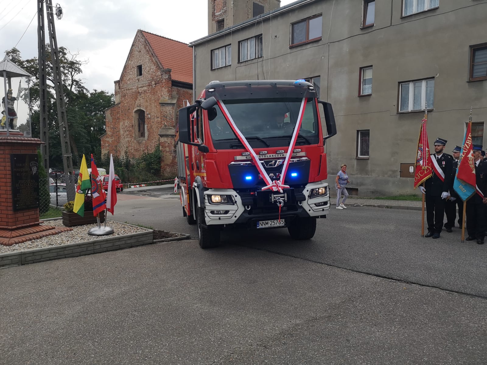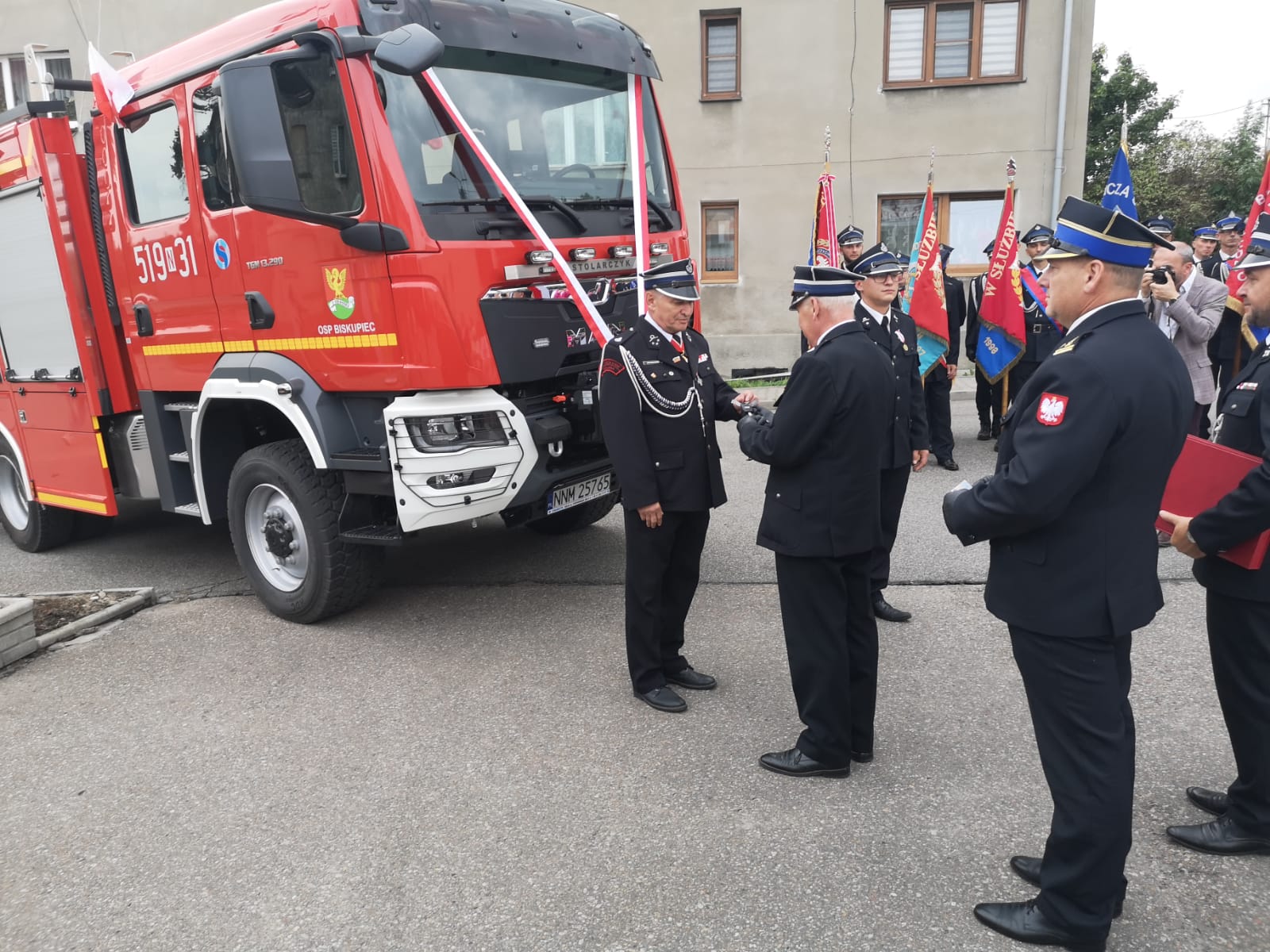 Uroczyste przekazanie samochodu pożarniczego jednostce OSP Biskupiec w pow. nowomiejskim – w uroczystości udział wziął zastępca komendanta wojewódzkiego PSP