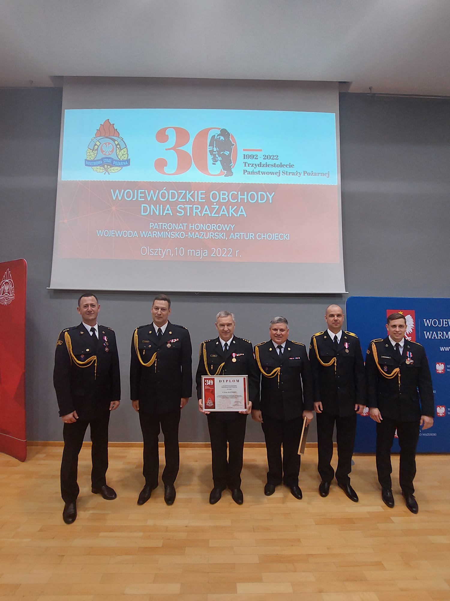 10 maja 2022 r. w Warmińsko-Mazurskim Urzędzie Wojewódzkim w Olsztynie odbyła się uroczystość jako główny punkt Wojewódzkich Obchodów Dnia Strażaka i jubileuszu 30-lecia Państwowej Straży Pożarnej. W obchodach wzięli udział: Pan Błażej Poboży - Podsekretarz Stanu w MSWiA, gen. brygadier Andrzej Bartkowiak - Komendant Główny Państwowej Straży Pożarnej, Pan Artur Chojecki - Wojewoda Warmińsko-Mazurski, Pani Sylwia Jaskulska - Wicemarszałek Województwa Warmińsko-Mazurskiego, nadbryg. Tomasz Komoszyński - Warmińsko-Mazurski Komendant Wojewódzki PSP, dh Grzegorz Matczyński – Dyrektor ZOW ZOSP RP, przedstawiciele Wojska Polskiego i Policji, byli komendanci wojewódzcy, a także komendanci miejscy i powiatowi PSP, odznaczeni i awansowani funkcjonariusze oraz przedstawiciele jednostek OSP.