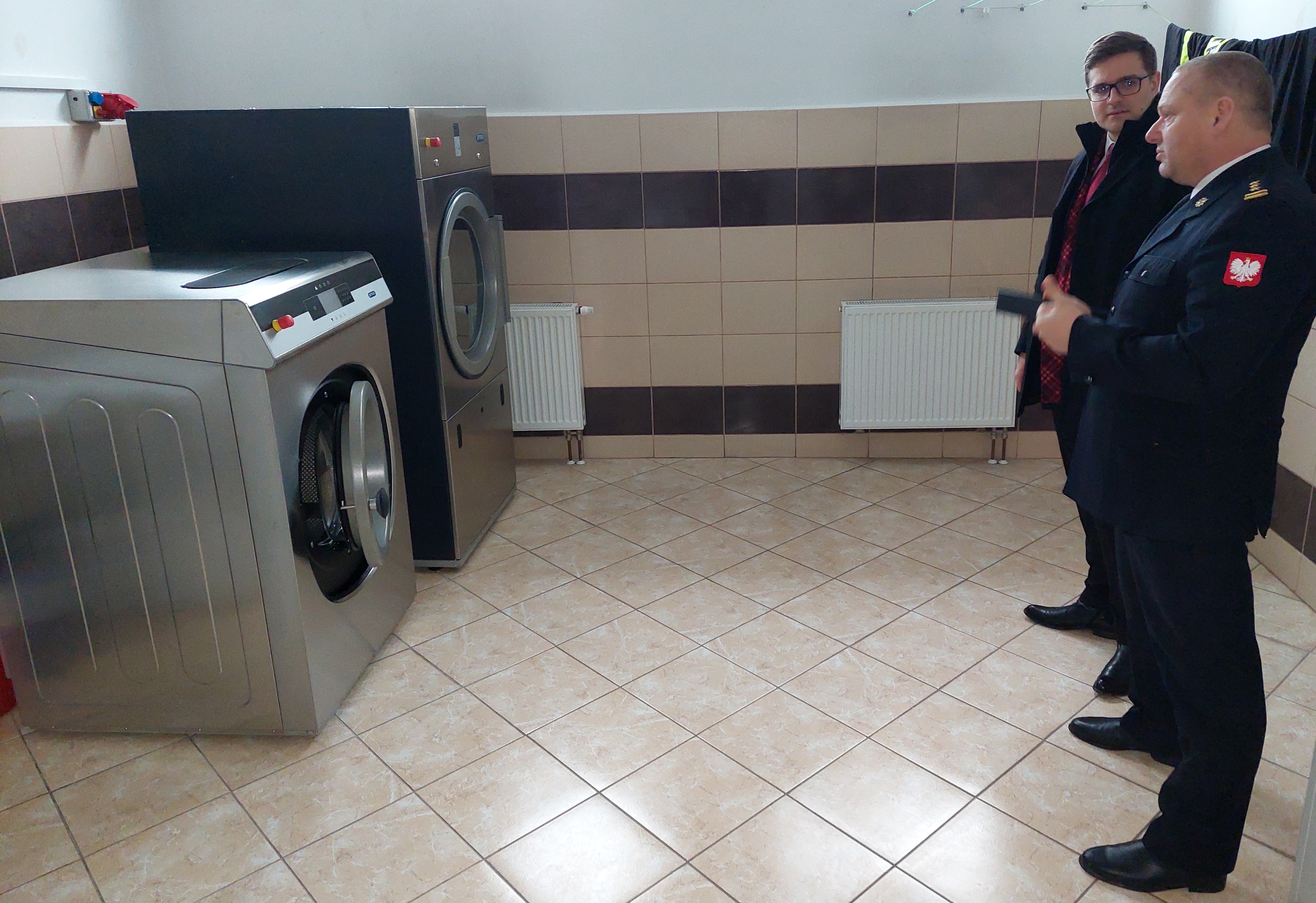 Podczas wizytacji Pan Robert Gontarz oraz st. bryg. Adam Jastrzębski dokonali przeglądu sprzętu i warunków lokalowych w tym nowo zakupionego lekkiego samochodu rozpoznawczo-ratowniczego MITSUBISHI L200 i pralnicy wraz z suszarką do prania i impregnacji ubrań specjalnych strażaków.